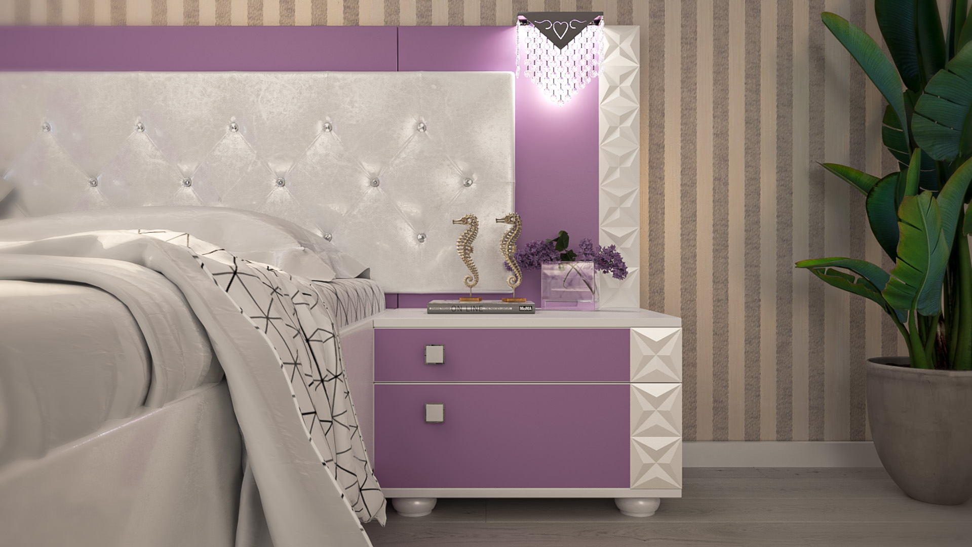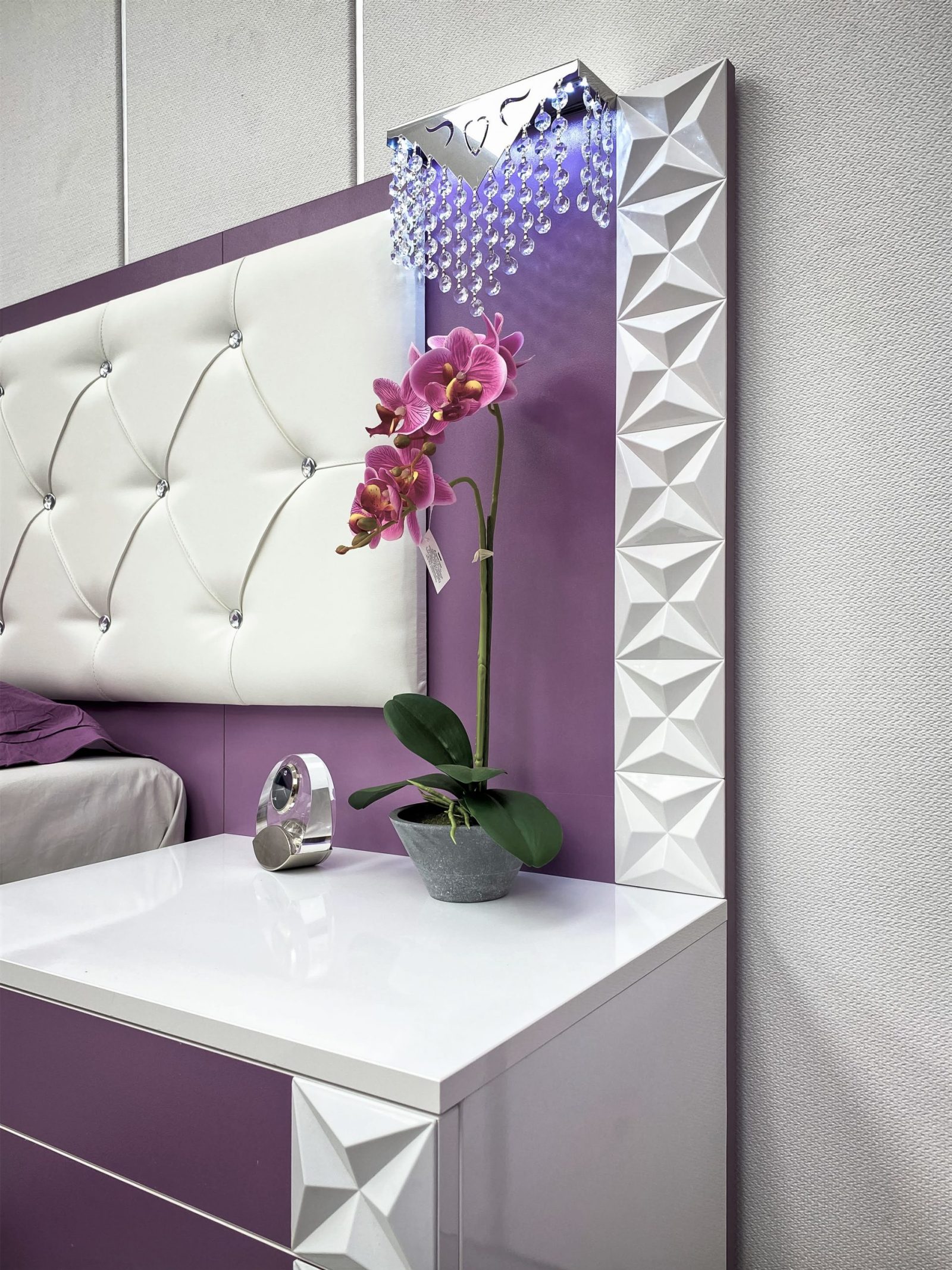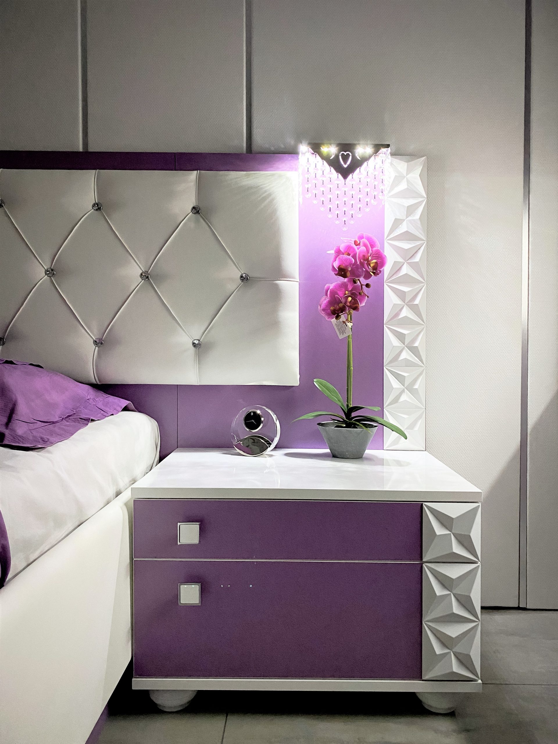 Легло: Eлегантна табла с фин капитонаж от еко кожа с висок клас на  износоустойчивост, цвят – снежно бял с акценти от прозрачен кристал и външен декоративен тигел – цвят снежно бял. База за матрак  с тапицерия от еко кожа с висока износоустойчивост , цвят – снежно бял, челната бленда  е с акценти от прозрачен бял кристал. Елегантни лампи с нежни кристали LED осветление – опция –  сензор с допир контрол.