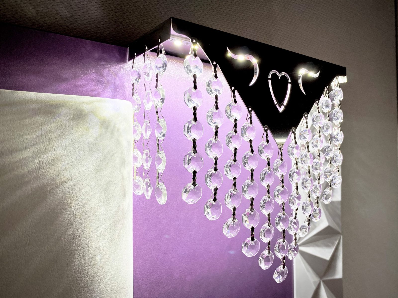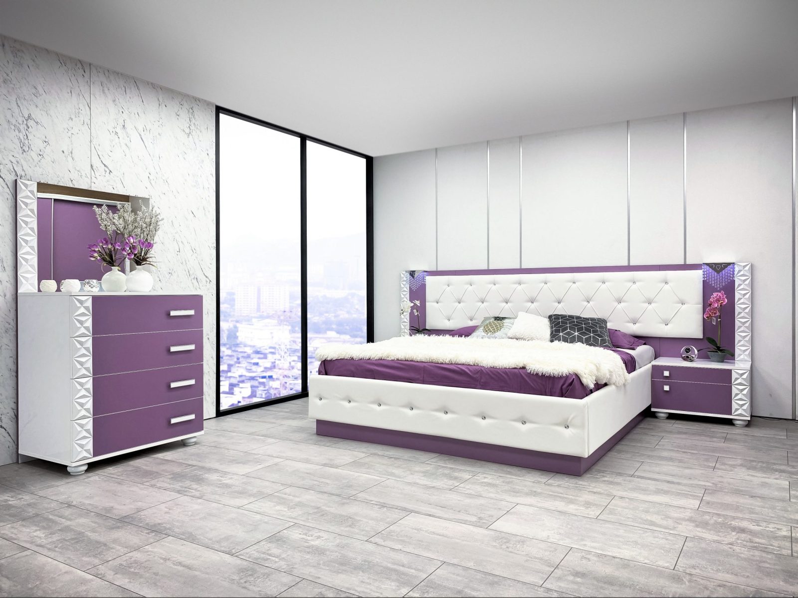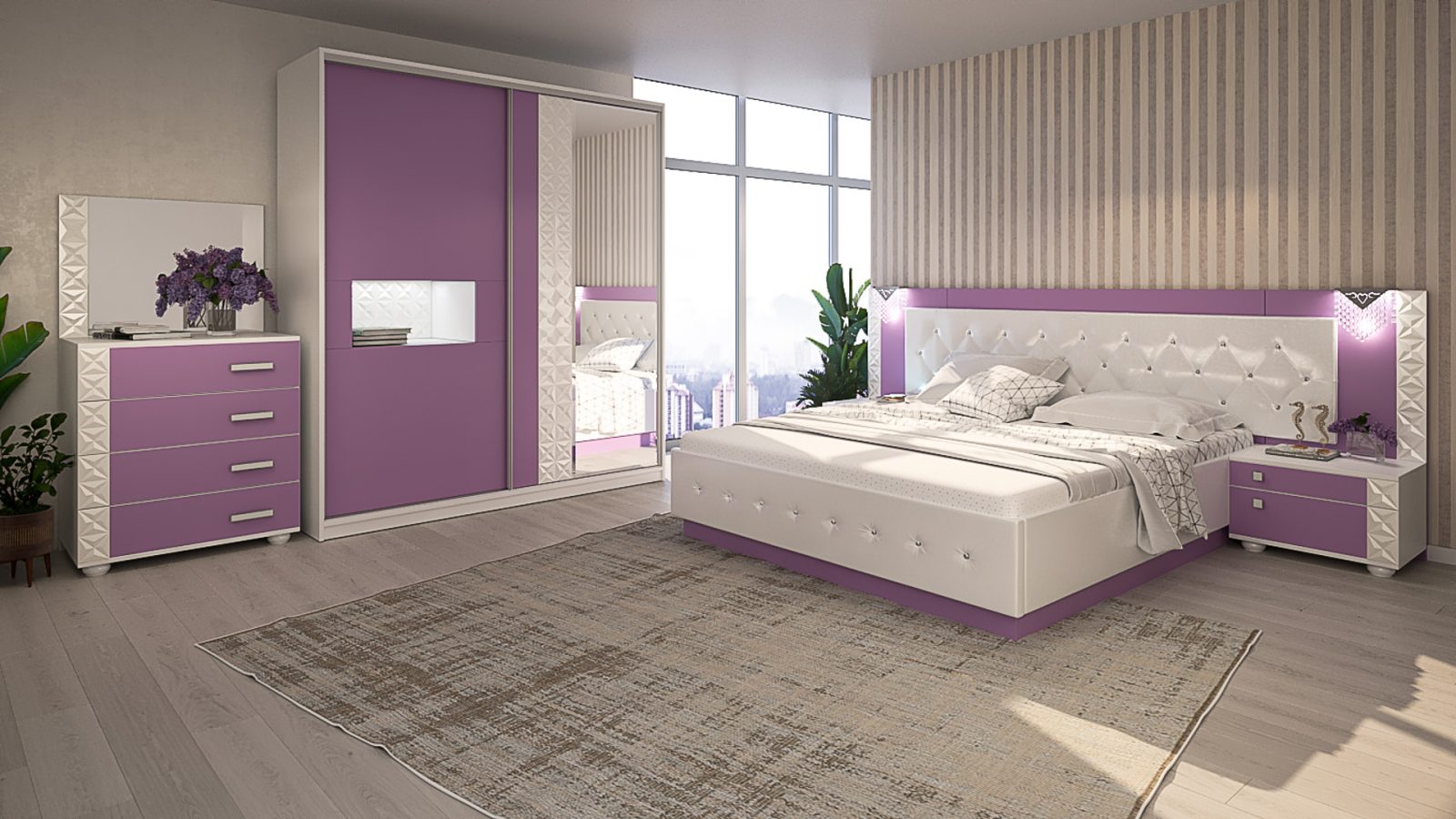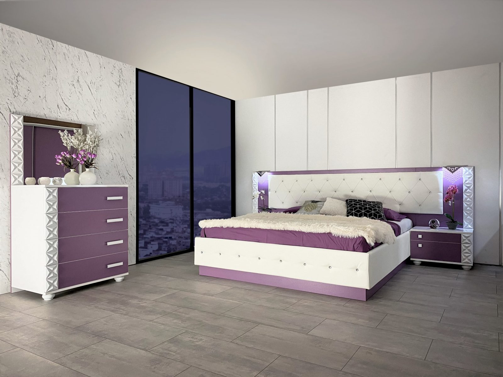 Легло: Eлегантна табла с фин капитонаж от еко кожа с висок клас на  износоустойчивост, цвят – снежно бял с акценти от прозрачен кристал и външен декоративен тигел – цвят снежно бял. База за матрак  с тапицерия от еко кожа с висока износоустойчивост , цвят – снежно бял, челната бленда  е с акценти от прозрачен бял кристал. Елегантни лампи с нежни кристали LED осветление – опция –  сензор с допир контрол.