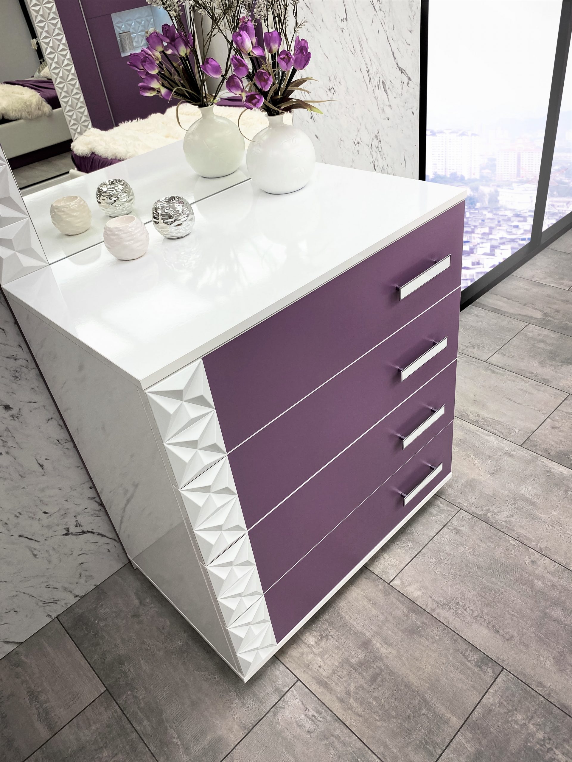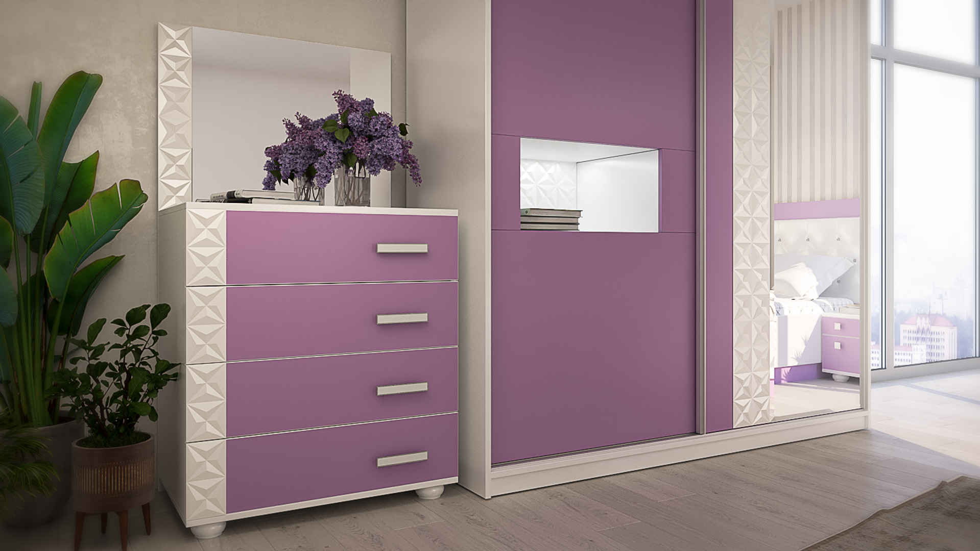 СК „Носталгия“ е произведен от основен декор – висококачествен бял гланц 18 мм, и допълнителен декор – виолетов мат;