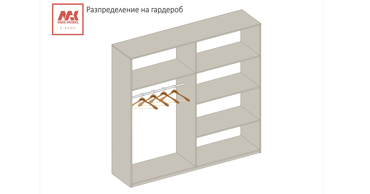 Гардероб: Плъзгаща система вътрешно водене, вертикално разположени вградени алуминиеви „П“- образни кант дръжки, с допълнително излят външен улей за лесно и удобно захващане, спомагащи ефективното плъзгане на системата и гарантиращи устойчивост и здравина на вратите; вградени огледала на цялата врата, използвани са сглобки за скрит монтаж, метални рафтоносачи за стабилност на рафтовете, лост за дрехи – метален с форма на елипса и покритие  никел. Цялата конструкция на гардероба е монтирана върху метални реглажни „пети“, осигуряващи изрядна нивелация на изделието за правилната му експлоатация, луксозни завършващи детайли от гланцови призми –  цвят – бял – 1 бр.