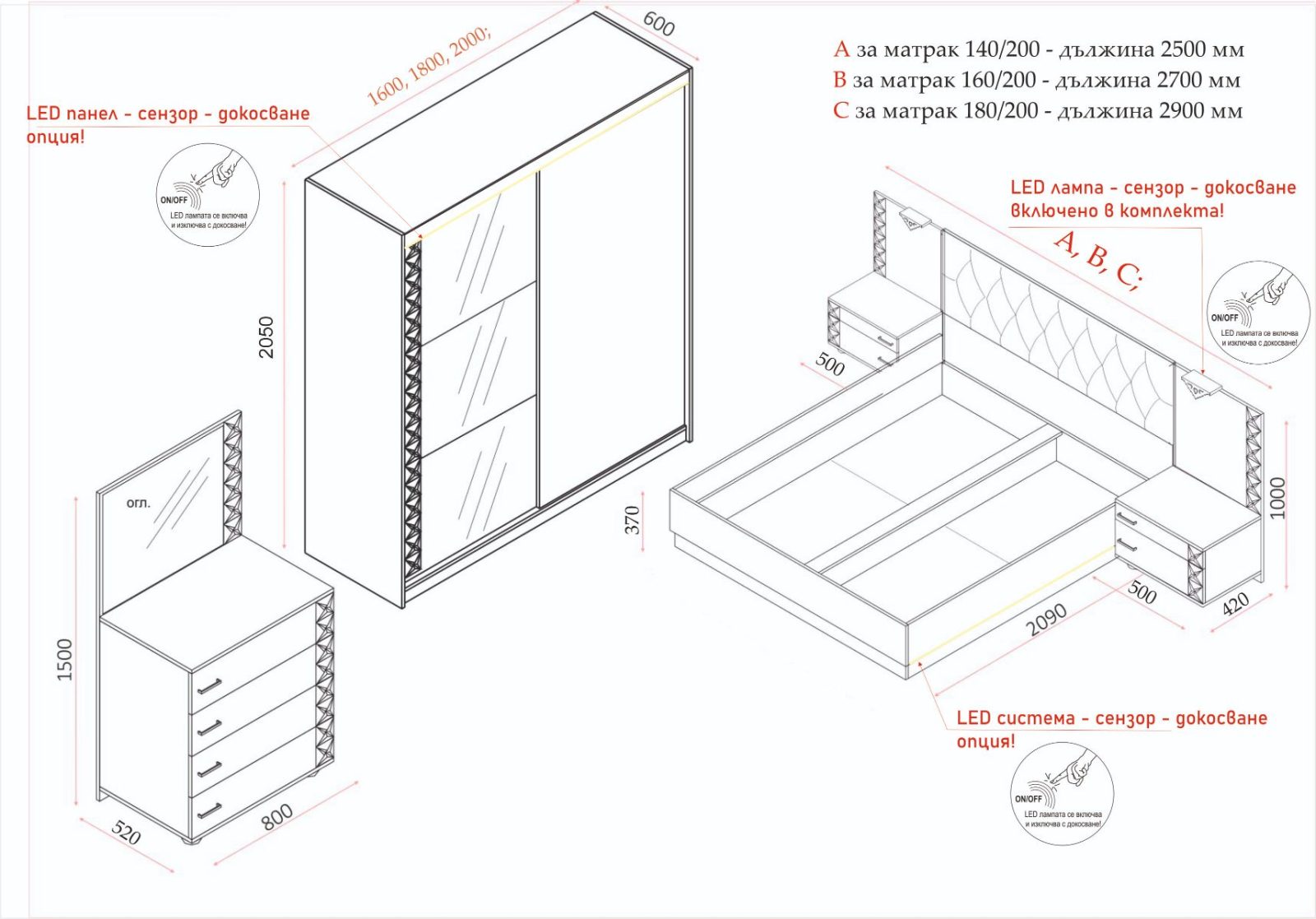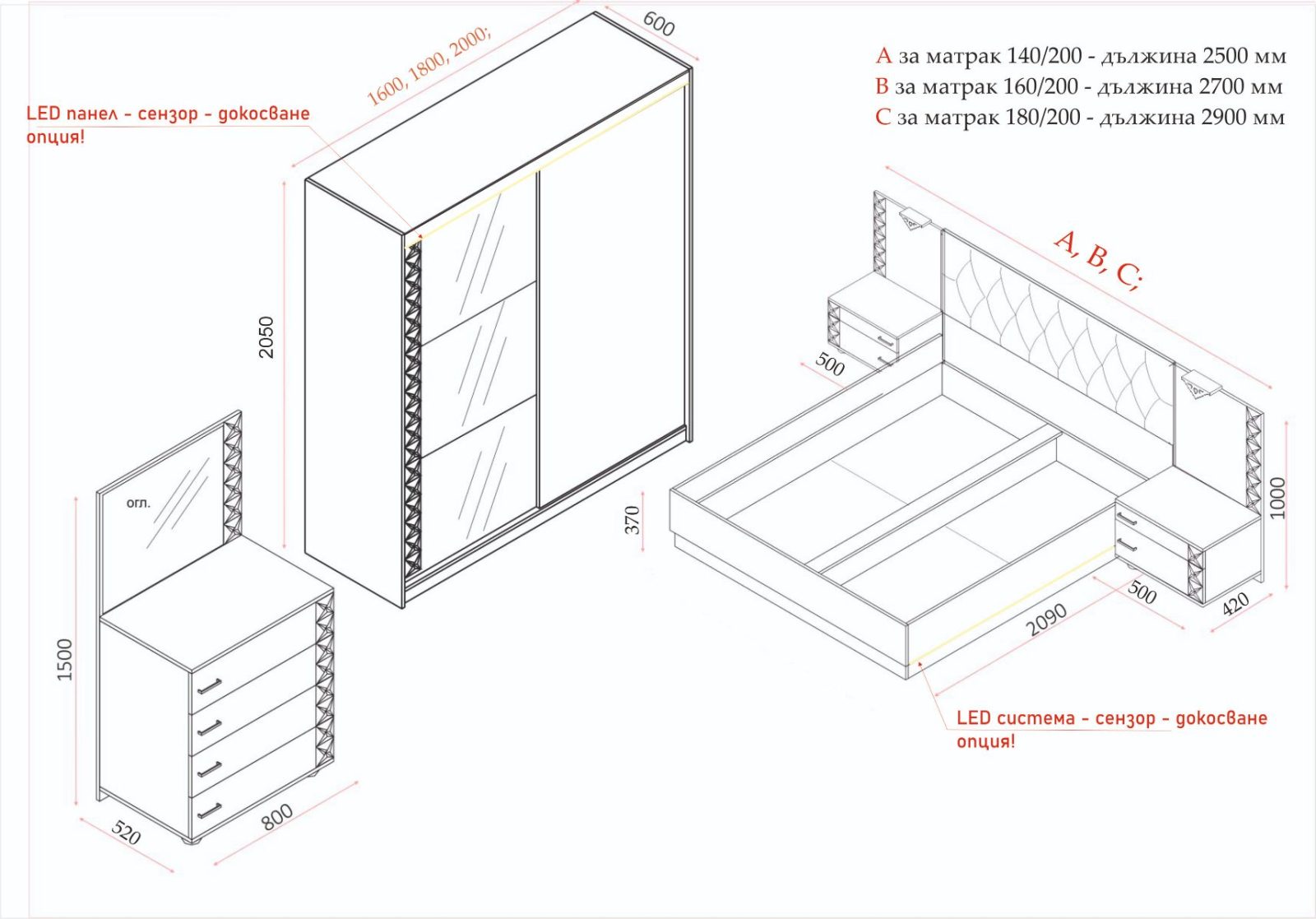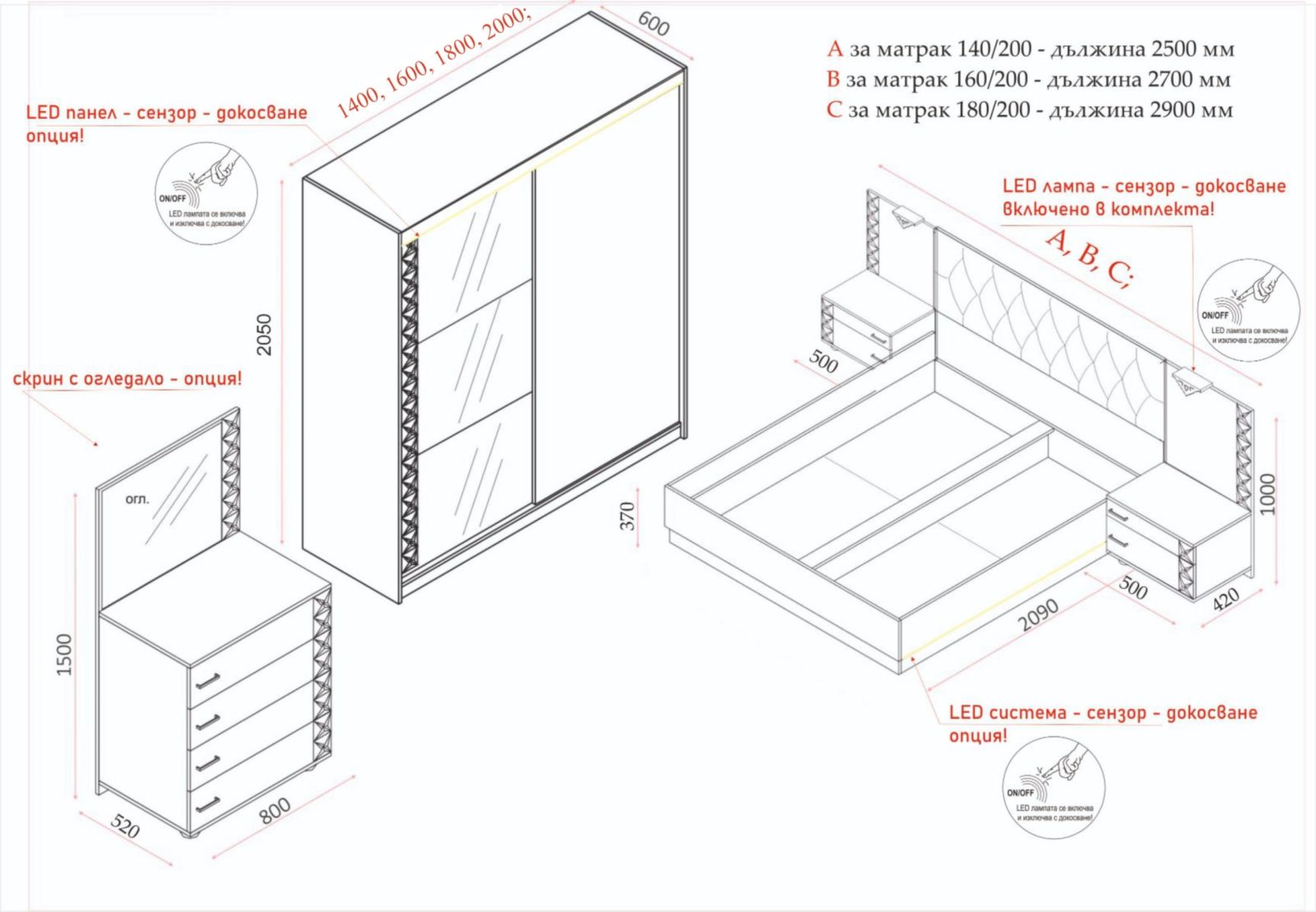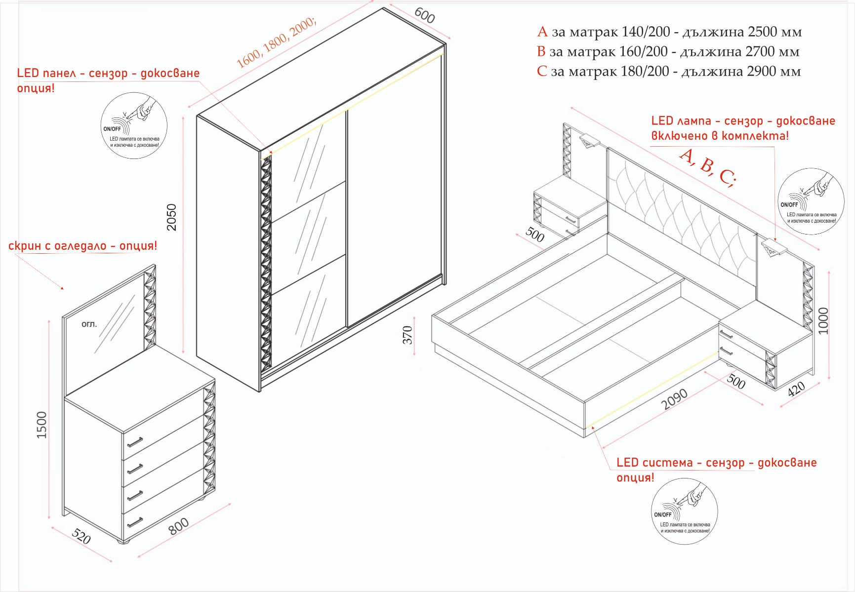 Гардероб: Плъзгаща система вътрешно водене, вертикално разположени вградени алуминиеви „П“- образни кант дръжки, с допълнително излят външен улей за лесно и удобно захващане, спомагащи ефективното плъзгане на системата и гарантиращи устойчивост и здравина на вратите; вградени огледала на цялата врата, използвани са сглобки за скрит монтаж, метални рафтоносачи за стабилност на рафтовете, лост за дрехи – метален с форма на елипса и покритие никел. Цялата конструкция на гардероба е монтирана върху метални реглажни „пети“, осигуряващи изрядна нивелация на изделието за правилната му експлоатация, луксозни завършващи детайли от гланцови призми – цвят – сребро – 1 бр.