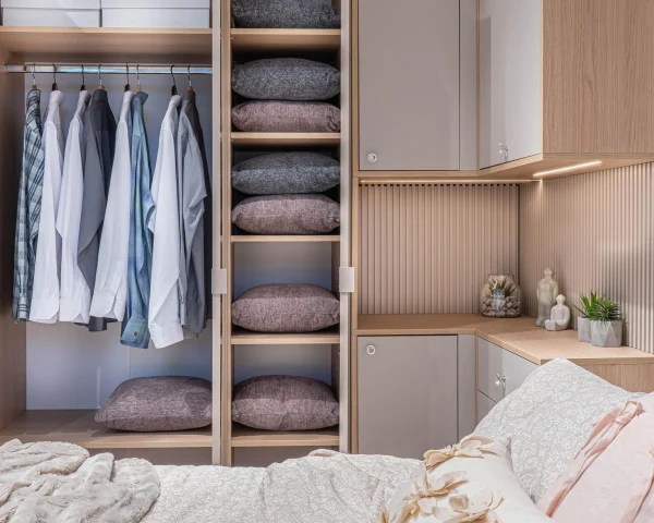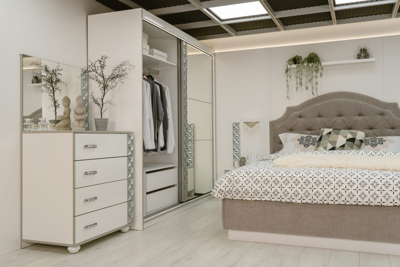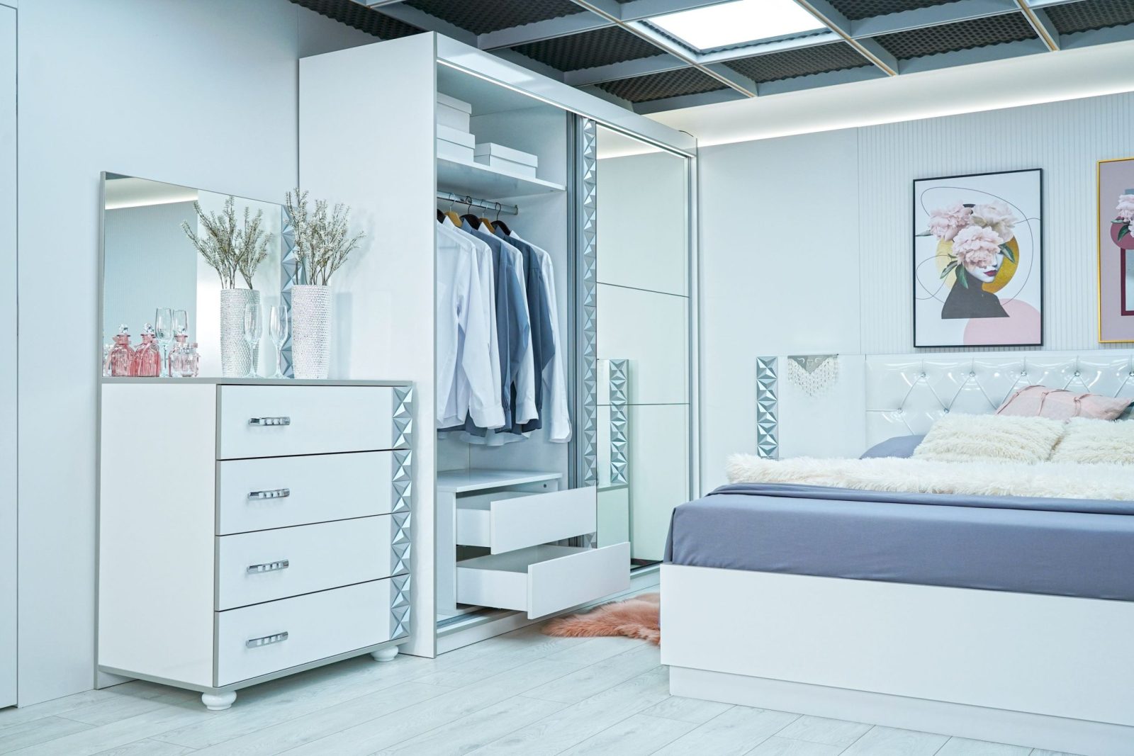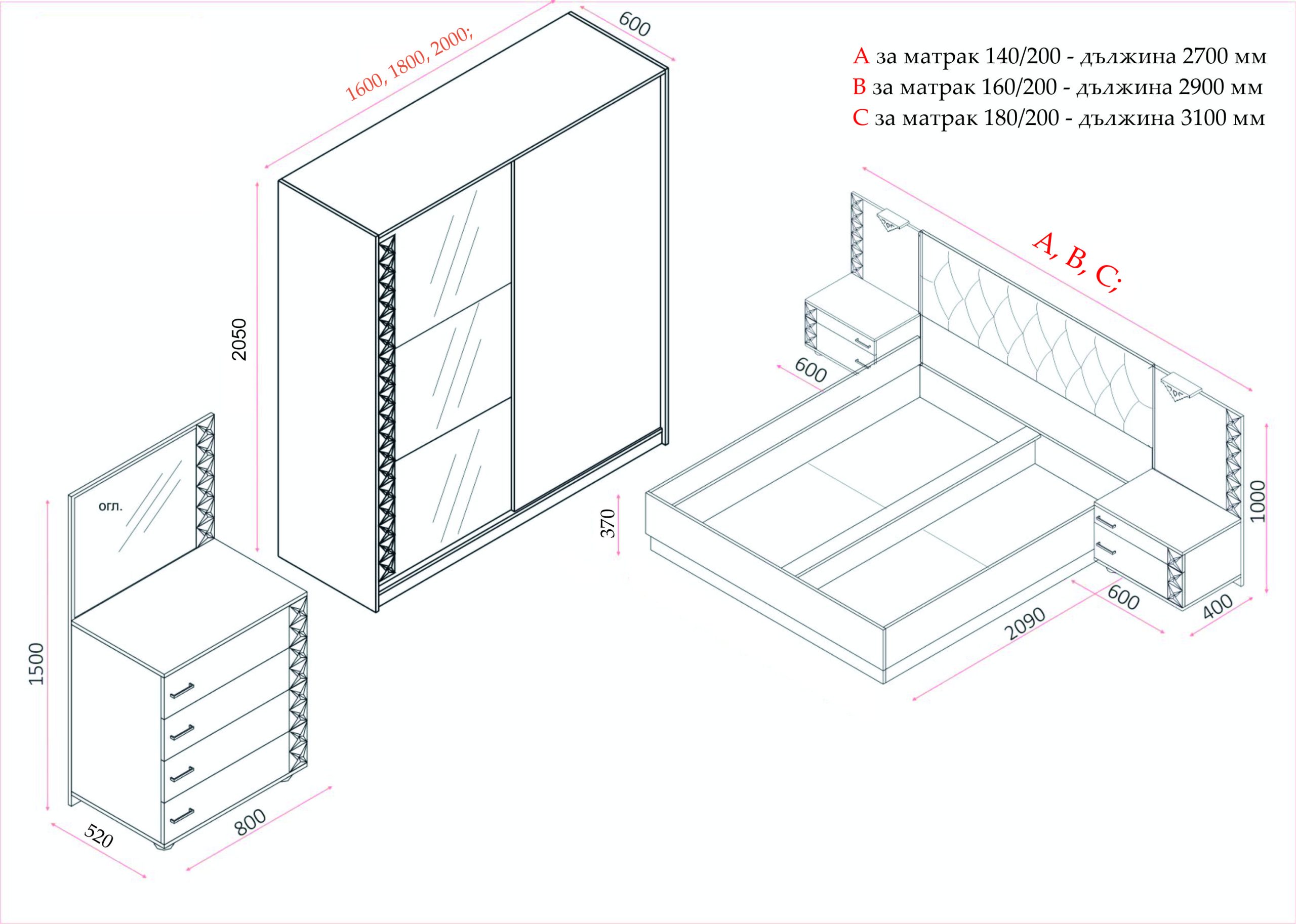 Гардероб: Плъзгаща система вътрешно водене, вертикално разположени вградени алуминиеви „П“- образни кант дръжки, с допълнително излят външен улей за лесно и удобно захващане, спомагащи ефективното плъзгане на системата и гарантиращи устойчивост и здравина на вратите; вградени огледала на цялата врата, използвани са сглобки за скрит монтаж, метални рафтоносачи за стабилност на рафтовете, лост за дрехи – метален с форма на елипса и покритие никел. Цялата конструкция на гардероба е монтирана върху метални реглажни „пети“, осигуряващи изрядна нивелация на изделието за правилната му експлоатация, луксозни завършващи детайли от гланцови призми – цвят – сребро – 1 бр.