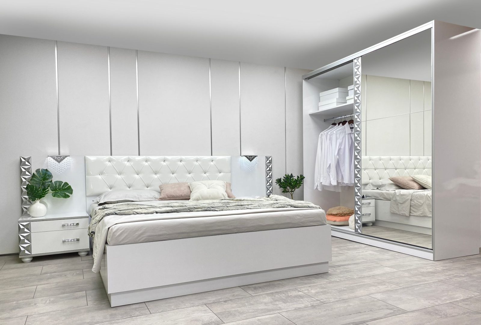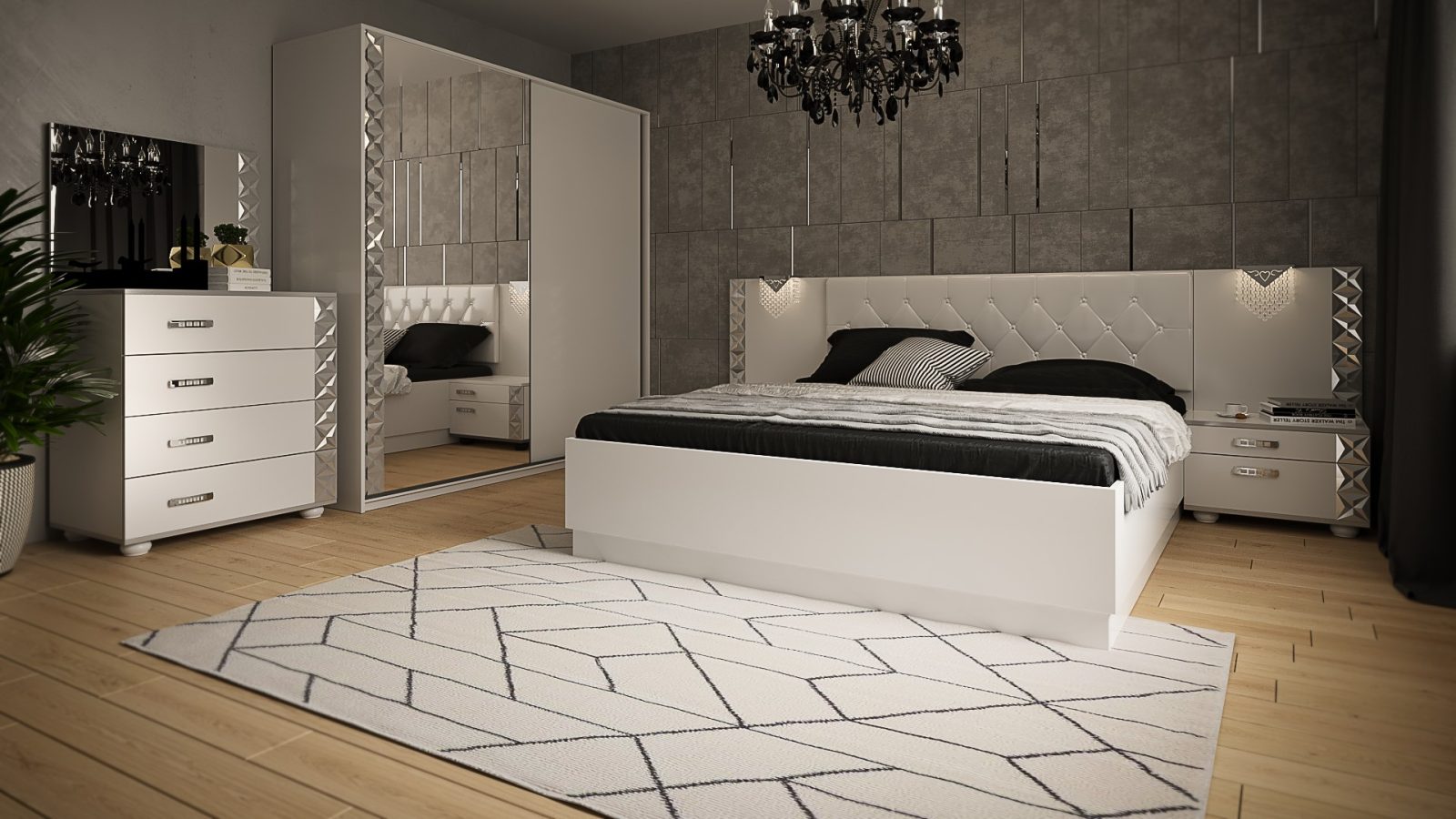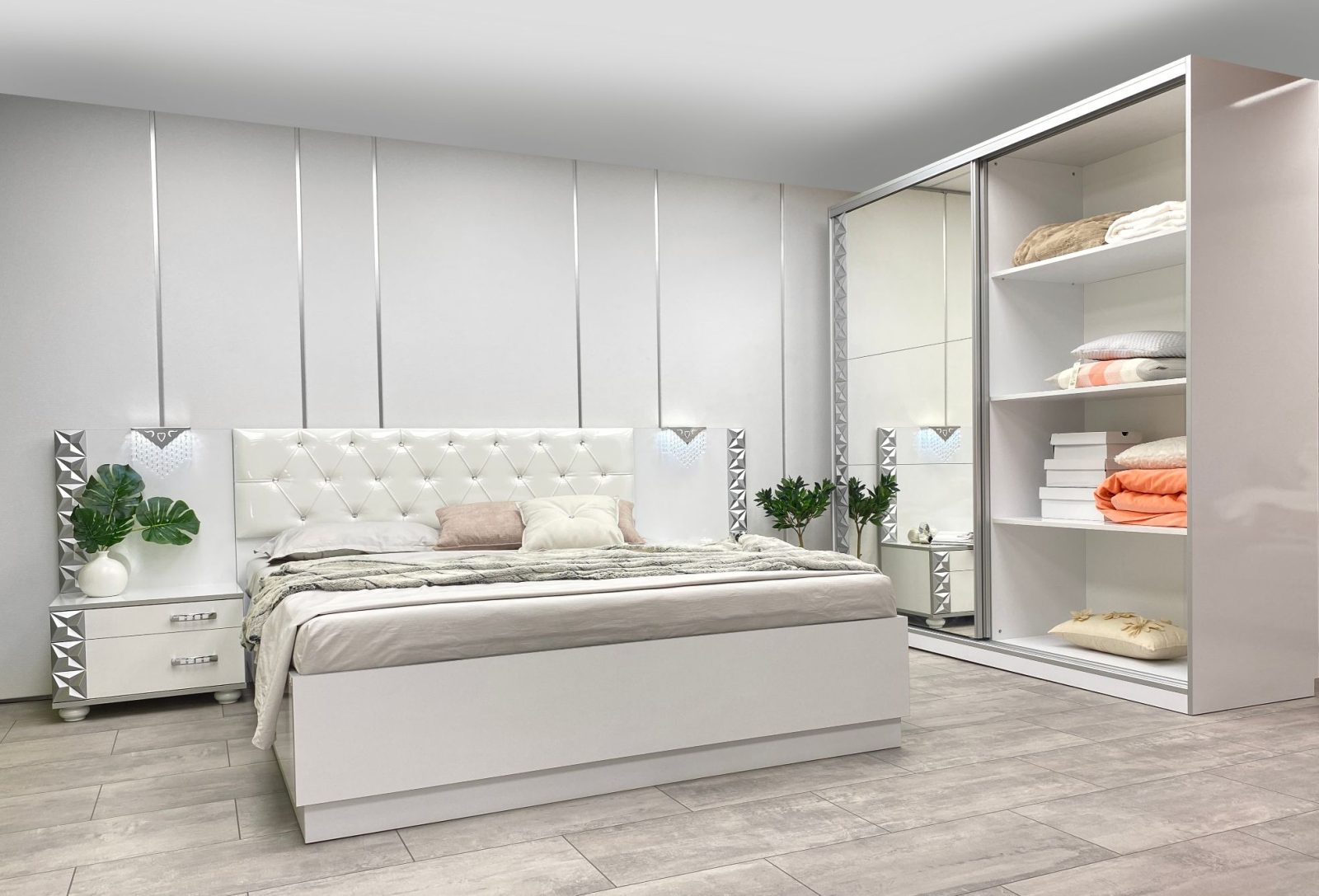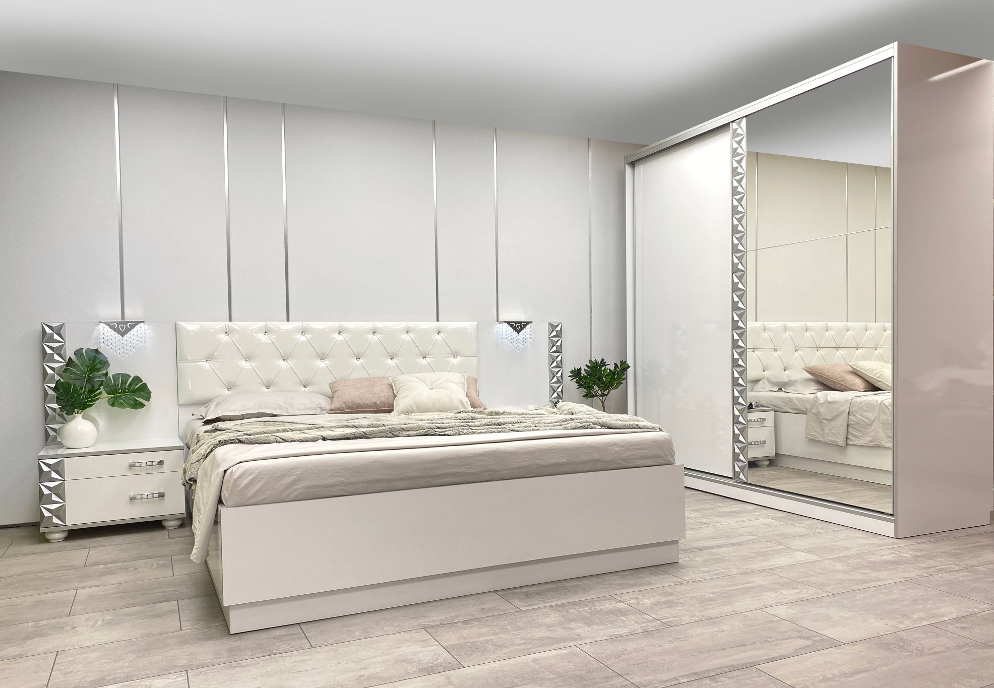 Легло: Основна табла с вградена тапицирана елегантна табла с единичен лицев шев в изпълнение тип „Капитонаж“ от висок клас износоустойчива еко кожа, цвят – бял – покритие гланцов лак, с акценти от бял прозрачен кристал. Заработен вътрешен мост за допълнителна устойчивост и здравина на леглото. Всички използвани сглобки са метални – скрит монтаж.