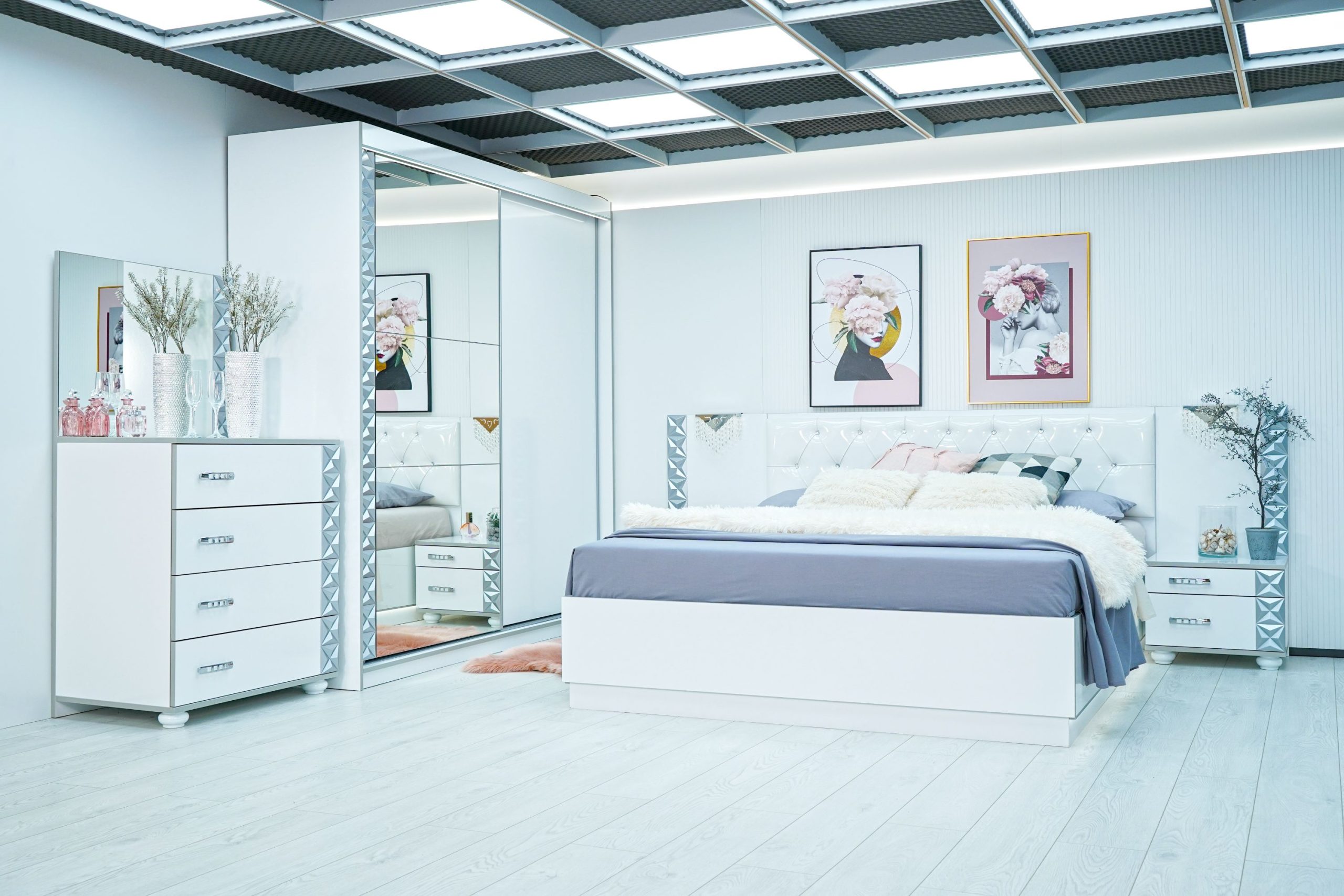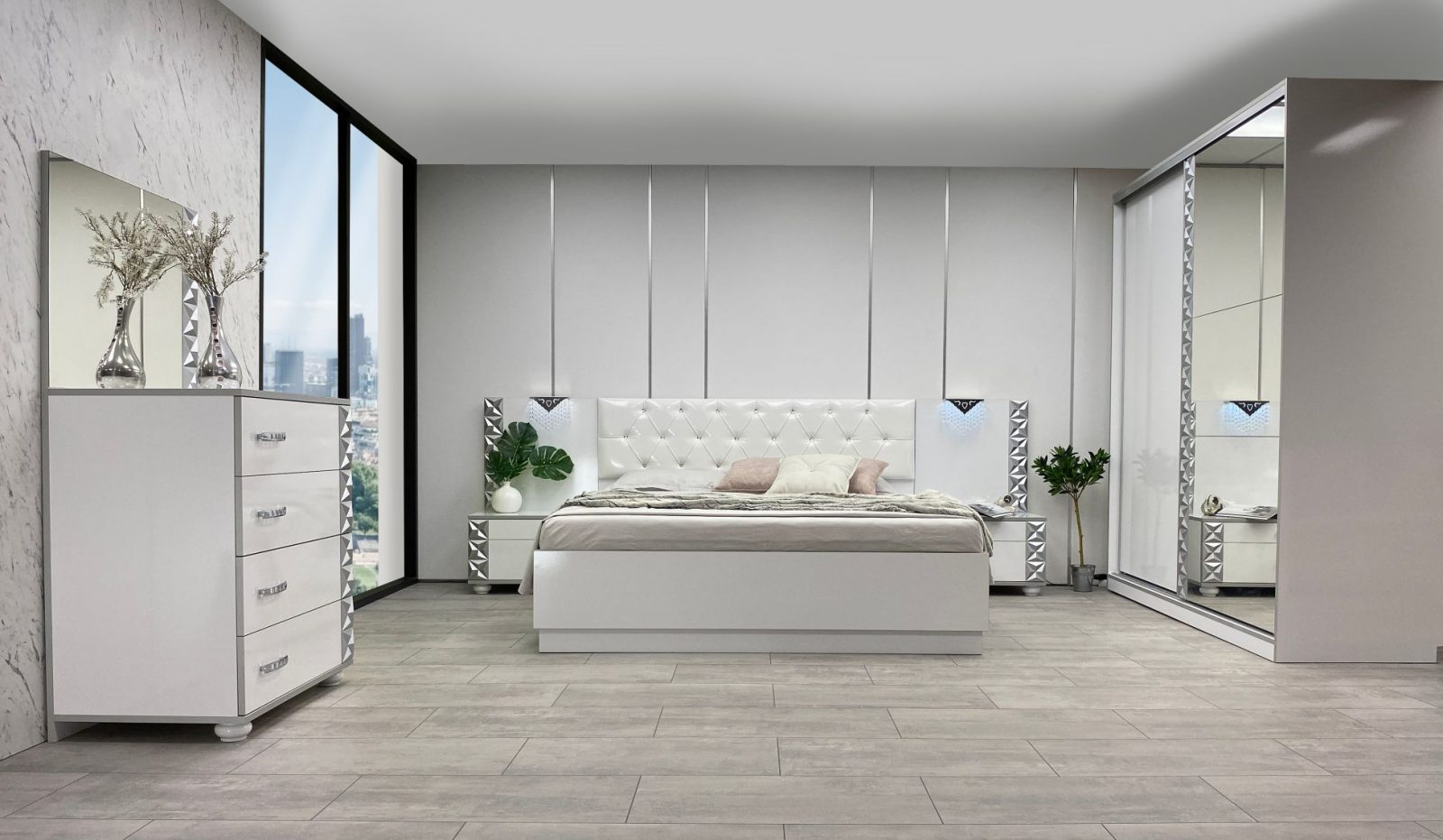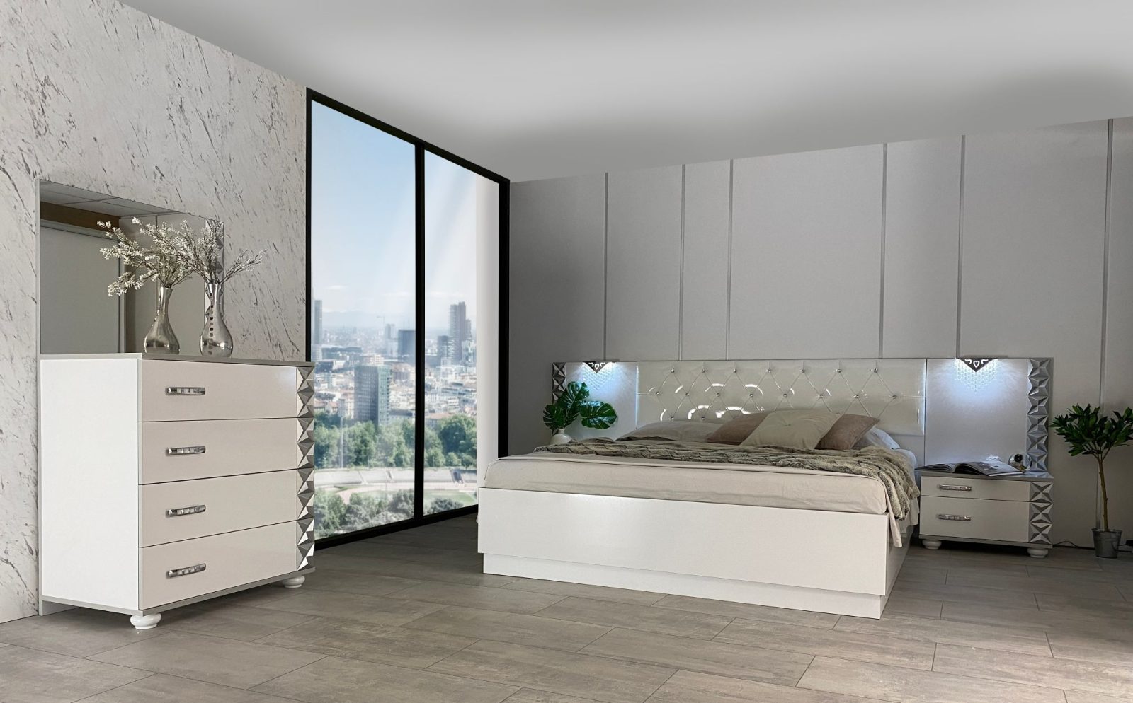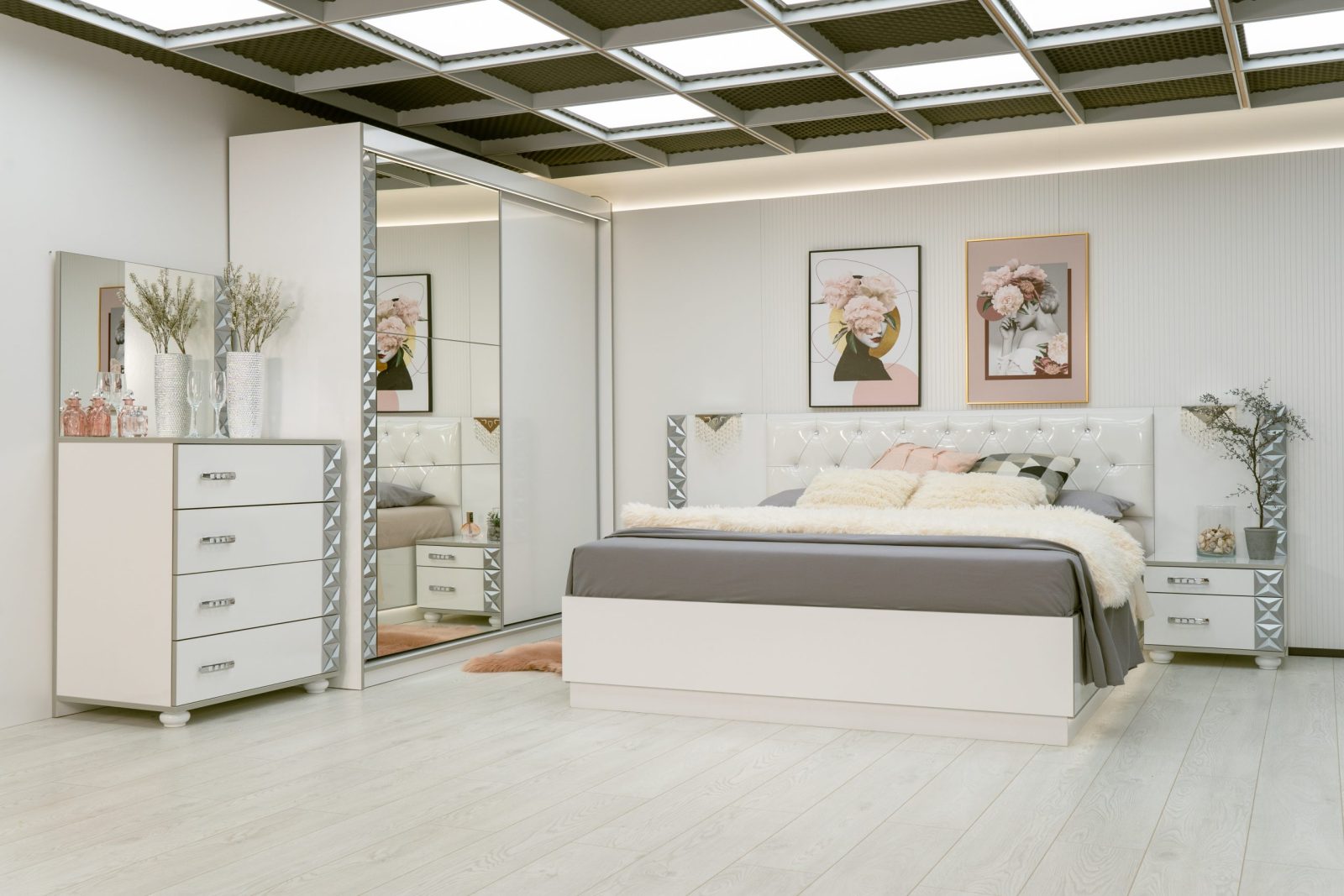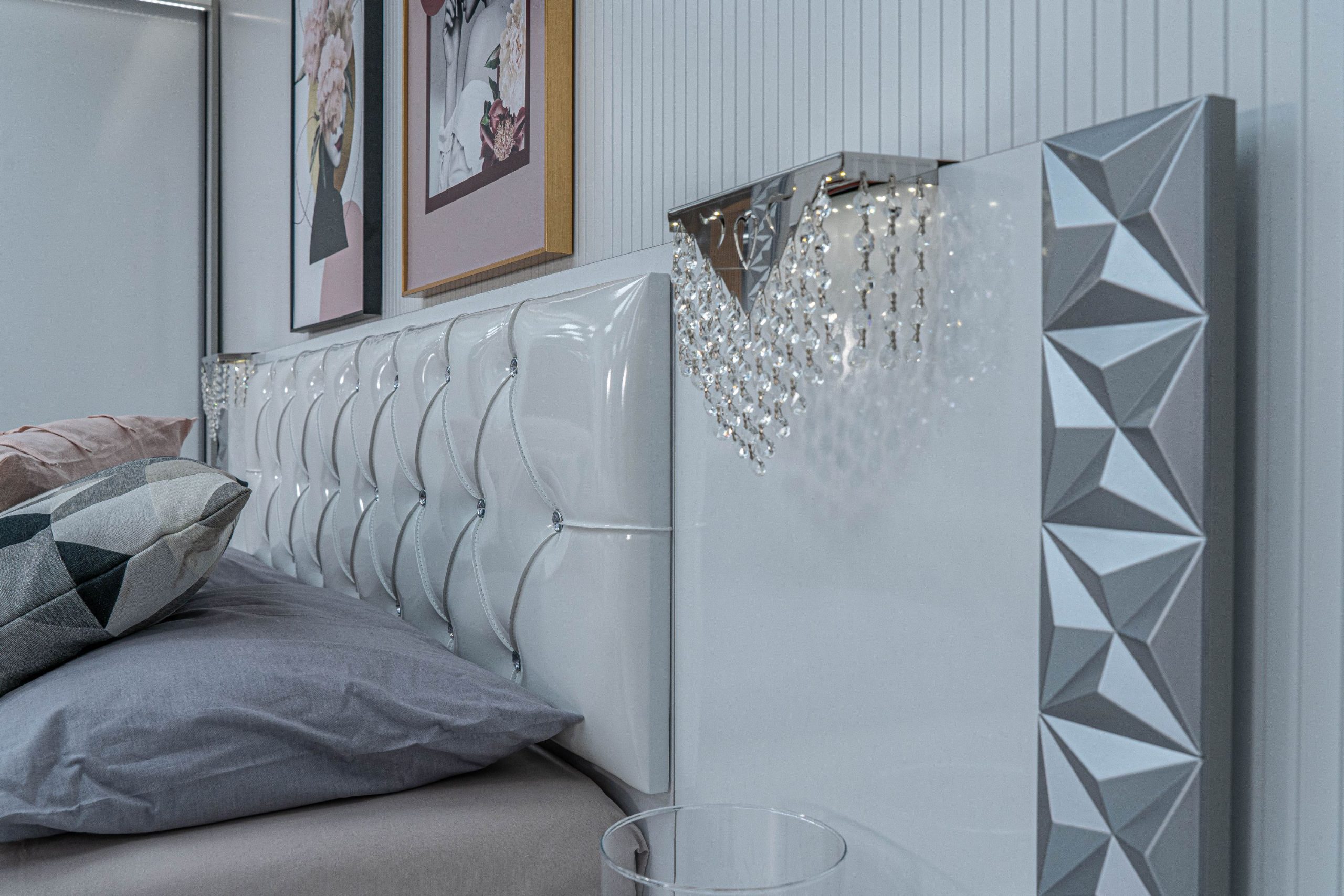 Легло: Основна табла с вградена тапицирана елегантна табла с единичен лицев шев в изпълнение тип „Капитонаж“ от висок клас износоустойчива еко кожа, цвят – бял – покритие гланцов лак, с акценти от бял прозрачен кристал. Заработен вътрешен мост за допълнителна устойчивост и здравина на леглото. Всички използвани сглобки са метални – скрит монтаж.