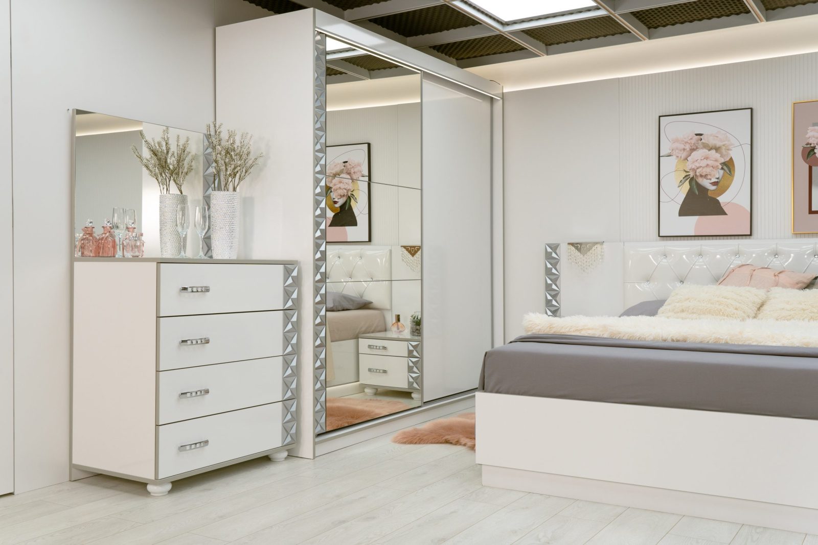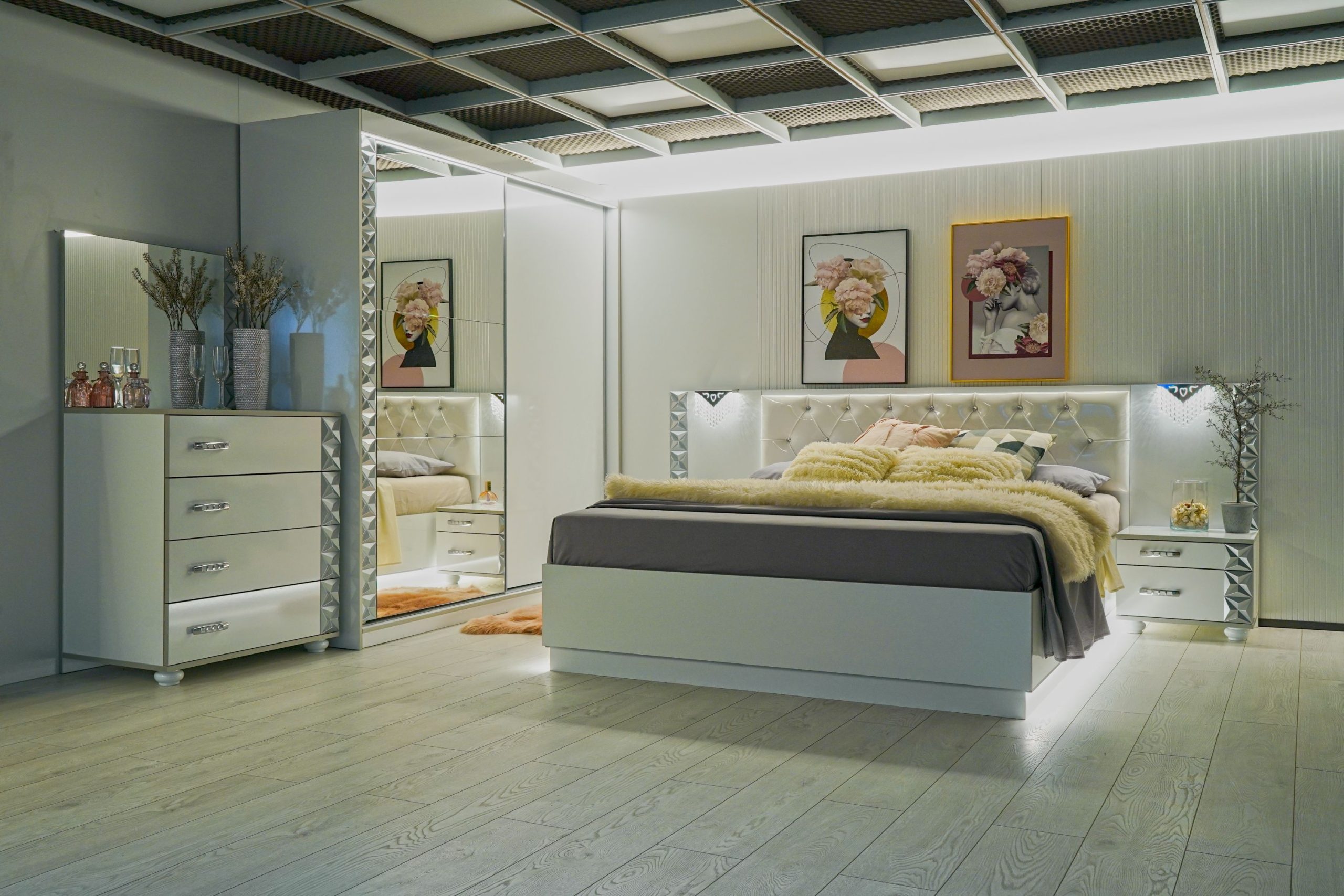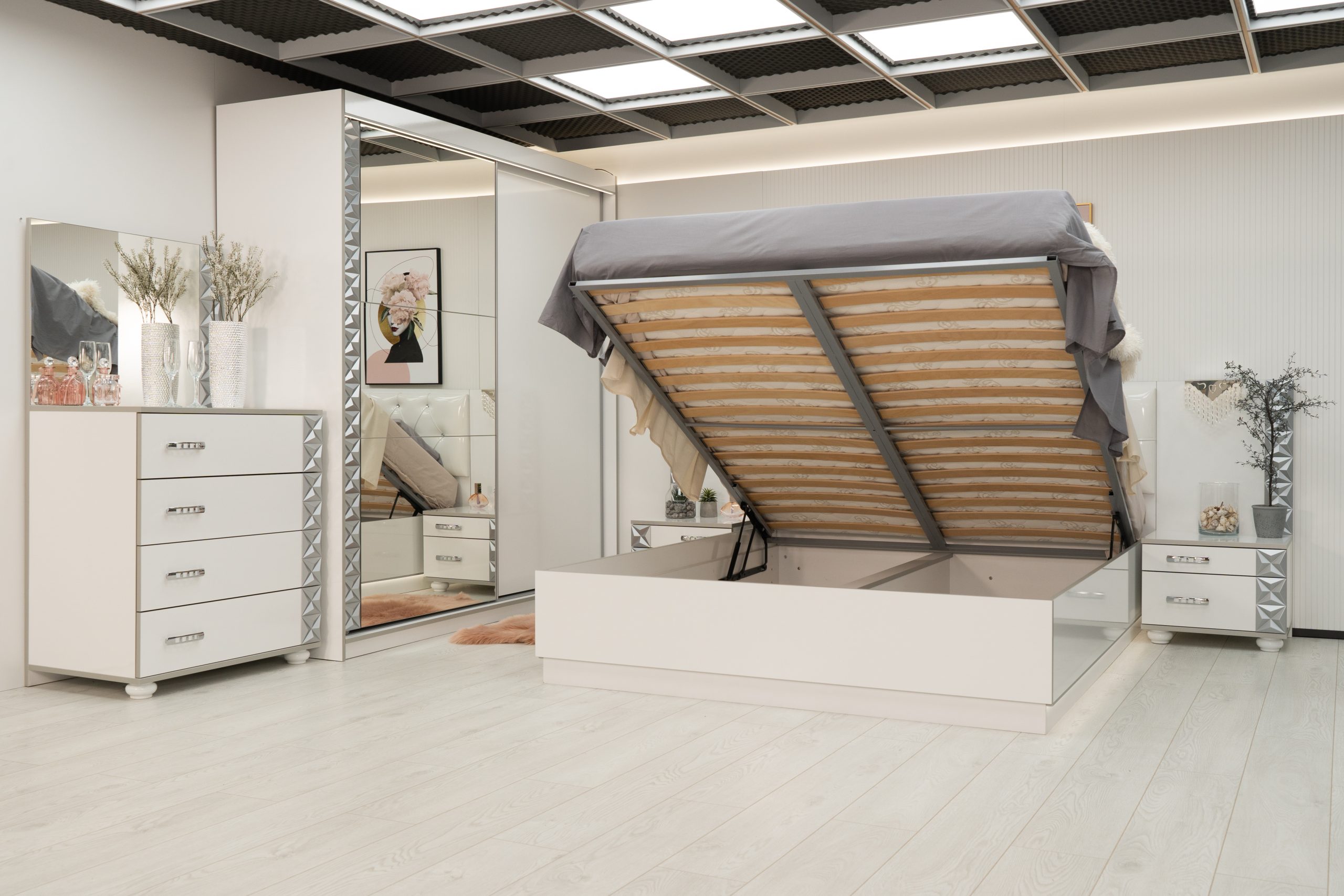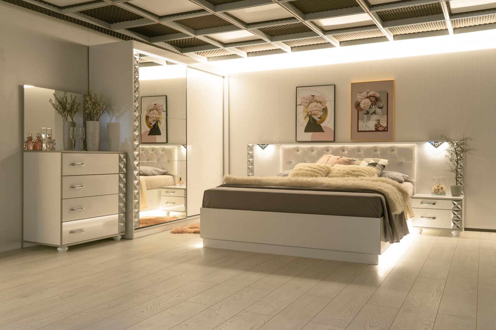 Легло: Основна табла с вградена тапицирана елегантна табла с единичен лицев шев в изпълнение тип „Капитонаж“ от висок клас износоустойчива еко кожа, цвят – бял – покритие гланцов лак, с акценти от бял прозрачен кристал. Заработен вътрешен мост за допълнителна устойчивост и здравина на леглото. Всички използвани сглобки са метални – скрит монтаж.