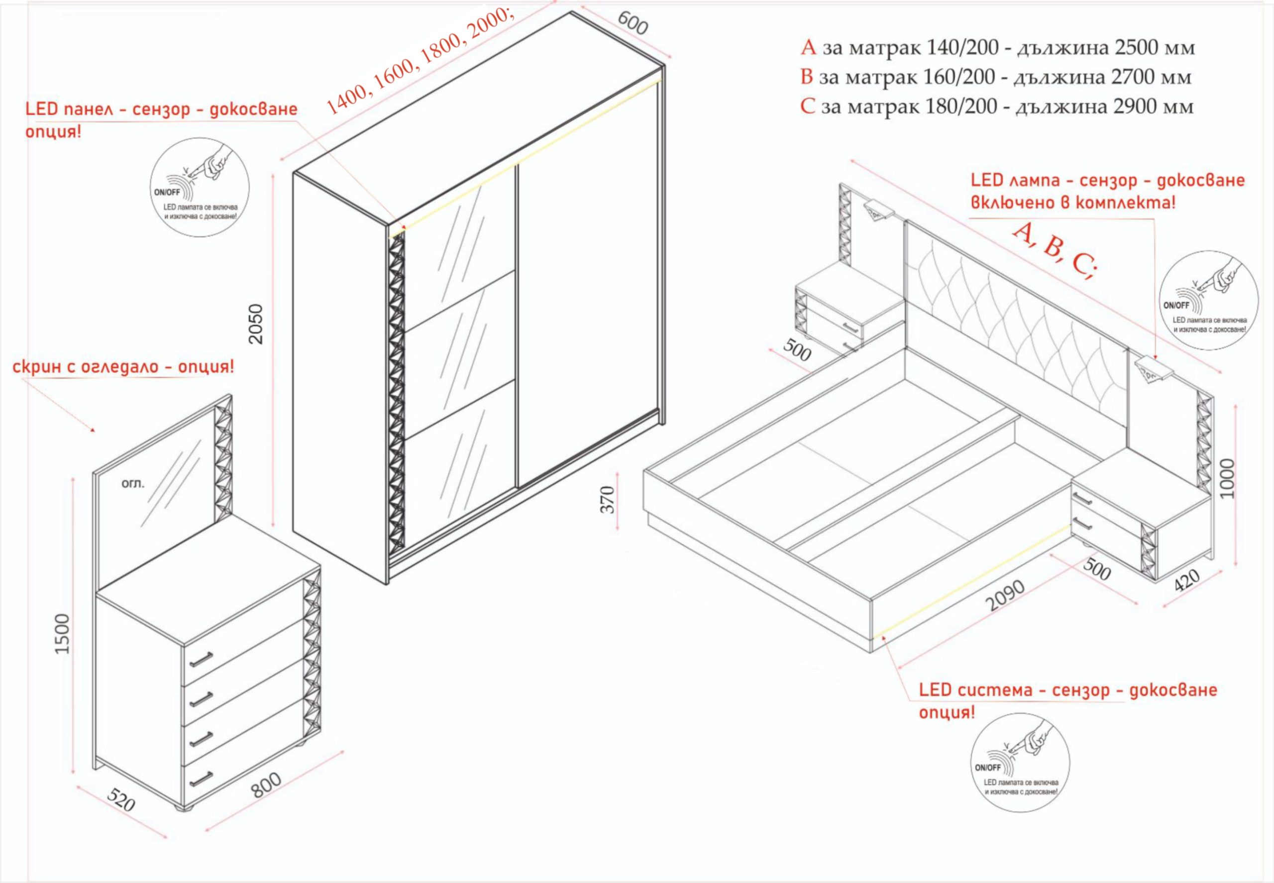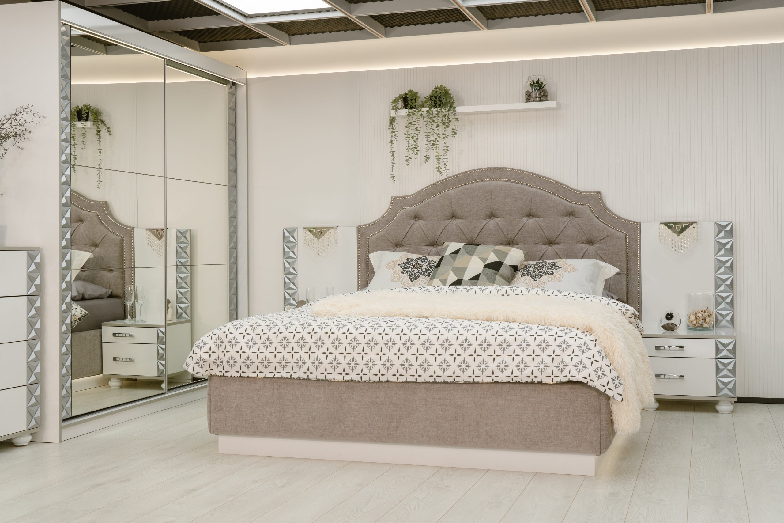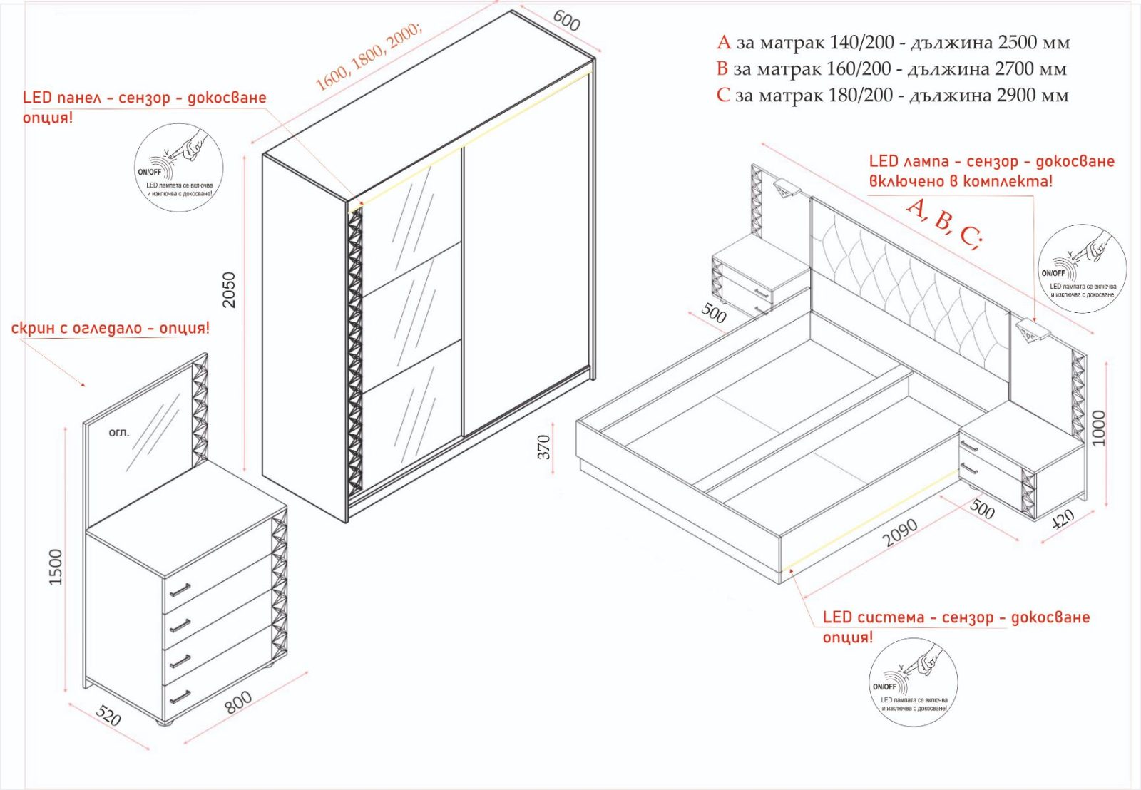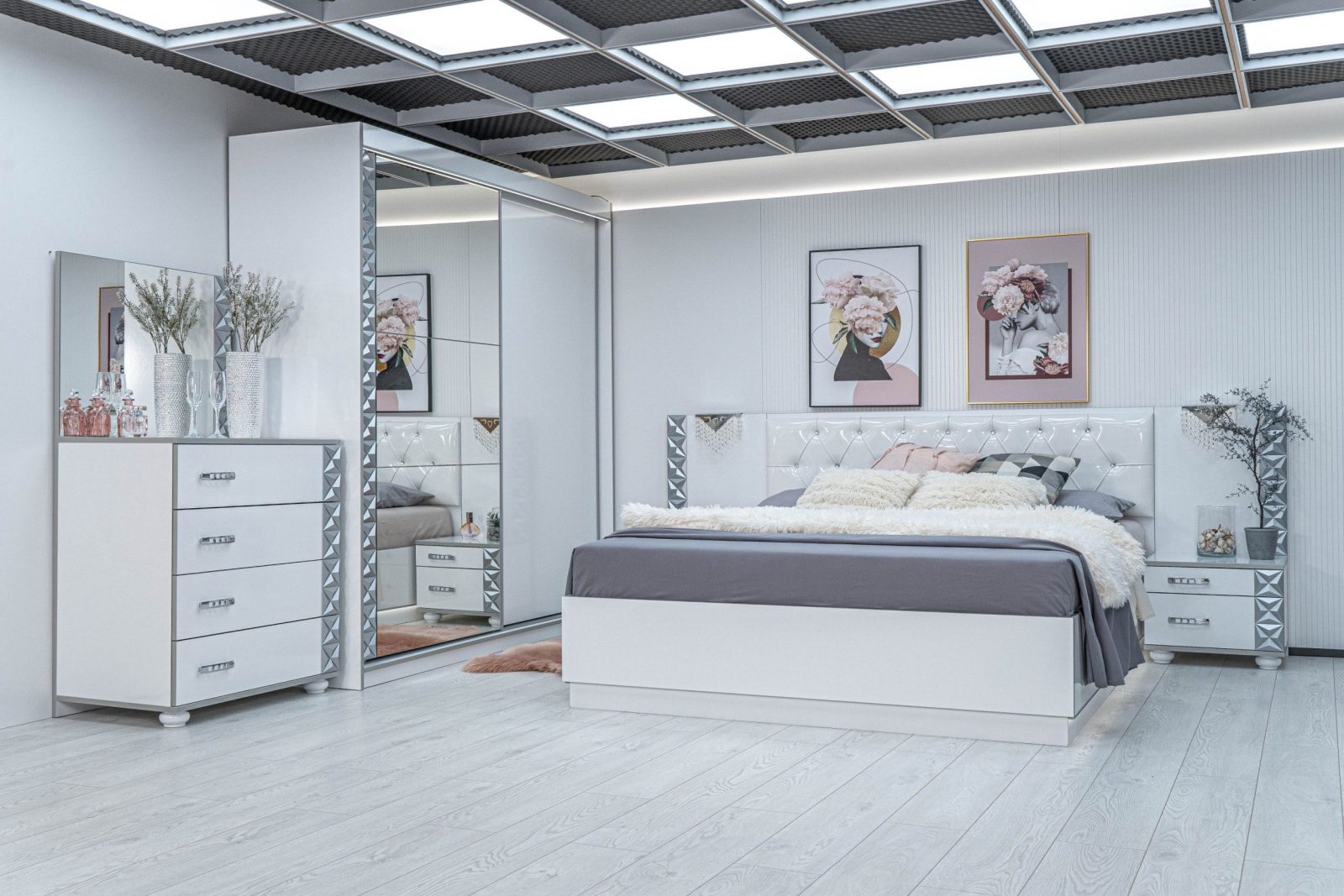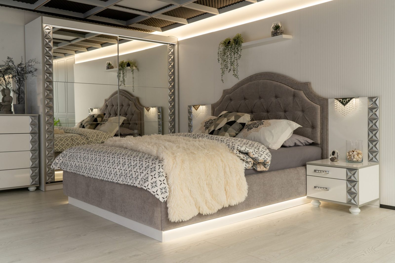 Легло: Основна табла с вградена тапицирана елегантна табла с единичен лицев шев в изпълнение тип „Капитонаж“ от висок клас износоустойчива еко кожа, цвят – бял – покритие гланцов лак, с акценти от бял прозрачен кристал. Заработен вътрешен мост за допълнителна устойчивост и здравина на леглото. Всички използвани сглобки са метални – скрит монтаж.