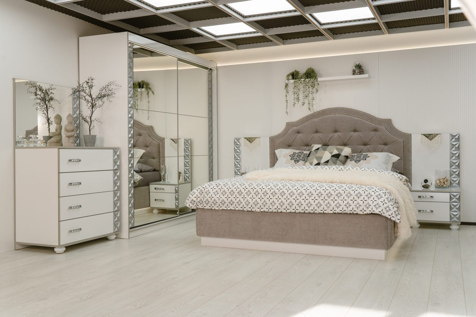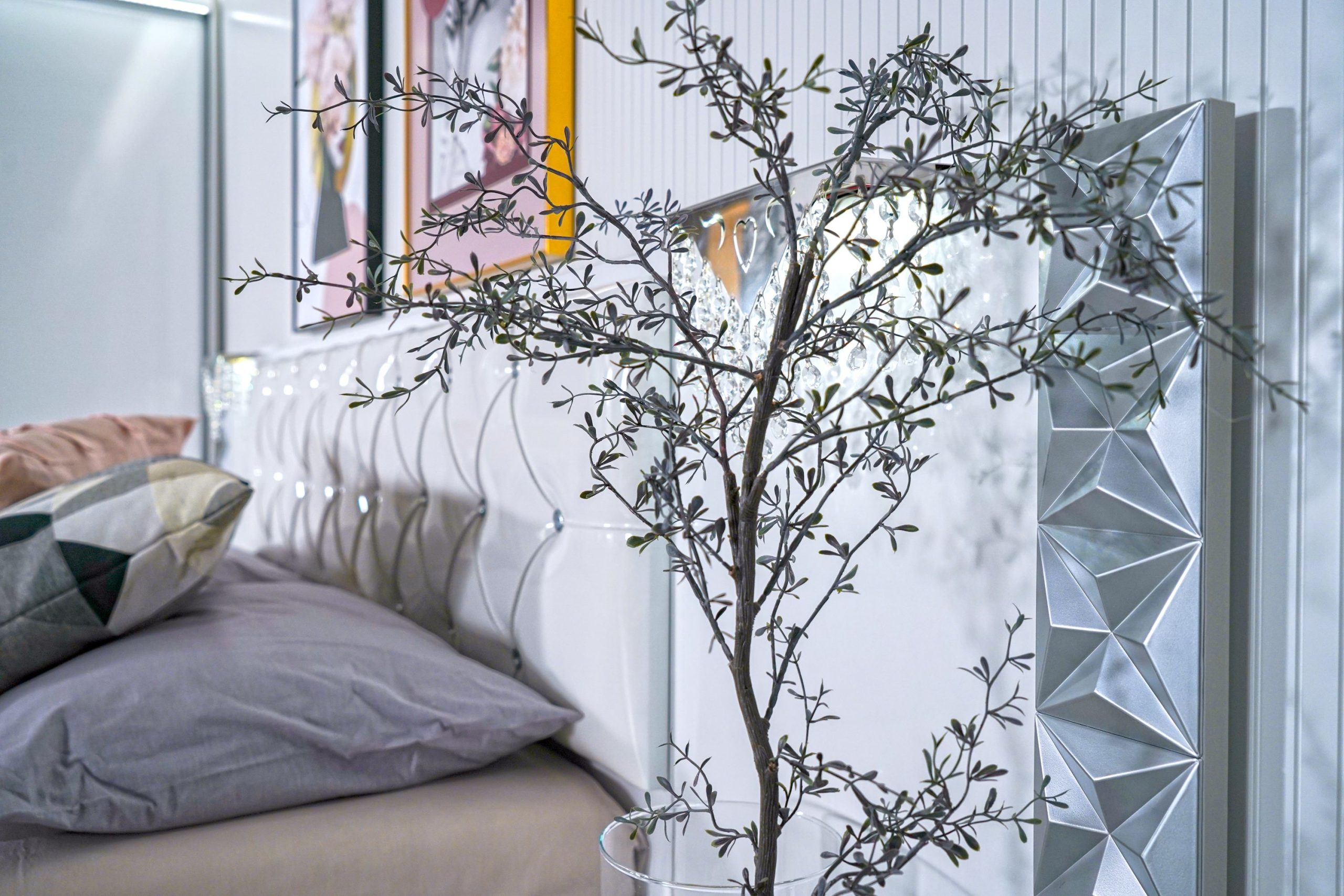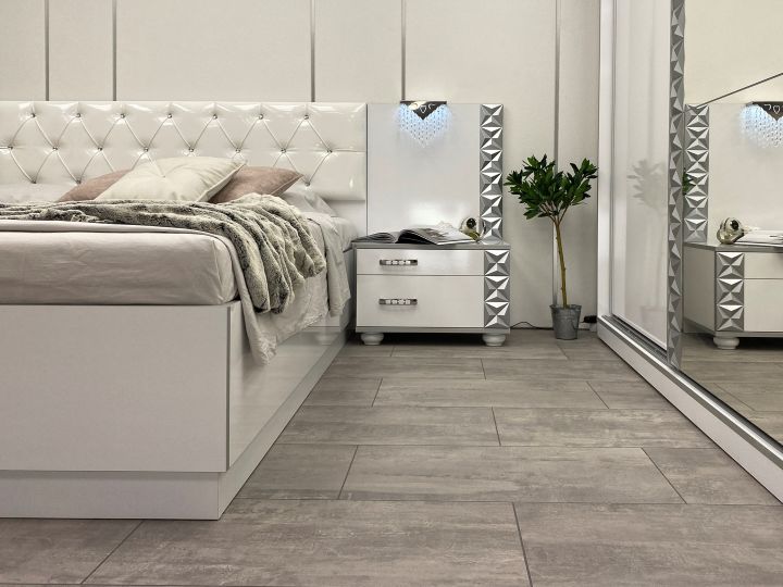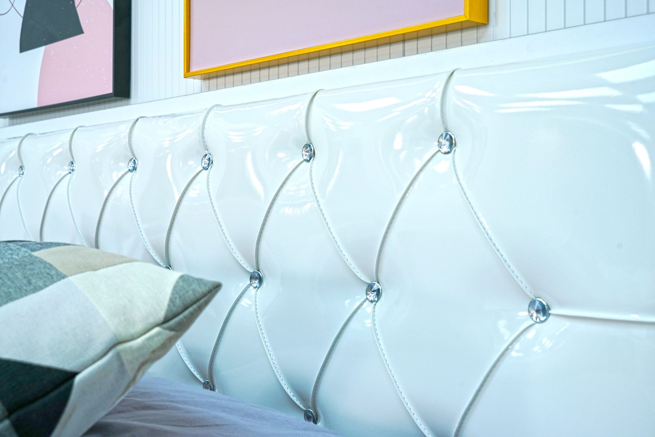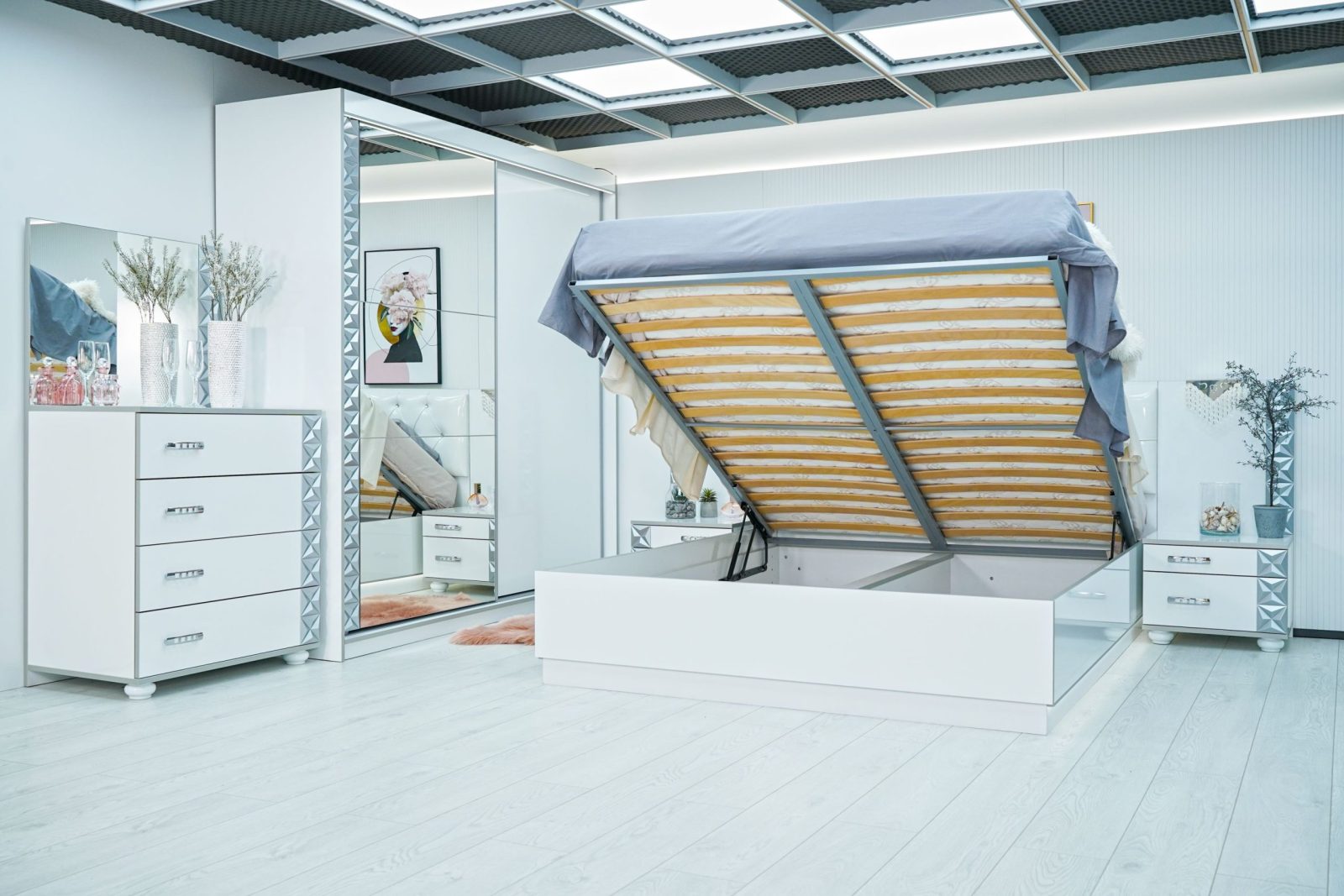 Легло: Основна табла с вградена тапицирана елегантна табла с единичен лицев шев в изпълнение тип „Капитонаж“ от висок клас износоустойчива еко кожа, цвят – бял – покритие гланцов лак, с акценти от бял прозрачен кристал. Заработен вътрешен мост за допълнителна устойчивост и здравина на леглото. Всички използвани сглобки са метални – скрит монтаж.