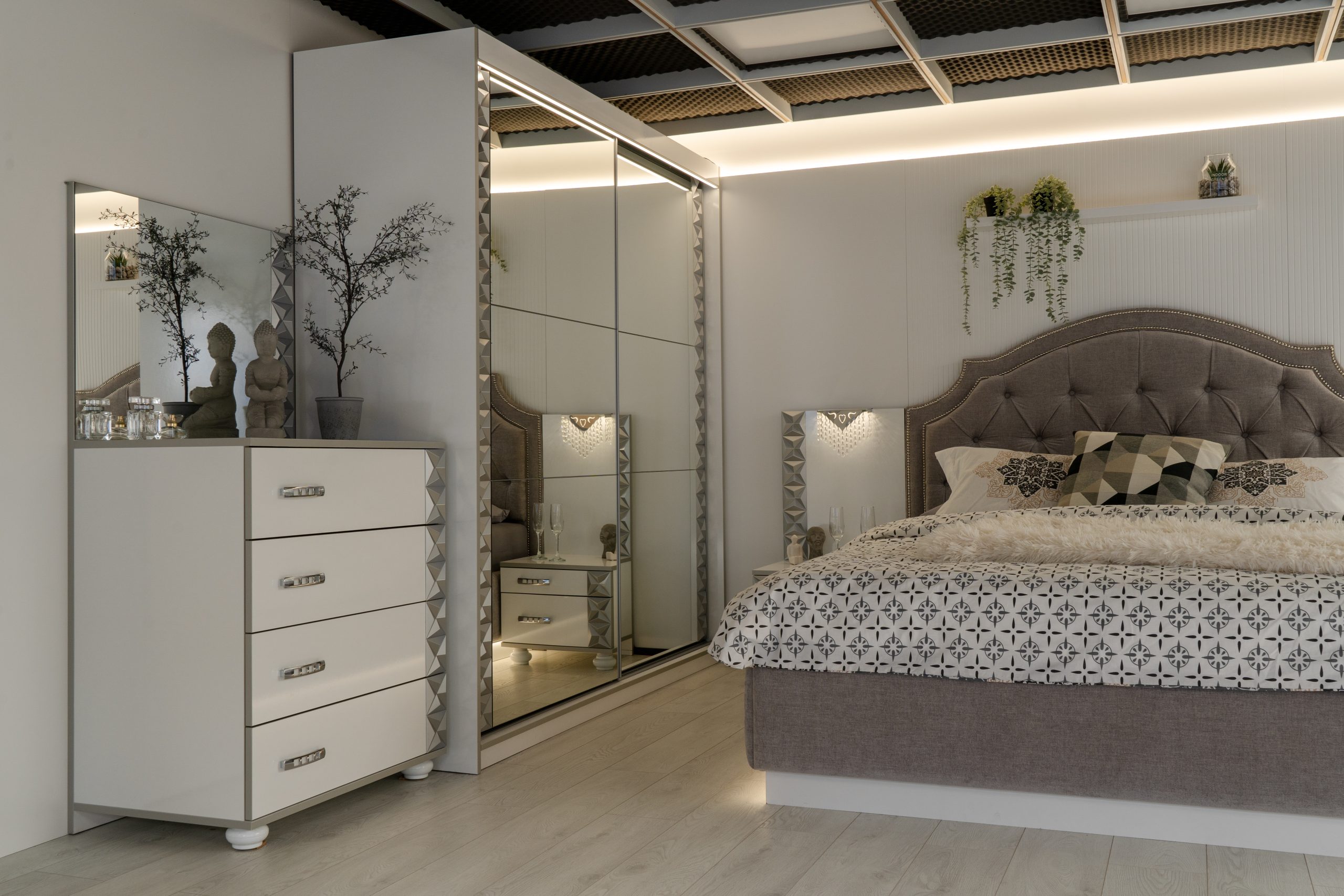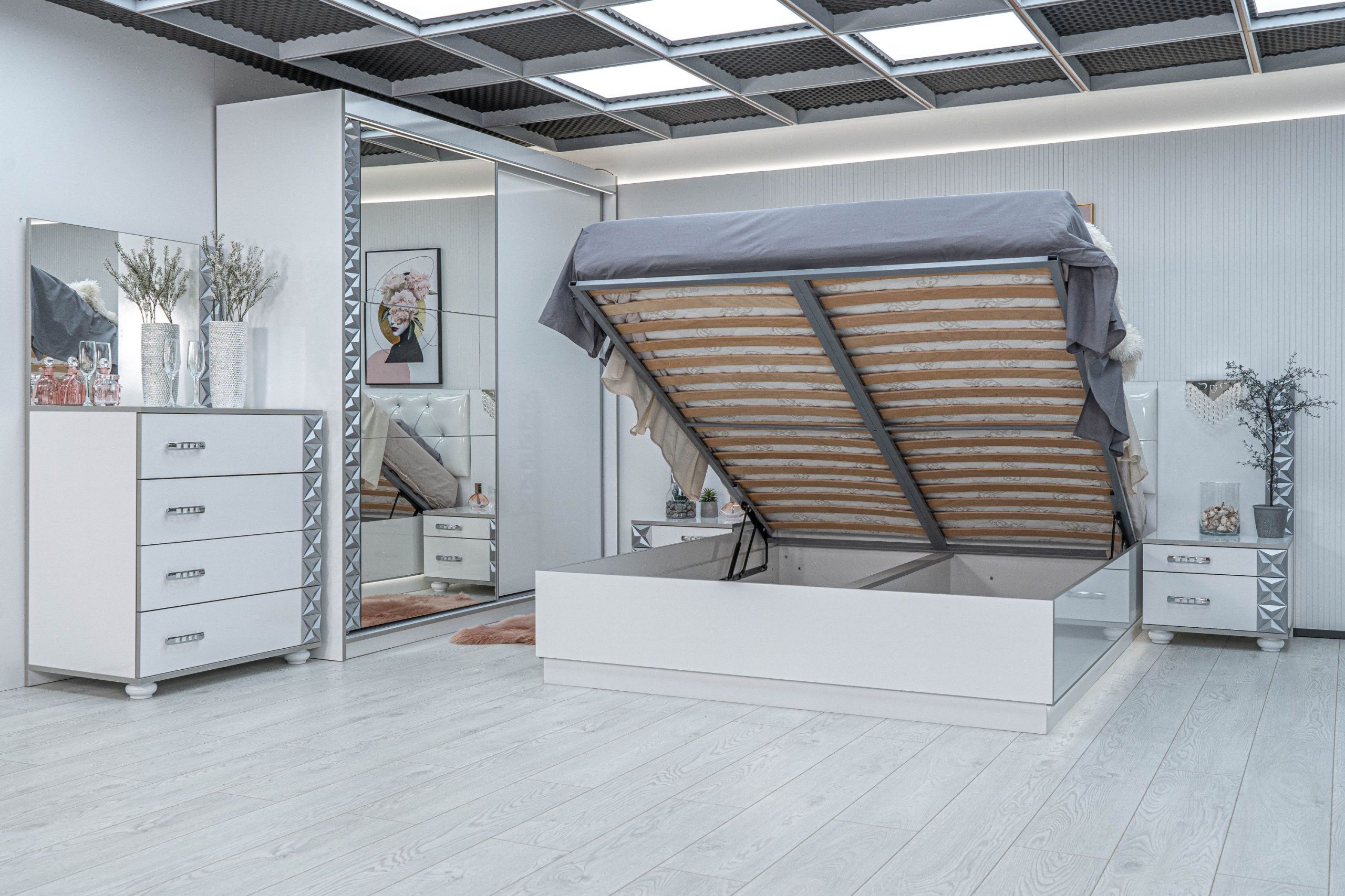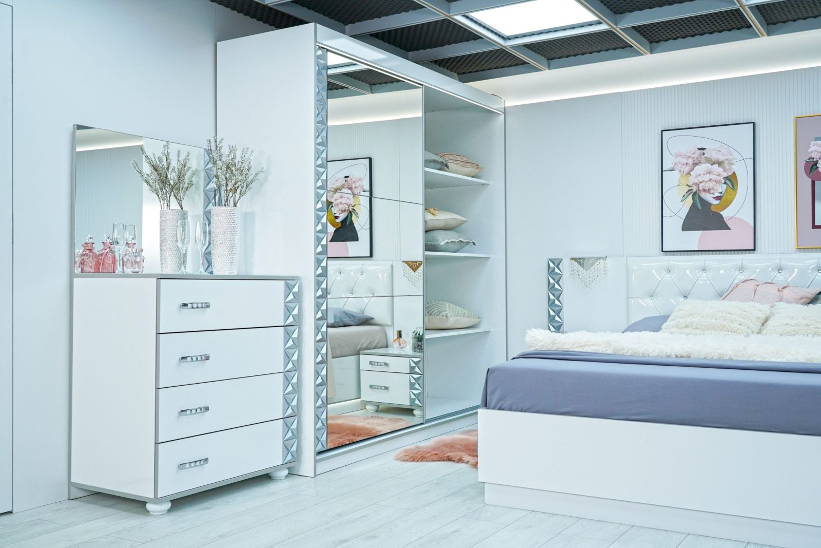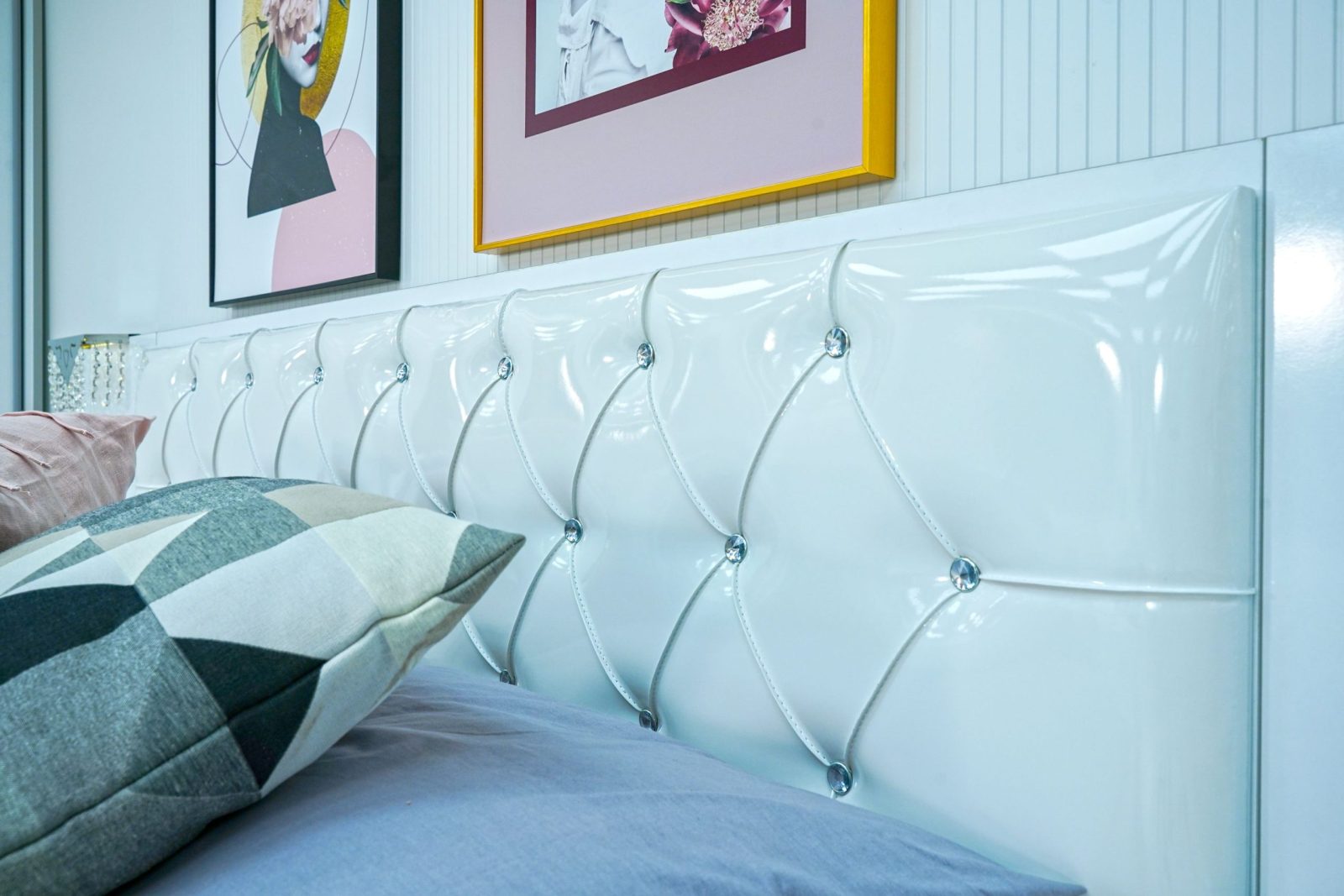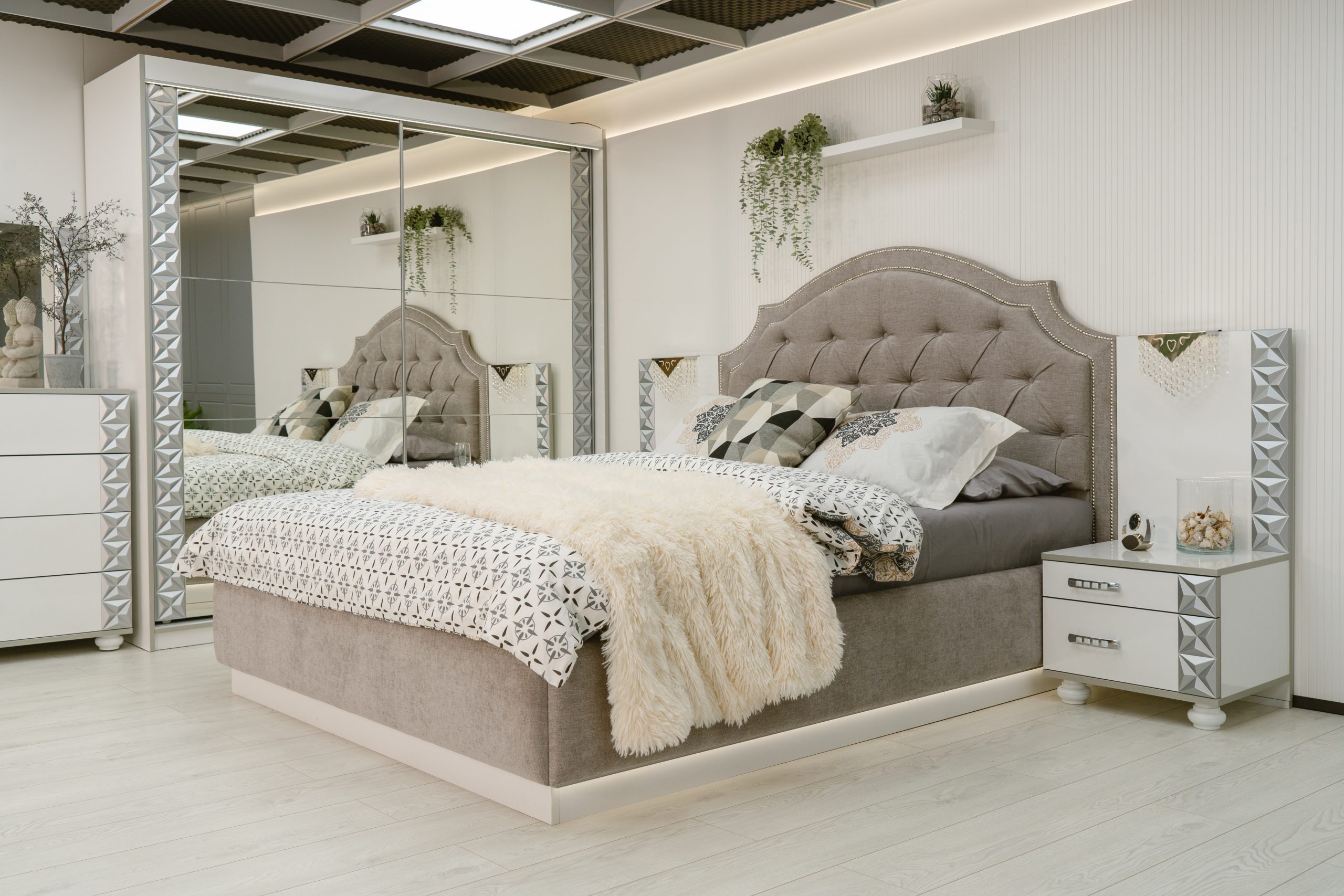 Легло: Основна табла с вградена тапицирана елегантна табла с единичен лицев шев в изпълнение тип „Капитонаж“ от висок клас износоустойчива еко кожа, цвят – бял – покритие гланцов лак, с акценти от бял прозрачен кристал. Заработен вътрешен мост за допълнителна устойчивост и здравина на леглото. Всички използвани сглобки са метални – скрит монтаж.