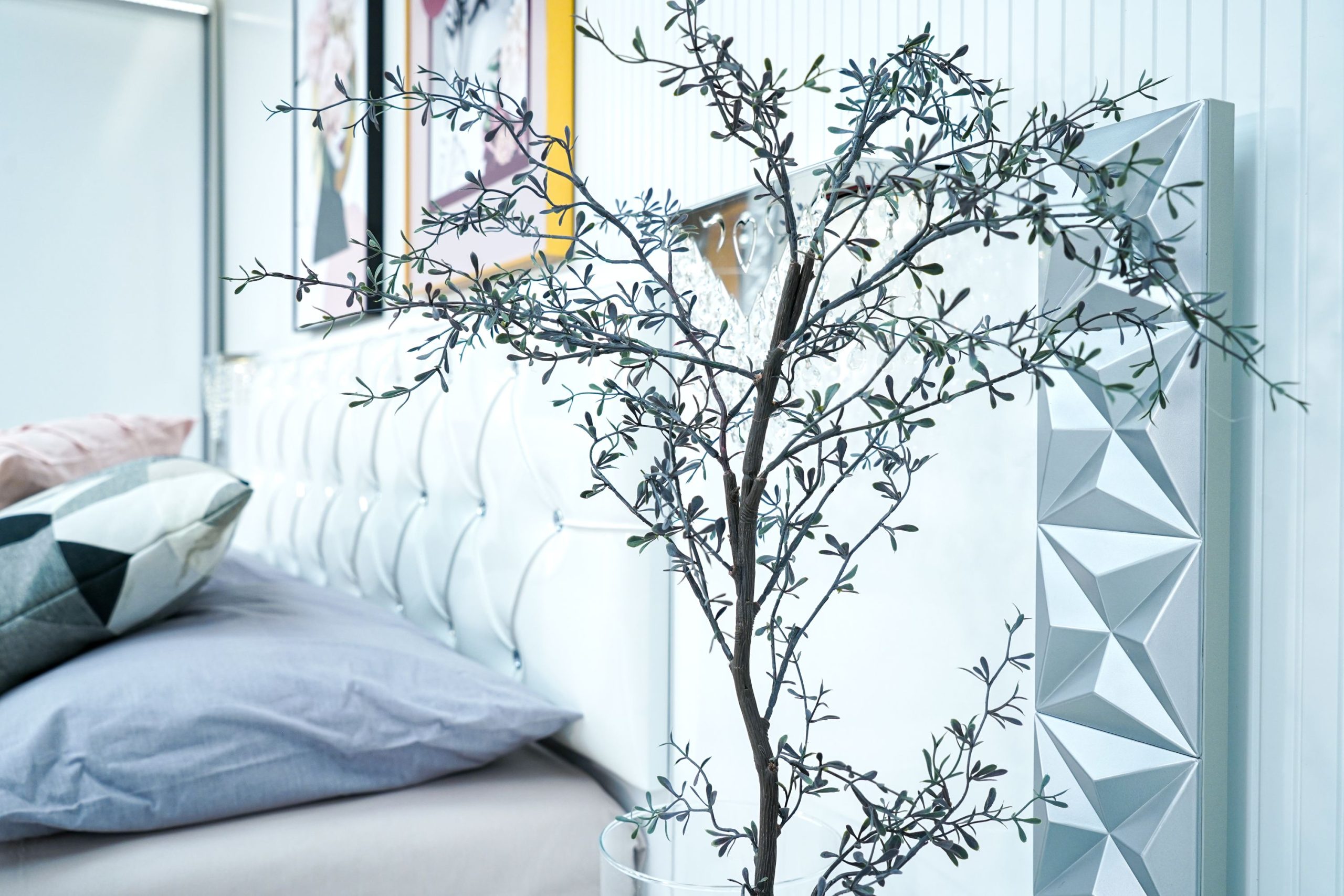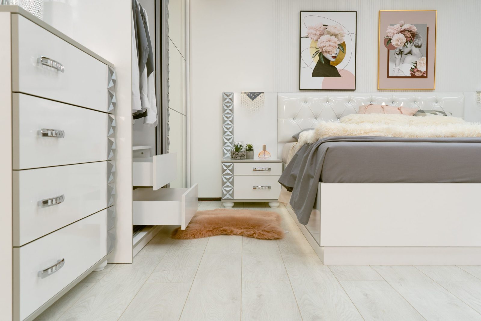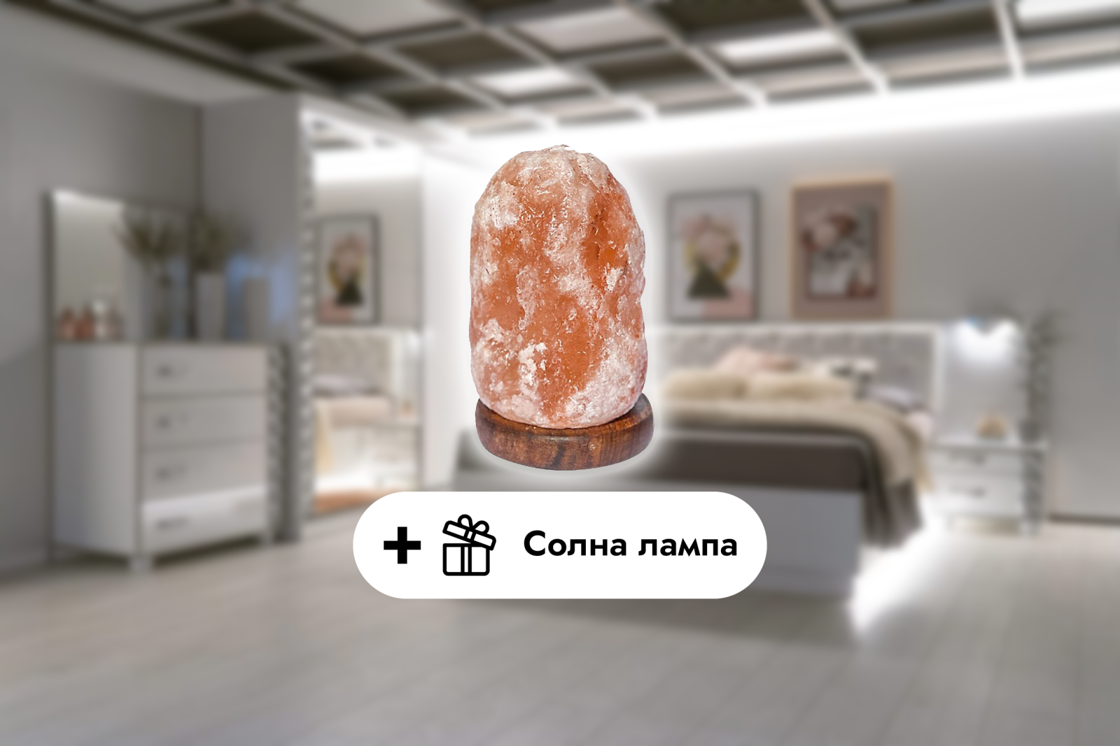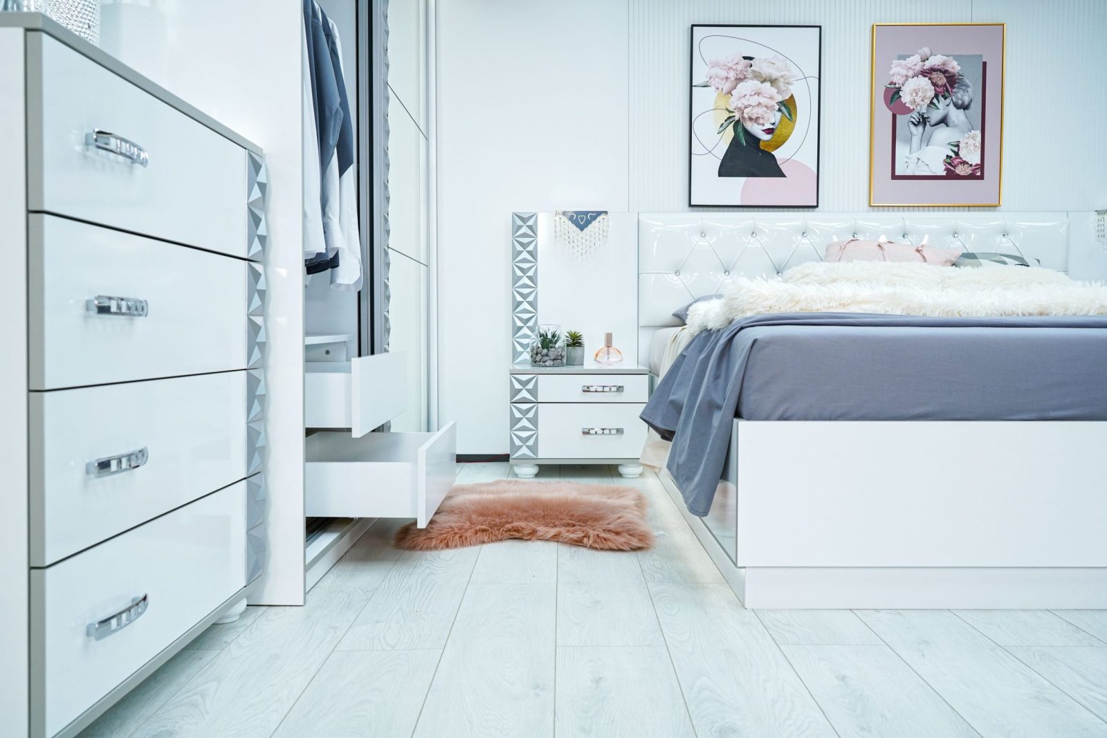 Легло: Основна табла с вградена тапицирана елегантна табла с единичен лицев шев в изпълнение тип „Капитонаж“ от висок клас износоустойчива еко кожа, цвят – бял – покритие гланцов лак, с акценти от бял прозрачен кристал. Заработен вътрешен мост за допълнителна устойчивост и здравина на леглото. Всички използвани сглобки са метални – скрит монтаж.