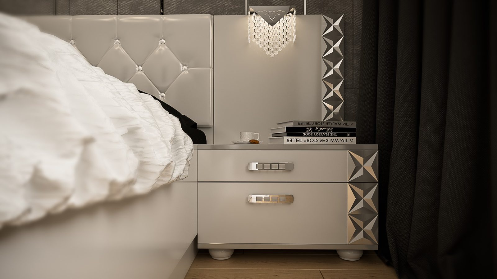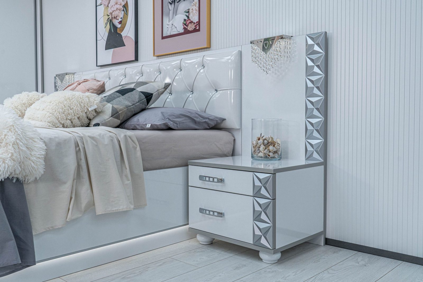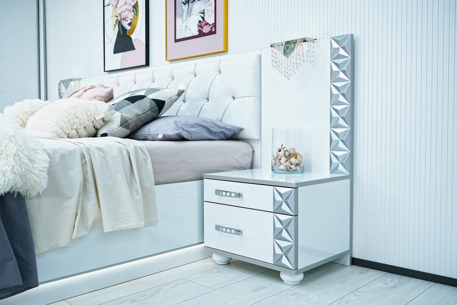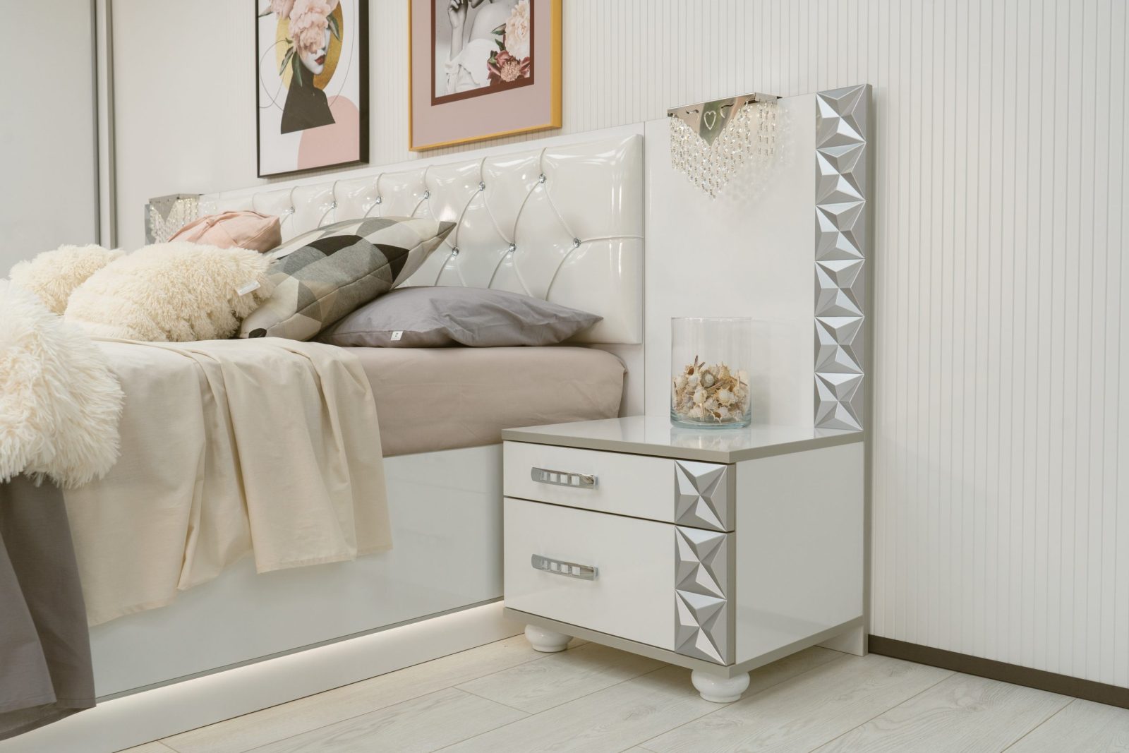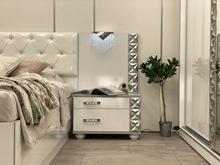 Нощно шкафче: Две практични чекмеджета с дръжки от полиран перфориран никел, система скрити водачи Quadro Hettich – плавно затваряне, висок плътен гръб с вградено LED осветление, с модерен дизайн на корпусната част – перфориран полиран никел с режим на работа – допир контрол, спускащи се кристални капчици, пръскащи деликатна романтика в помещението, завършващи детайли от луксозни гланцови призми -цвят сребро – 2 бр.