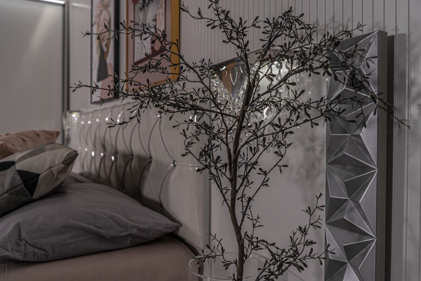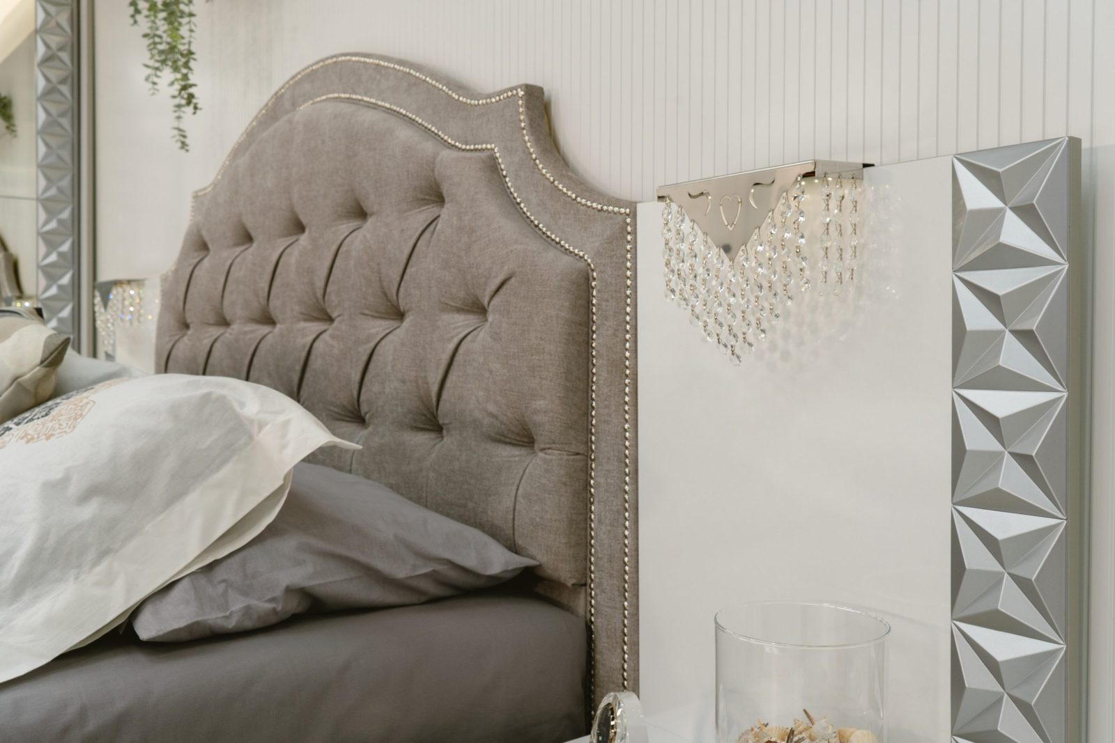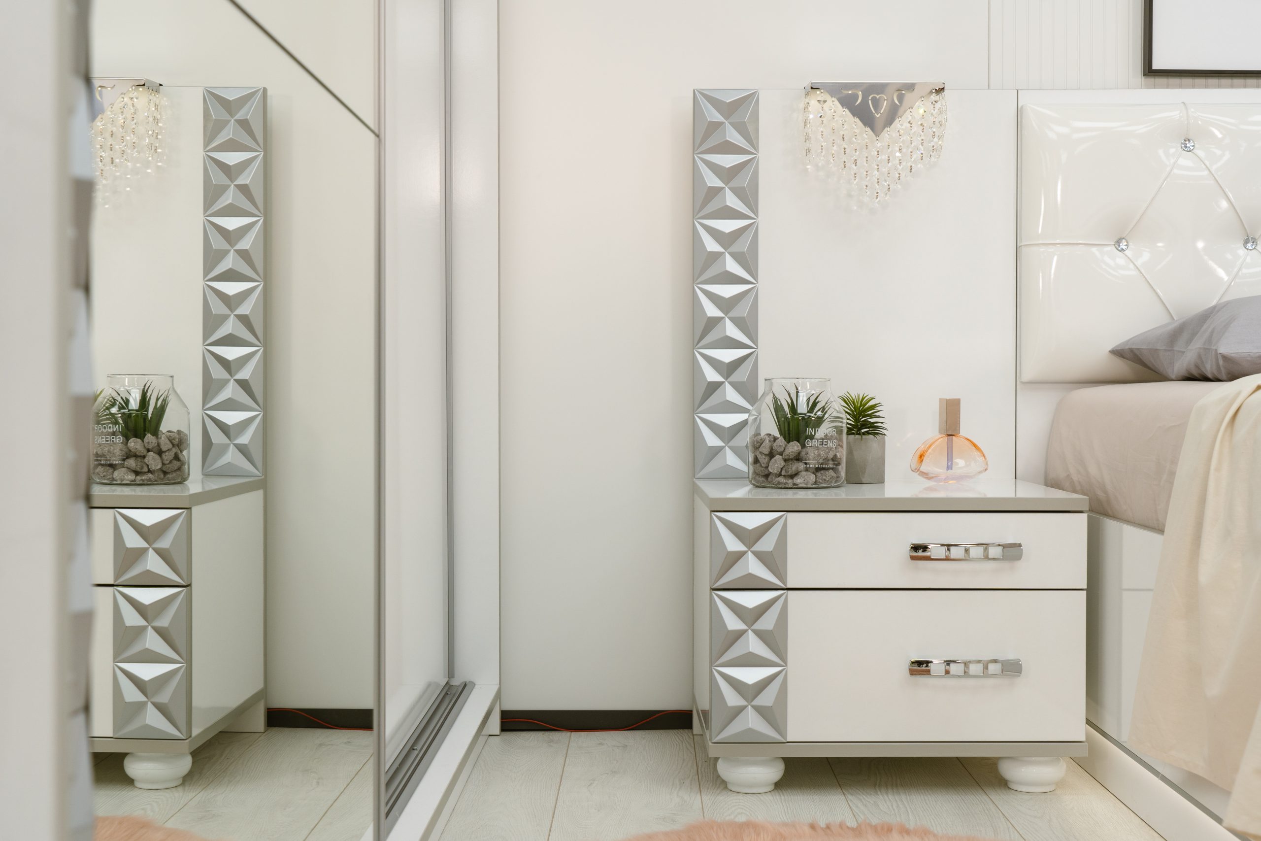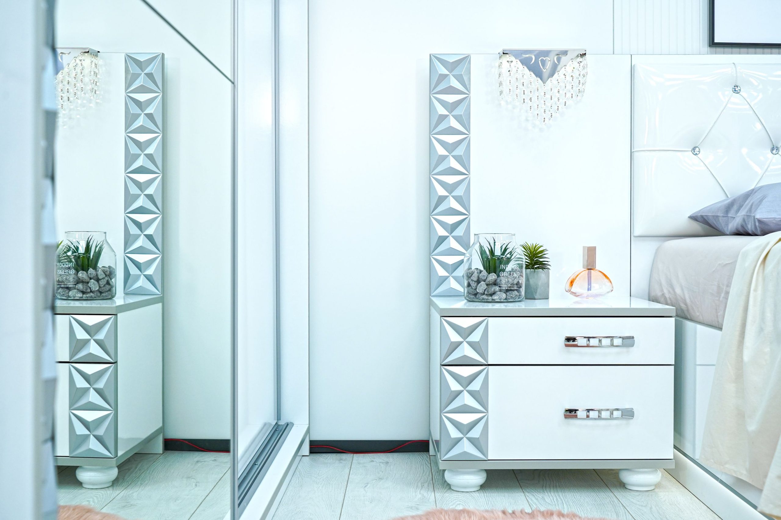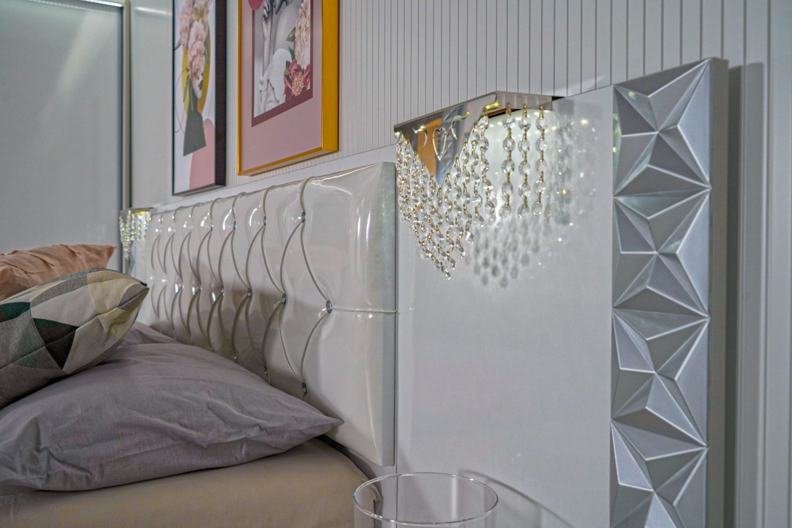 Нощно шкафче: Две практични чекмеджета с дръжки от полиран перфориран никел, система скрити водачи Quadro Hettich – плавно затваряне, висок плътен гръб с вградено LED осветление, с модерен дизайн на корпусната част – перфориран полиран никел с режим на работа – допир контрол, спускащи се кристални капчици, пръскащи деликатна романтика в помещението, завършващи детайли от луксозни гланцови призми -цвят сребро – 2 бр.