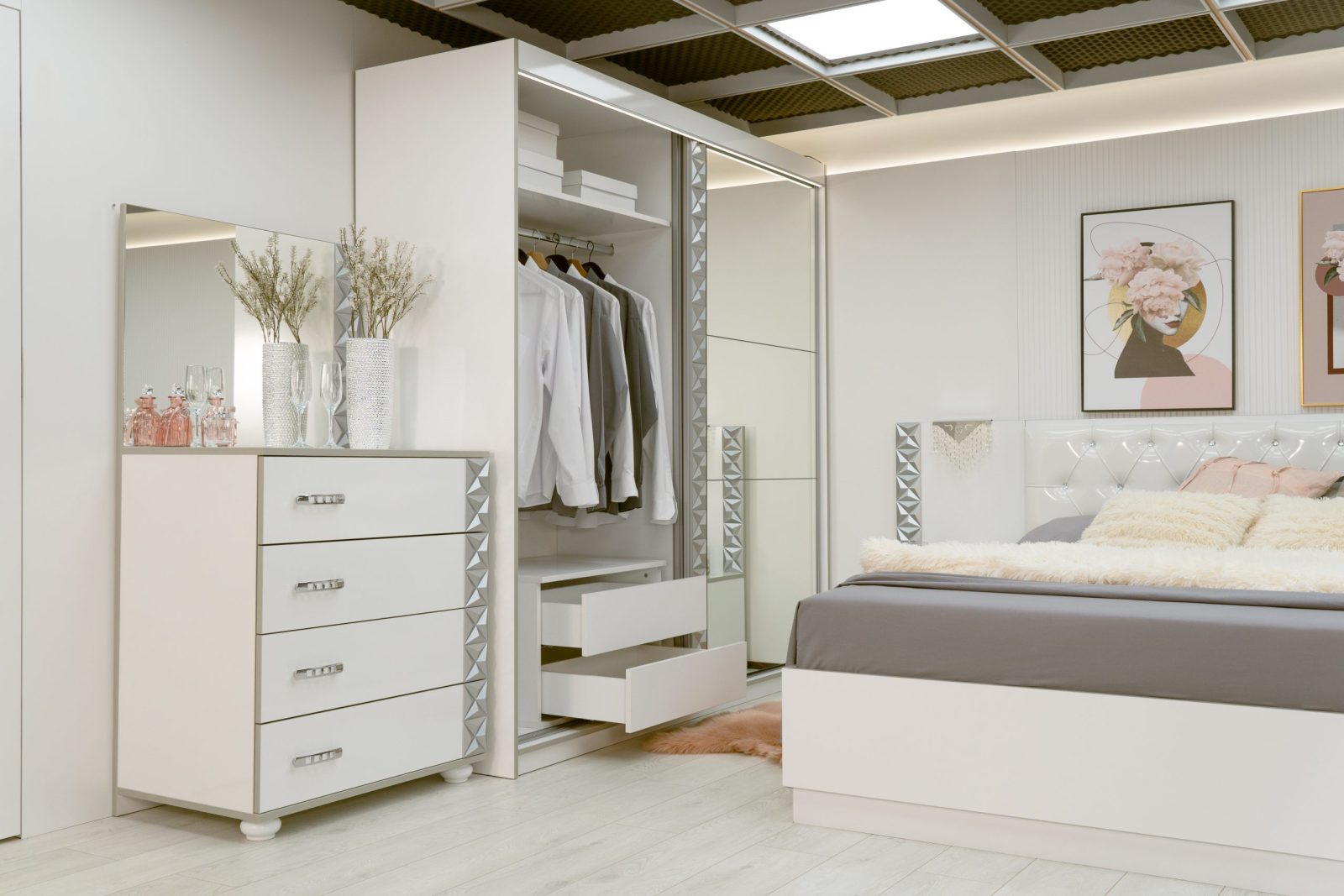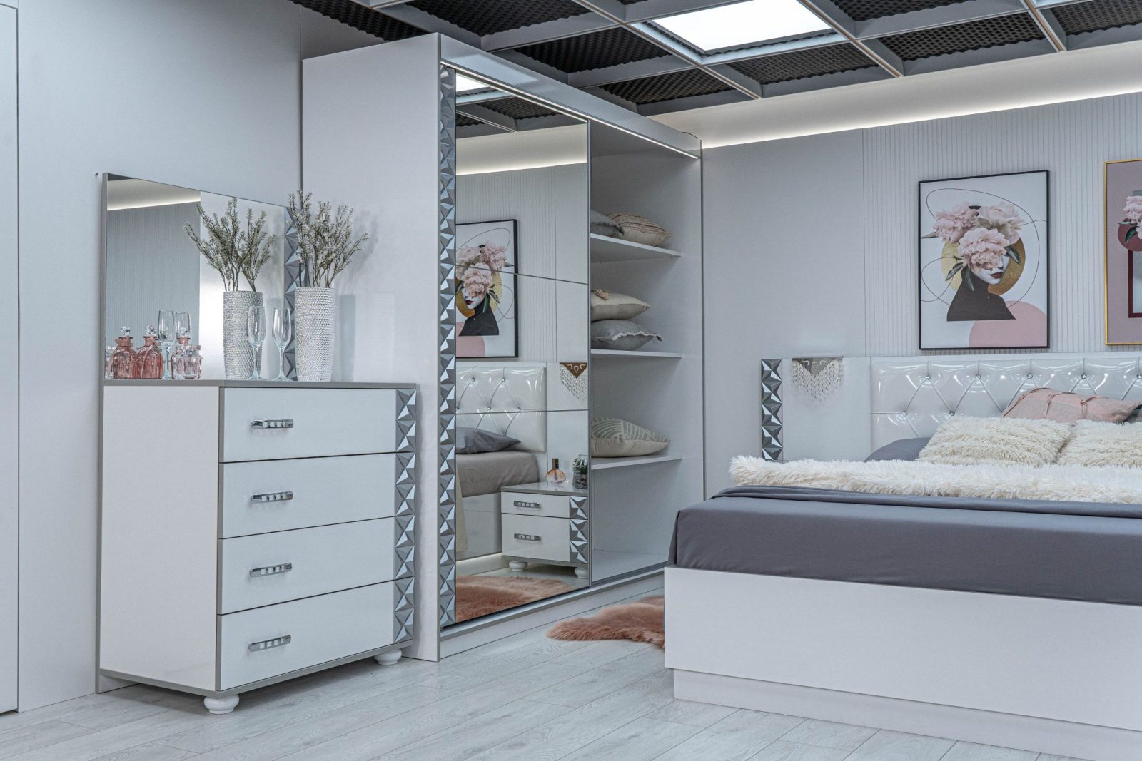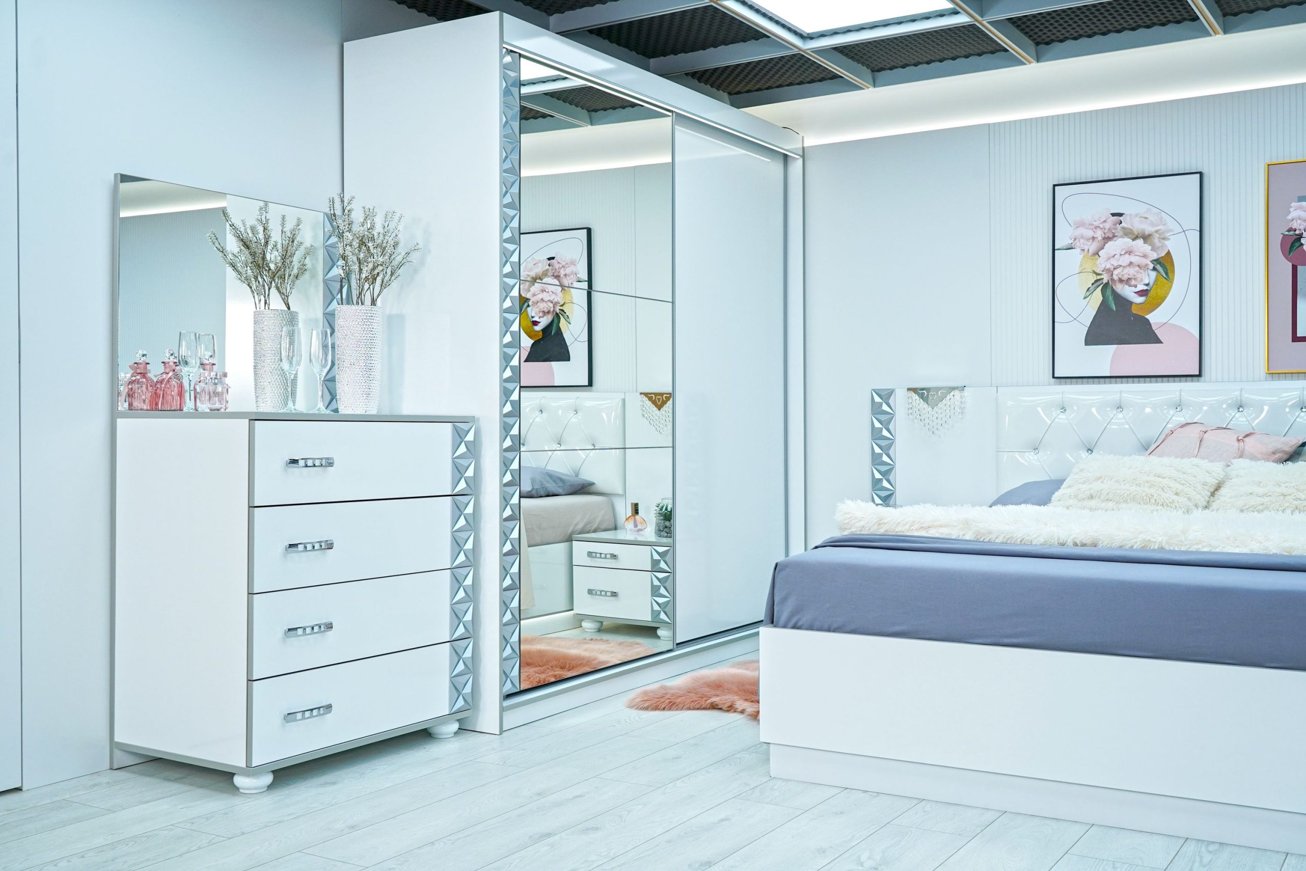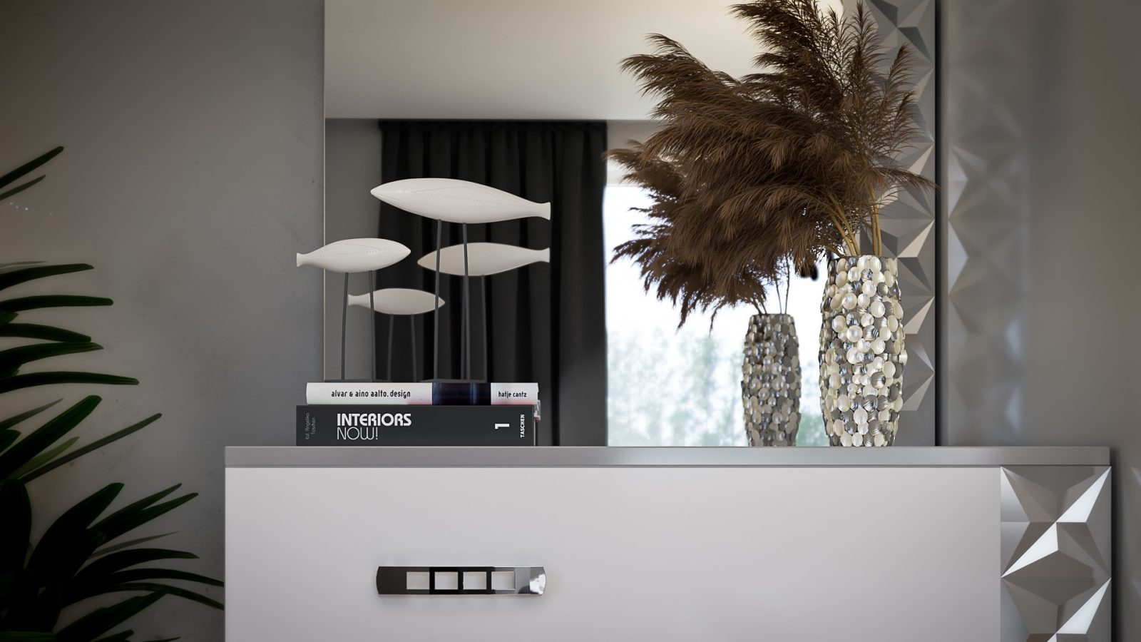 Скрин с огледало – Опция! Четири практични чекмеджета с дръжки от полиран перфориран никел, система скрити водачи Quadro Hettich – плавно затваряне, вградено елегантно огледало, завършващи детайли от луксозни гланцови призми в цвят сребро; Целият плътен гръб на изделието позволява да бъде позиционирано в помещението без да е монтирано за стена – 1 бр.