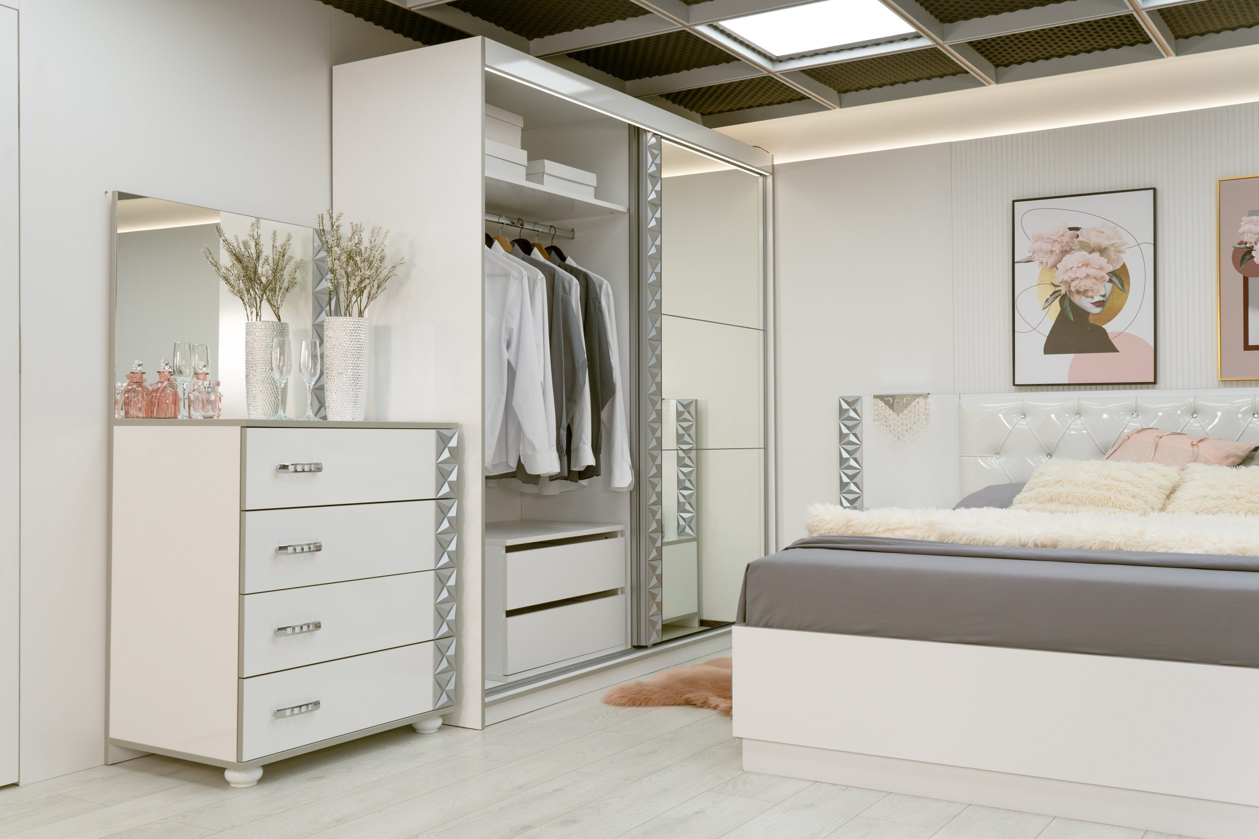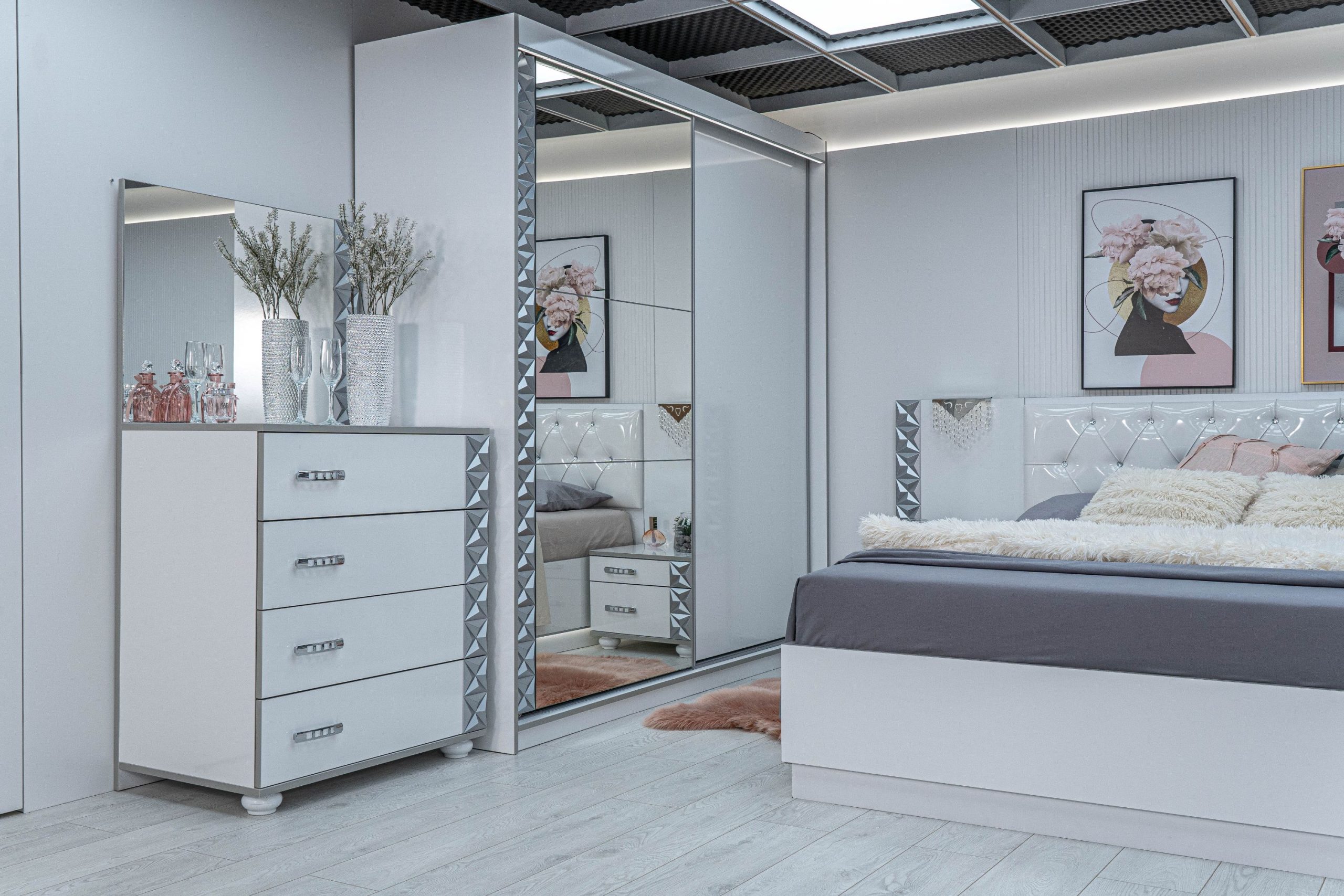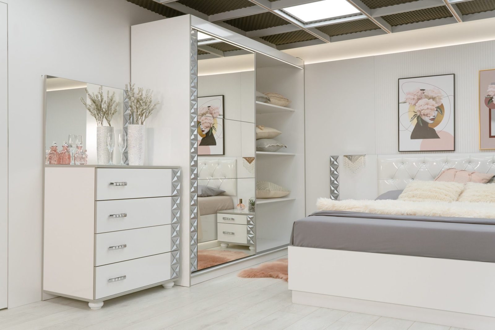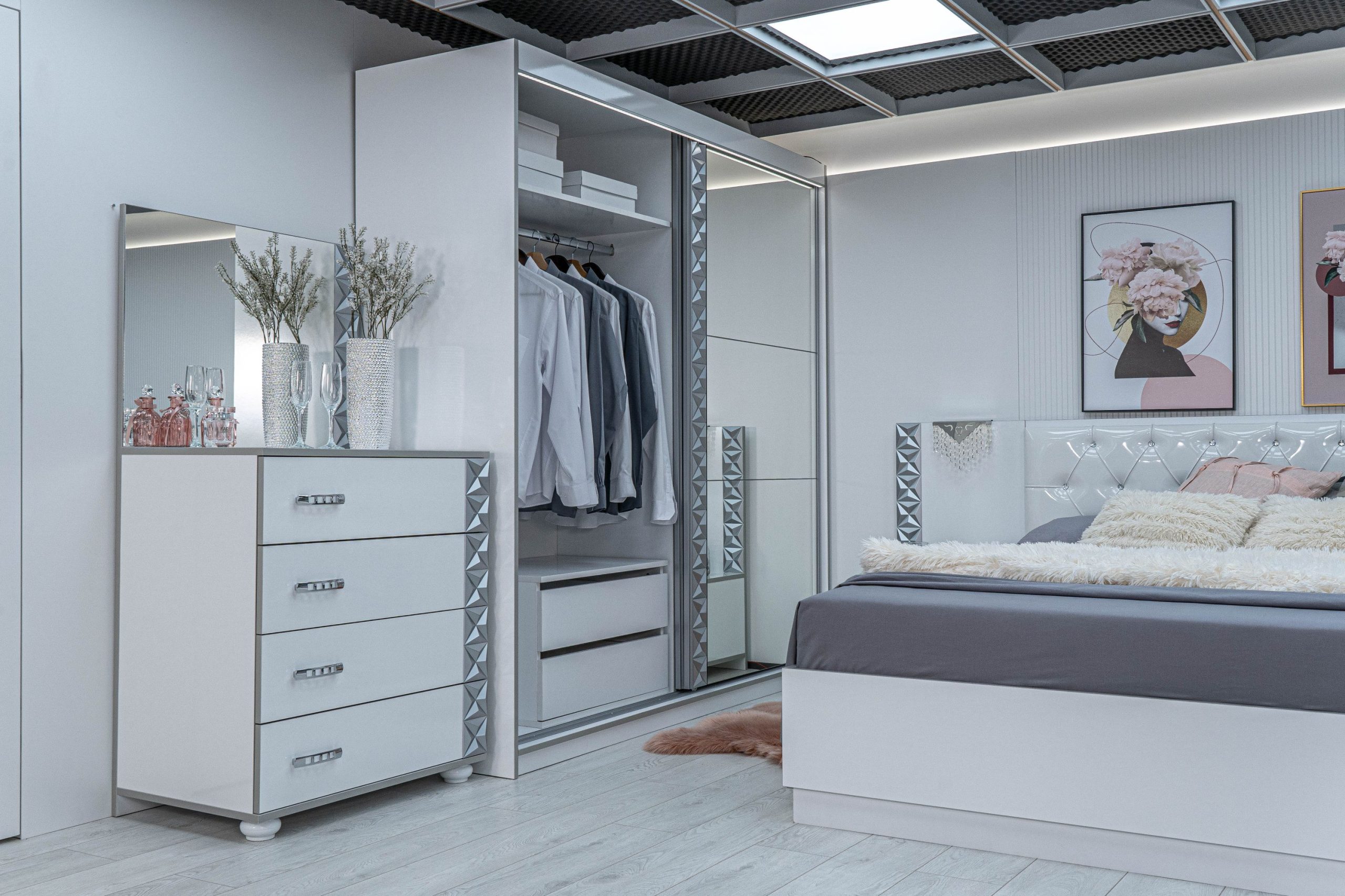 Скрин с огледало – Опция! Четири практични чекмеджета с дръжки от полиран перфориран никел, система скрити водачи Quadro Hettich – плавно затваряне, вградено елегантно огледало, завършващи детайли от луксозни гланцови призми в цвят сребро; Целият плътен гръб на изделието позволява да бъде позиционирано в помещението без да е монтирано за стена – 1 бр.
