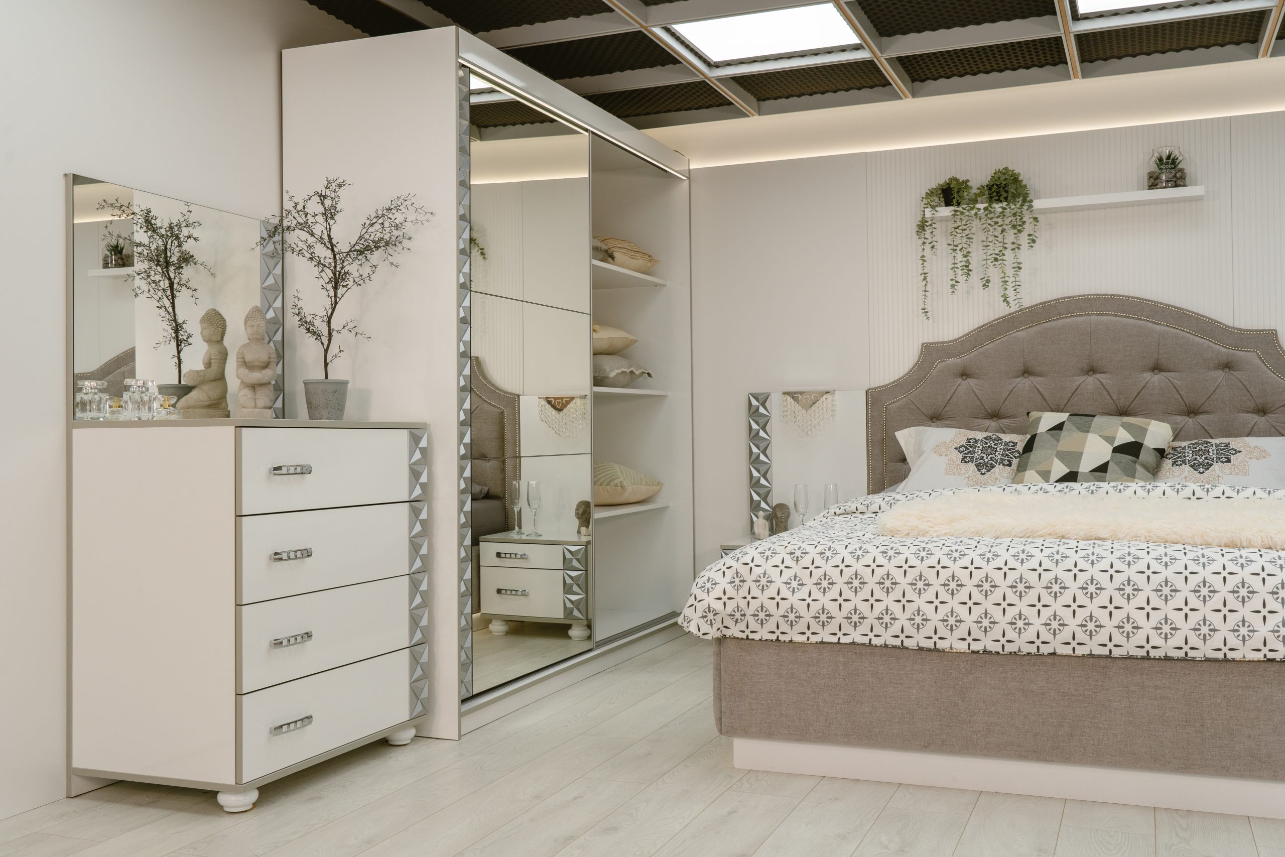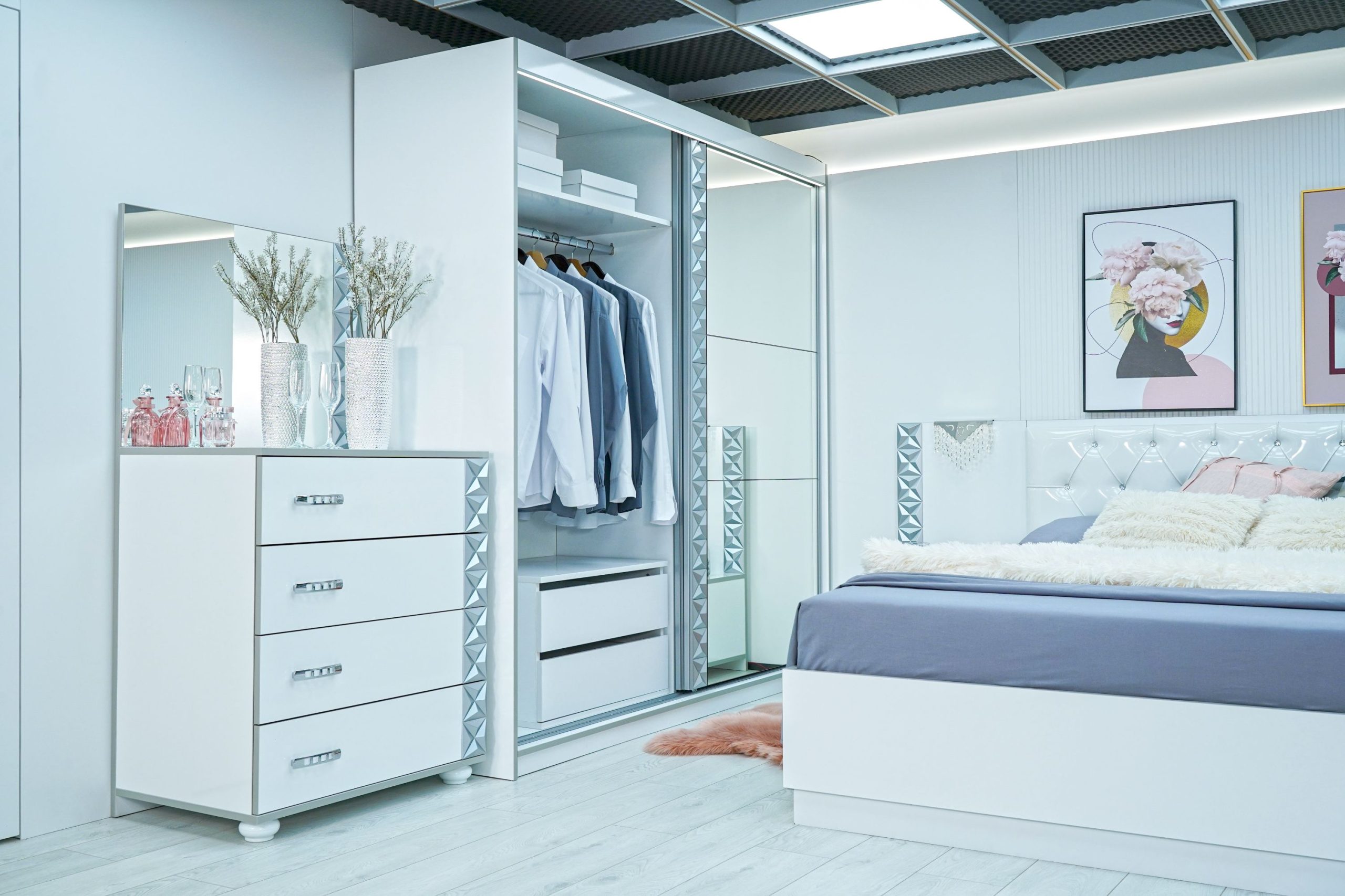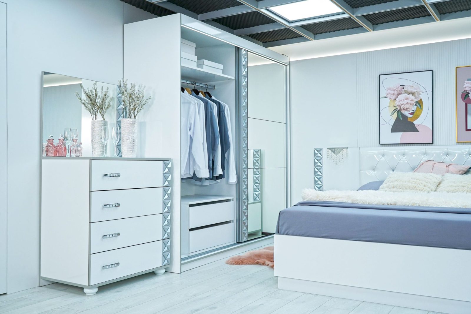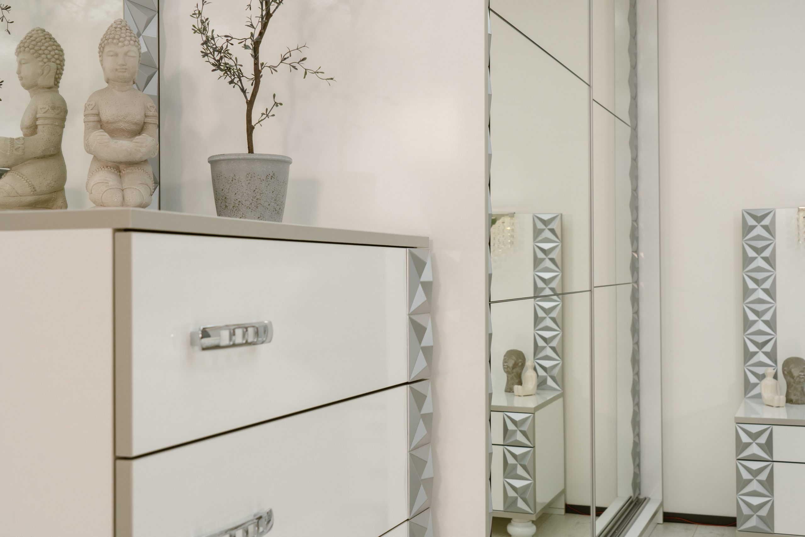 Скрин с огледало – Опция! Четири практични чекмеджета с дръжки от полиран перфориран никел, система скрити водачи Quadro Hettich – плавно затваряне, вградено елегантно огледало, завършващи детайли от луксозни гланцови призми в цвят сребро; Целият плътен гръб на изделието позволява да бъде позиционирано в помещението без да е монтирано за стена – 1 бр.