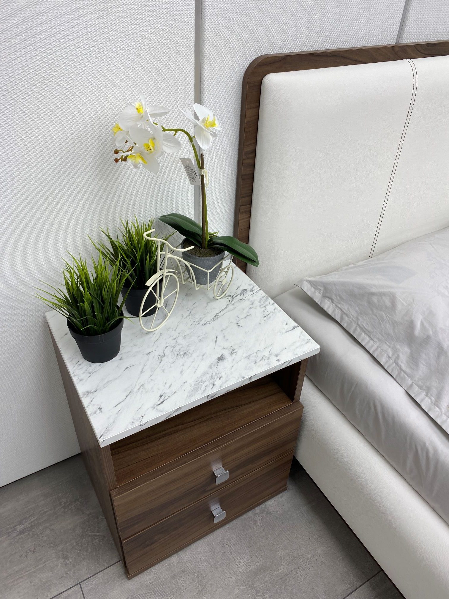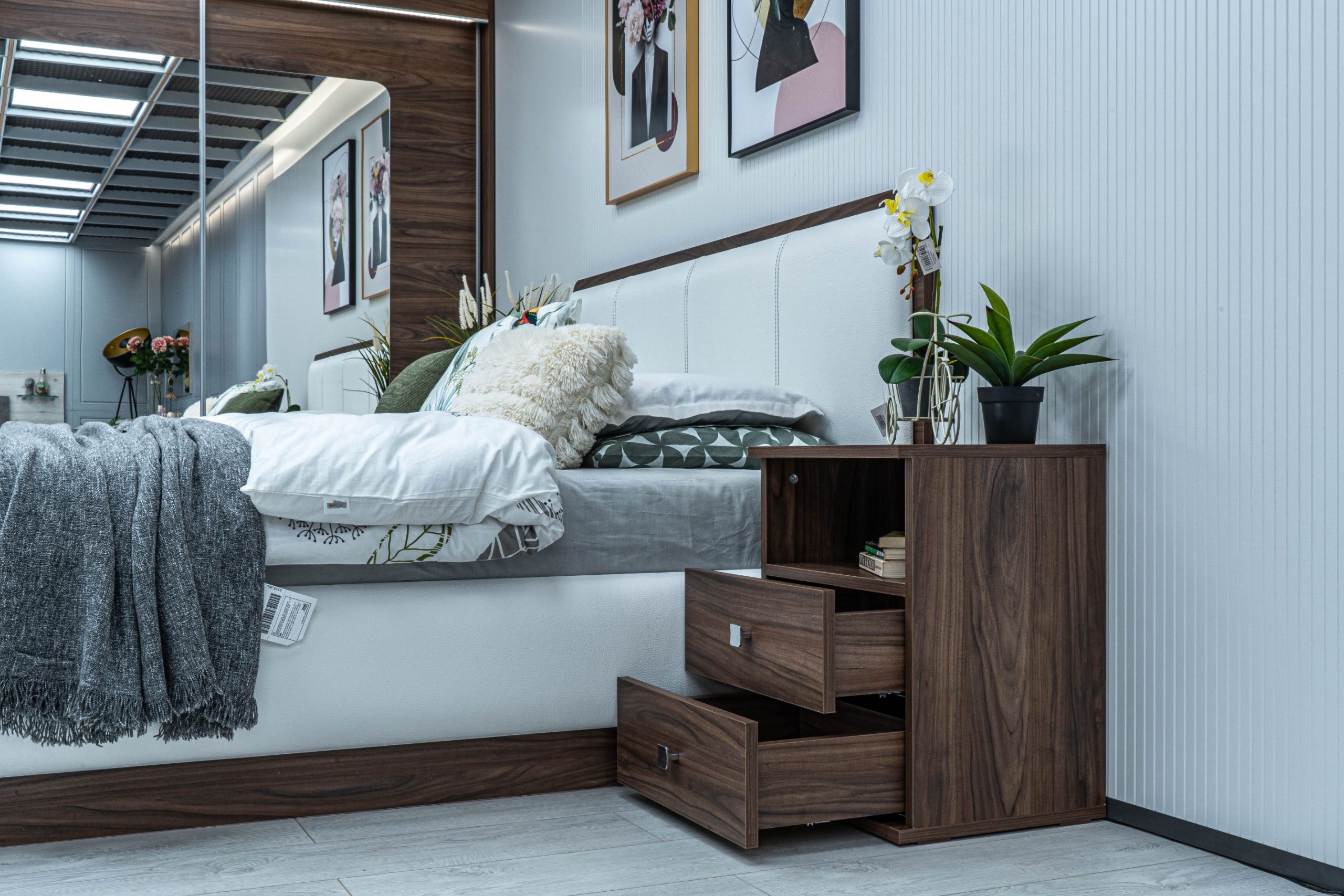 Нощно шкафче: Две функционални чекмеджета с практична ниша, система скрити водачи Quadro Hettich – плавно затваряне, дръжка с форма квадрат, покритие – никел – 2 бр. в к-т;