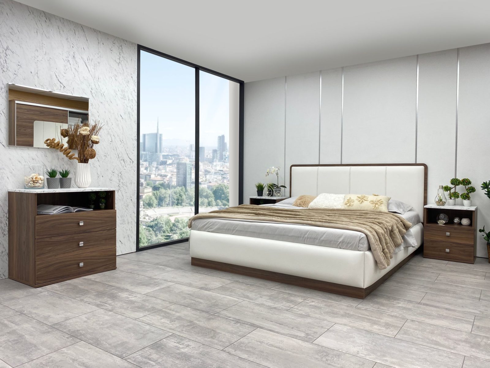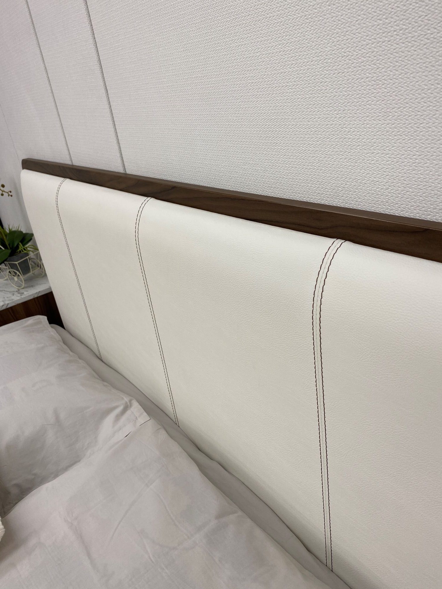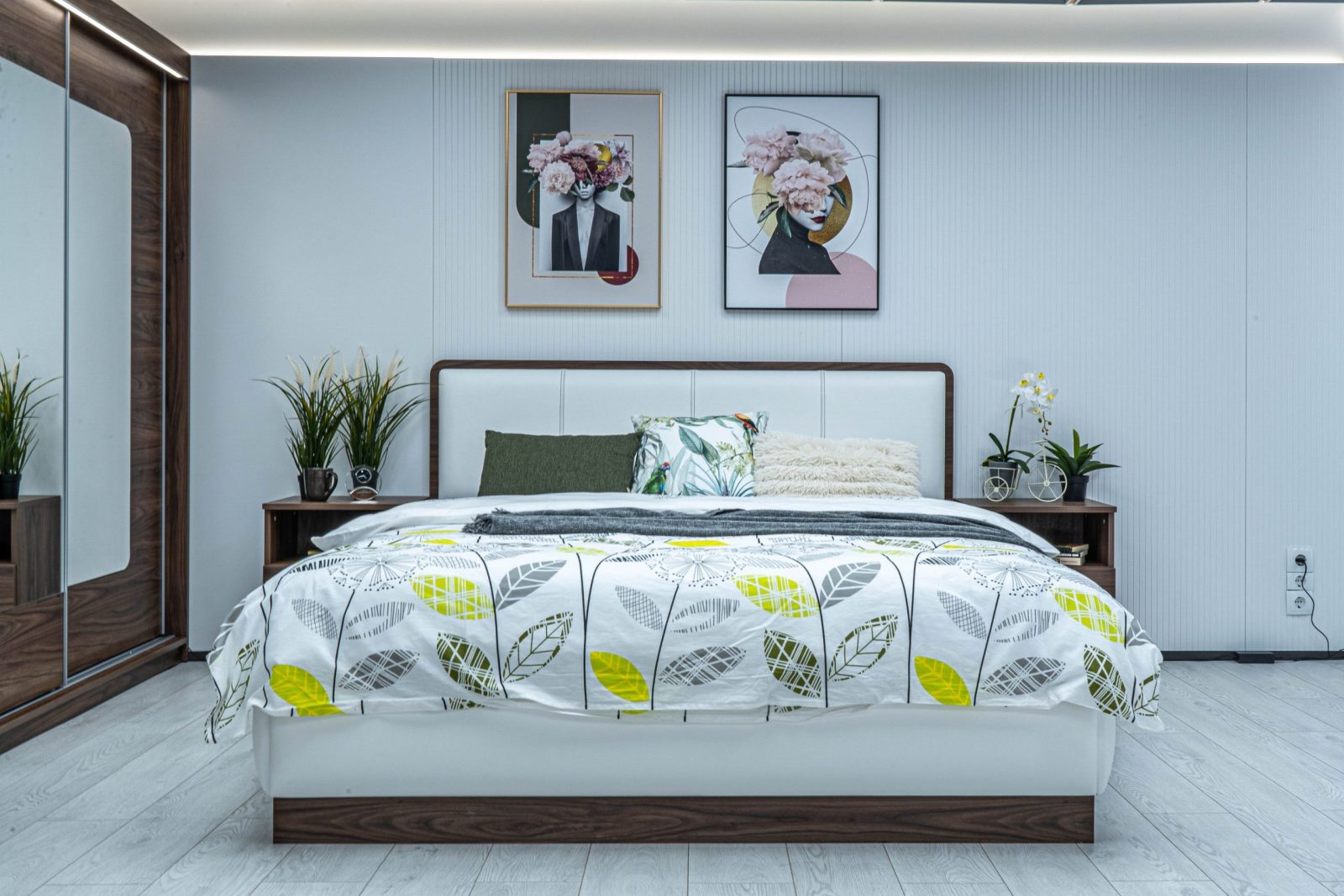 Легло: тапицирана елегантна табла с двуиглен декоративен украсителен лицев шев – цвят кафяв, от високо износоустойчива еко кожа, цвят – бял, тапицирана база – без ръбове – високо износоустойчива еко кожа – цвят бял. Всички тапицерии са с опция за откачане без разглобяване на леглото с цел лесна поддръжка. Вътрешен вертикален укрепителн мост с цел прав диалгонал и допълнителна здравина на леглото. Използвани сглобки са със скрит монтаж.