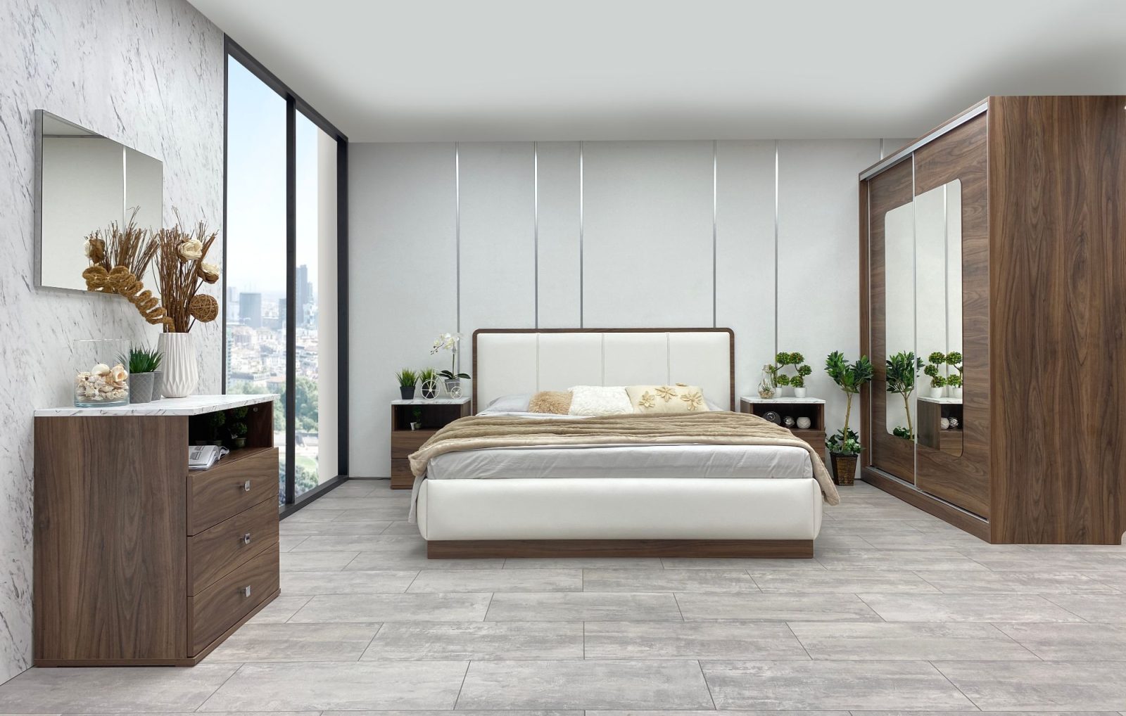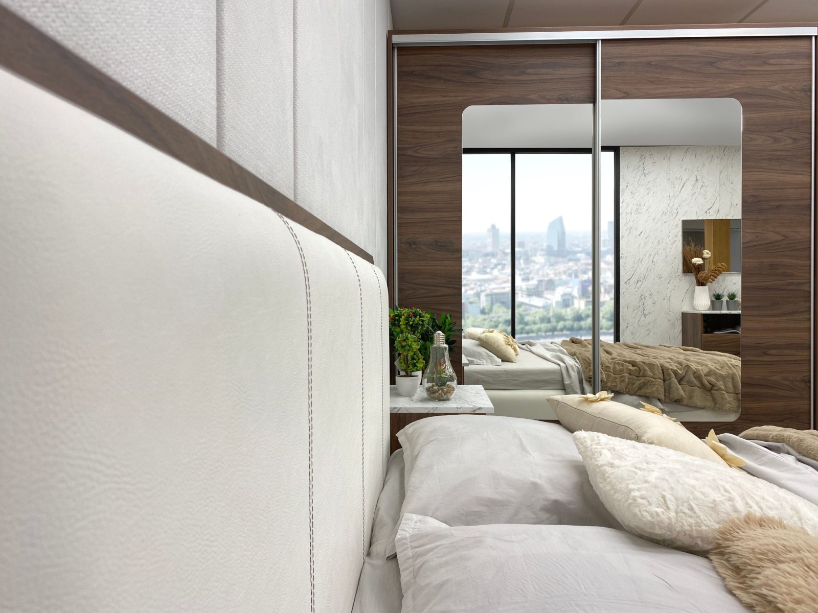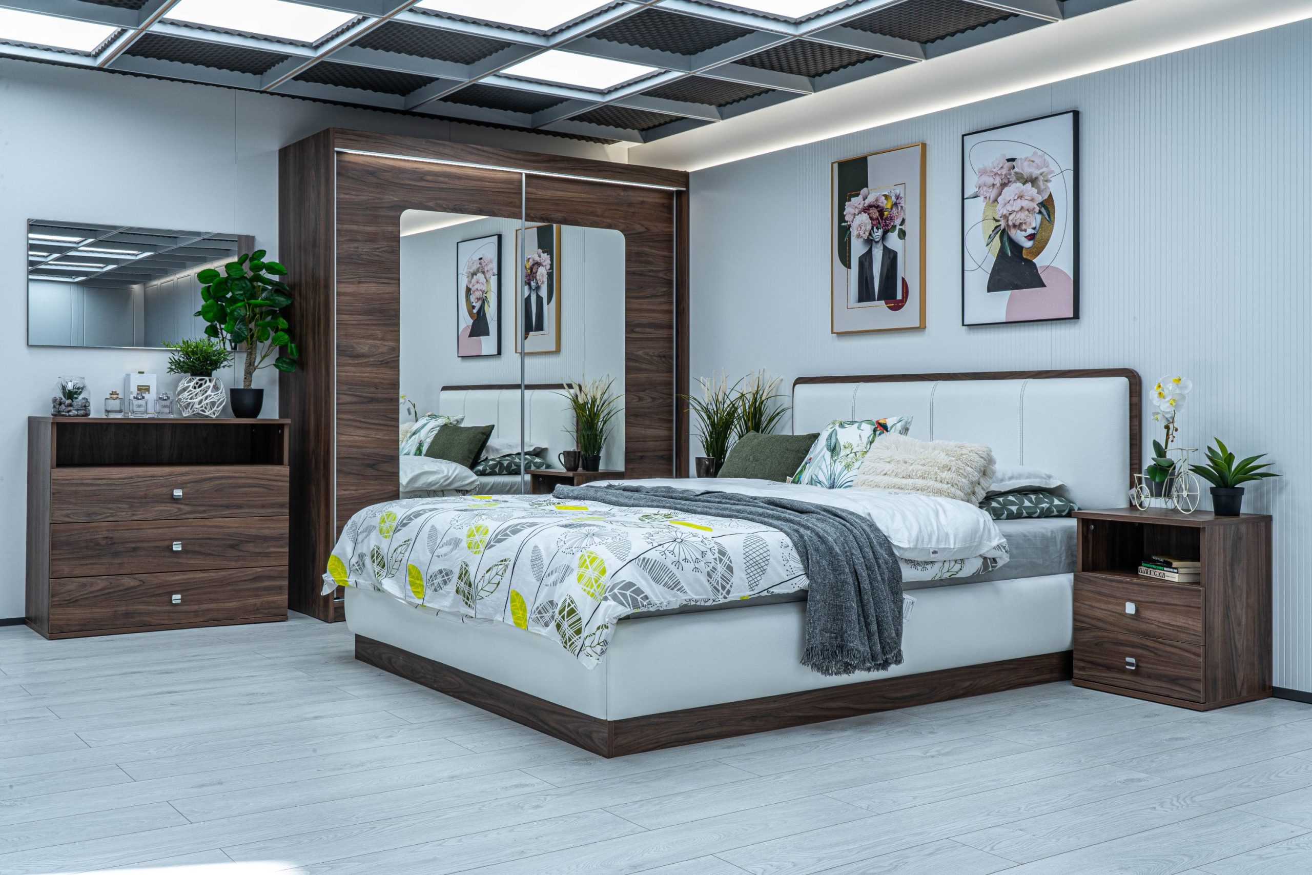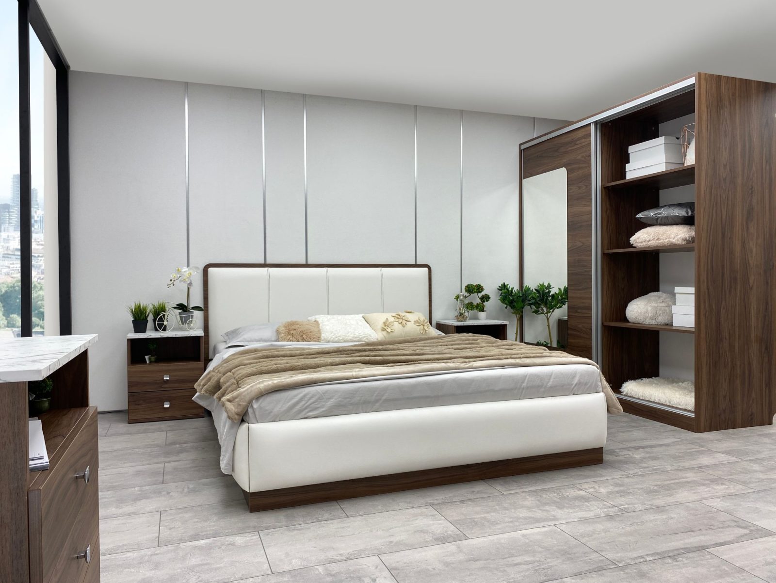 Легло: тапицирана елегантна табла с двуиглен декоративен украсителен лицев шев – цвят кафяв, от високо износоустойчива еко кожа, цвят – бял, тапицирана база – без ръбове – високо износоустойчива еко кожа – цвят бял. Всички тапицерии са с опция за откачане без разглобяване на леглото с цел лесна поддръжка. Вътрешен вертикален укрепителн мост с цел прав диалгонал и допълнителна здравина на леглото. Използвани сглобки са със скрит монтаж.