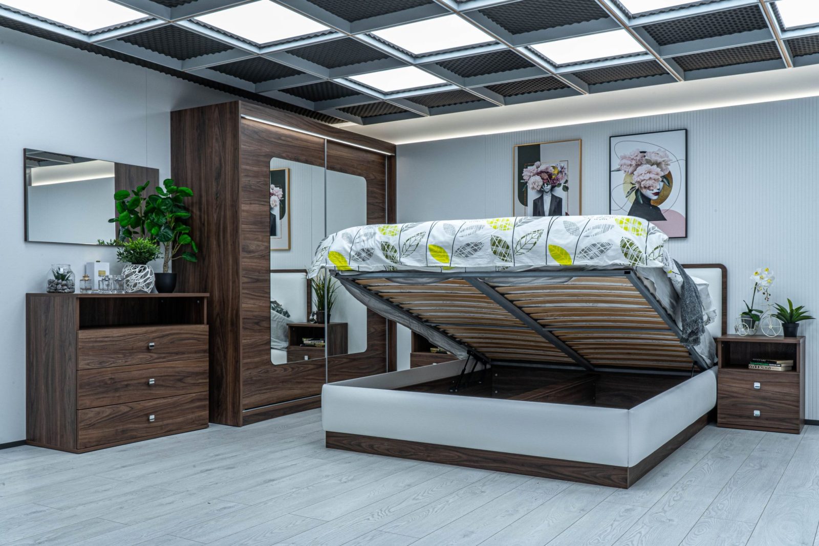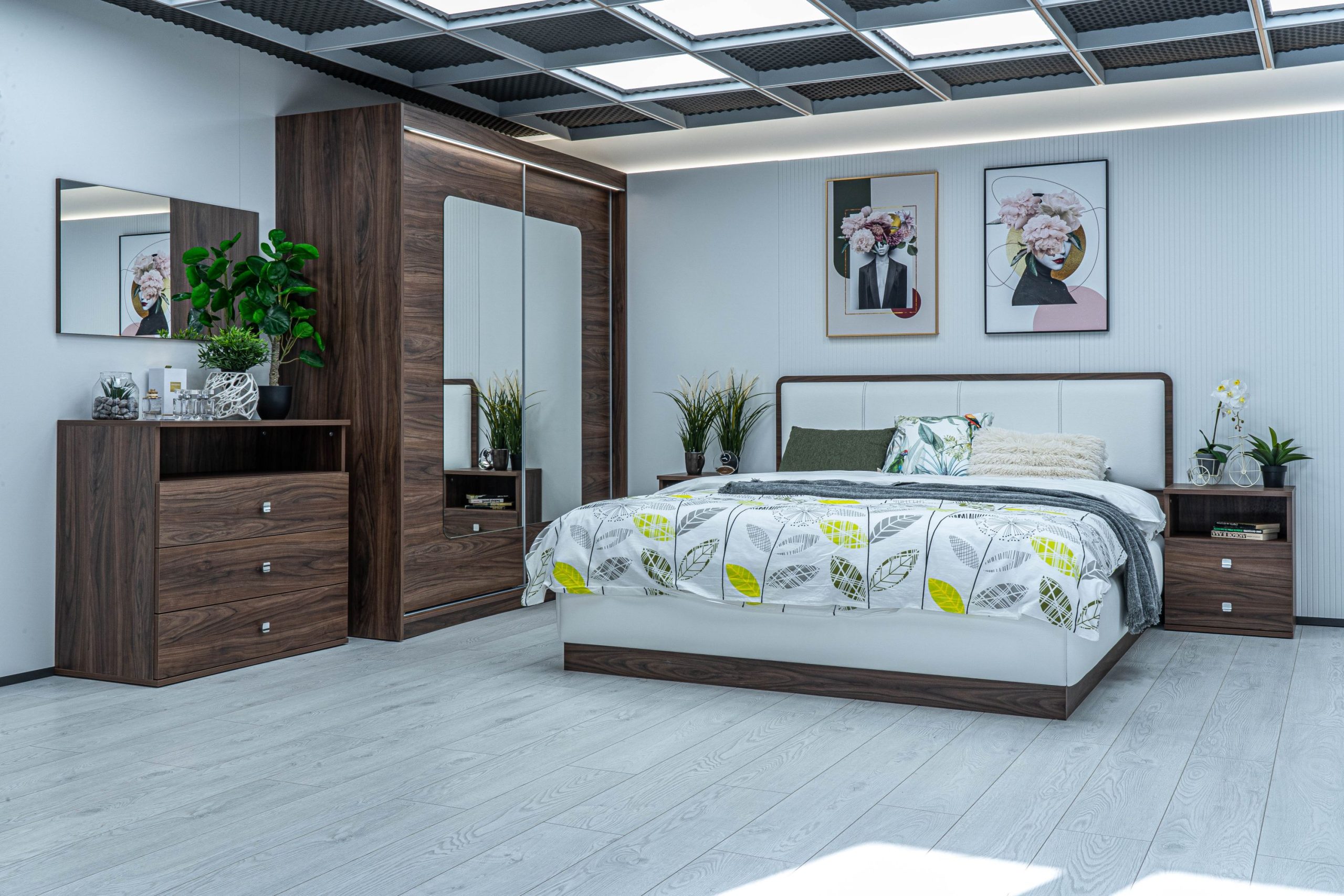 спален комплект „Софт“ е произведен от висококачествено ламинирано ПДЧ 18 мм, декор – тъмна ябълка. Всички части са обкантени от кант с дебелина 1,00 мм – фасетиран по ръбовете.