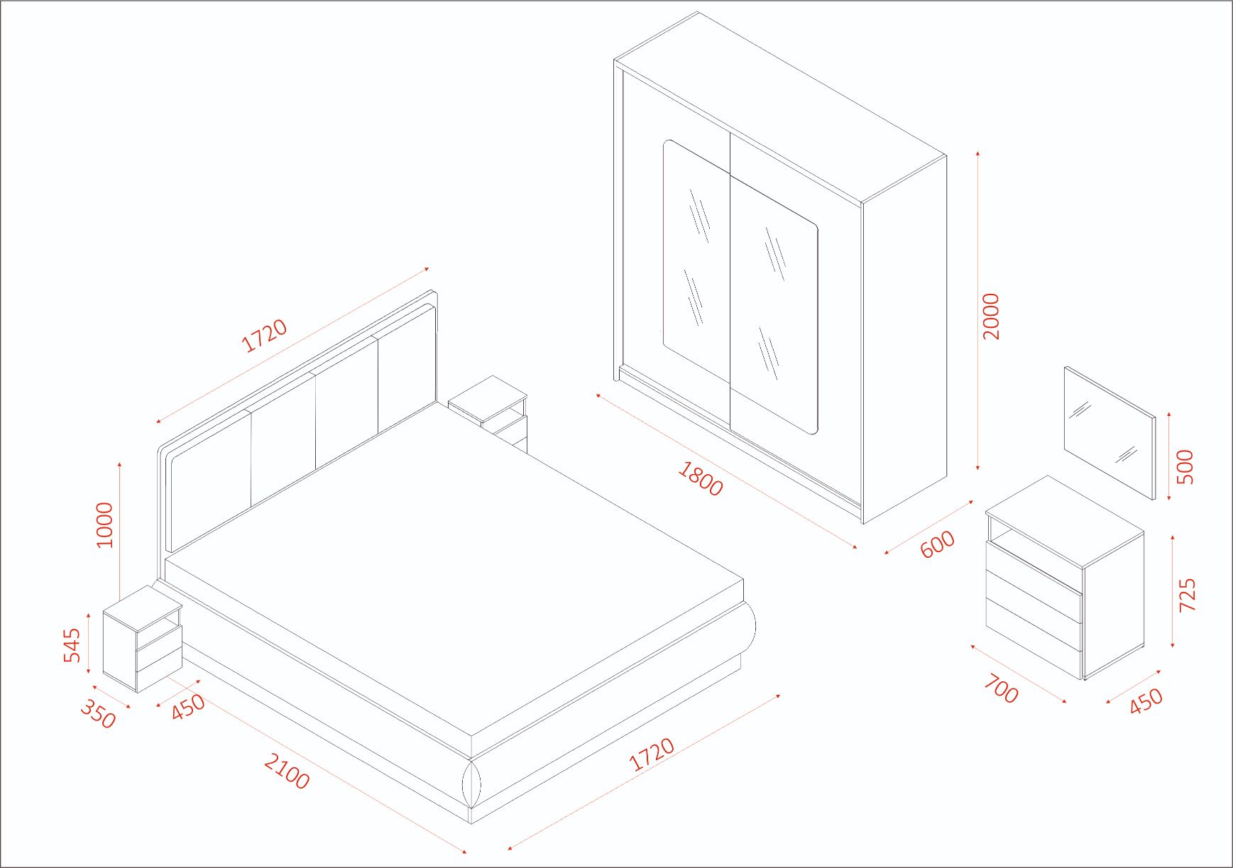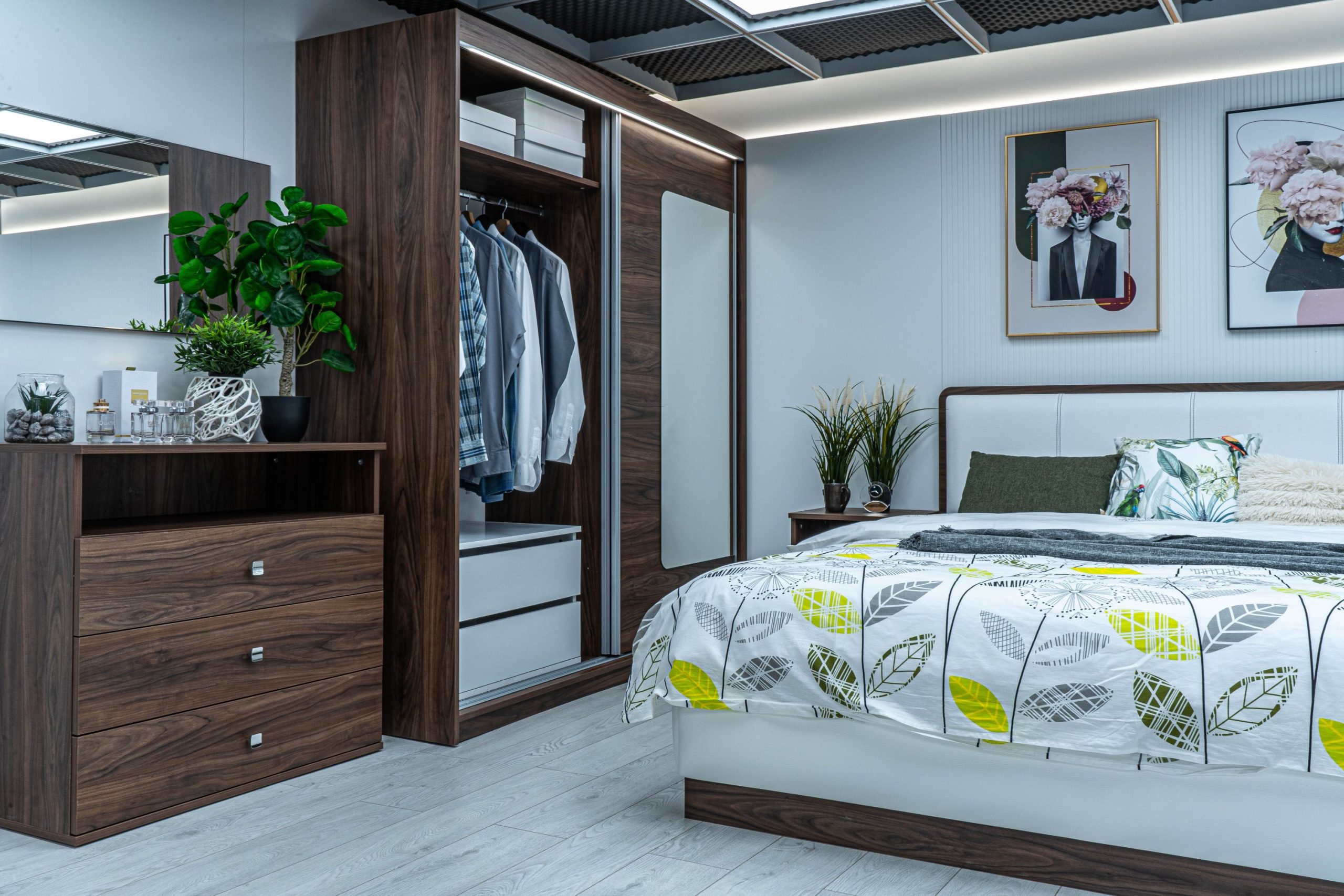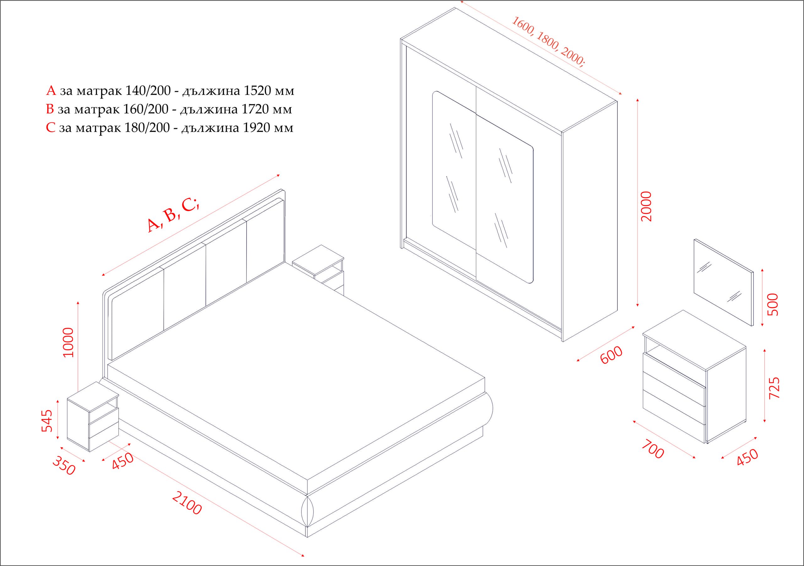 Гардероб: плъзгаща система вътрешно водене, вертикално разположени вградени алуминиеви „П“- образни кант дръжки с допълнително излят външен улей за лесно и удобно захващане, спомагащи ефективното плъзгане на системата – гарантиращи устойчивост и здравина на вратите, използвани са сглобки – скрит монтаж, метални рафтоносачи за стабилност на рафтовете, лост за дрехи – метален – форма – елипса – покритие – никел, цялата конструкция на гардероба е монтирана върху метални реглажни „пети“ – осигуряващи изрядна нивелация на изделието и правилната му експлоатация, практични огледала и на двете врати – 1 бр.