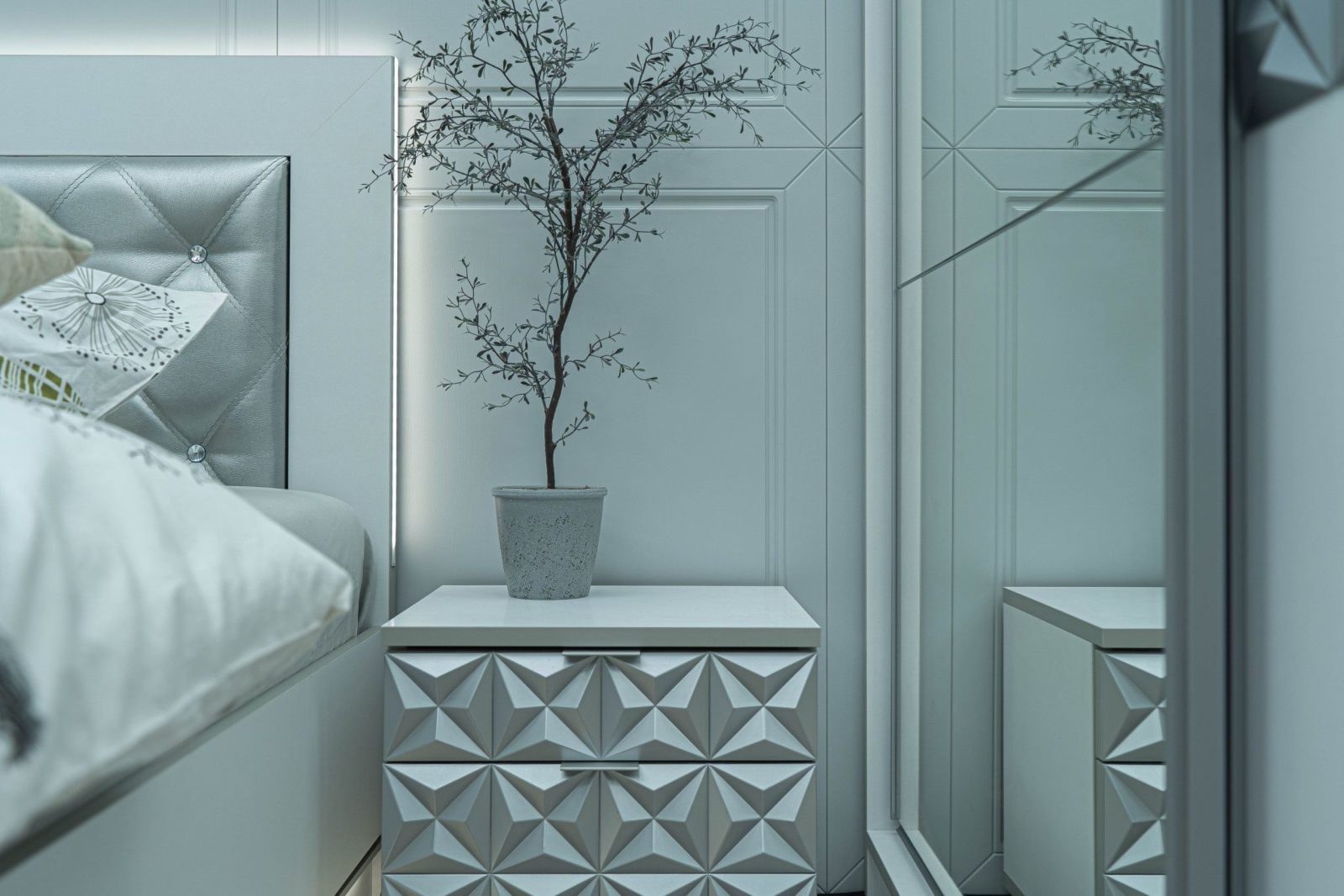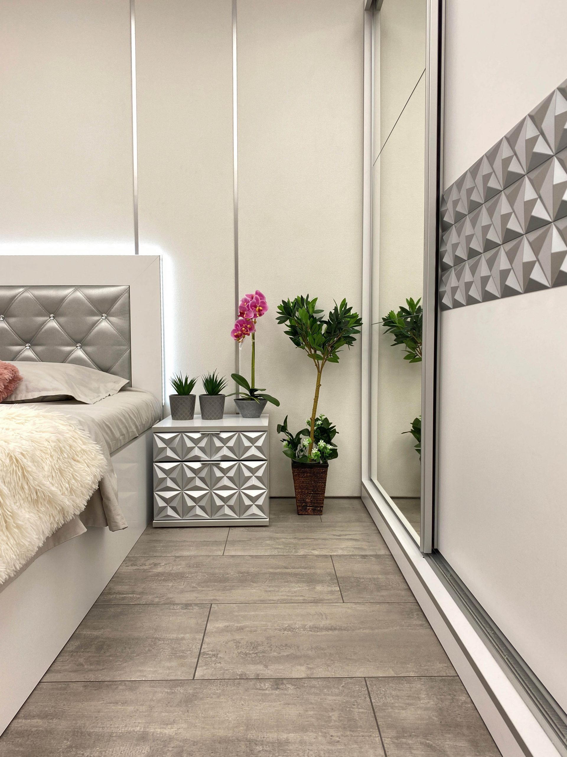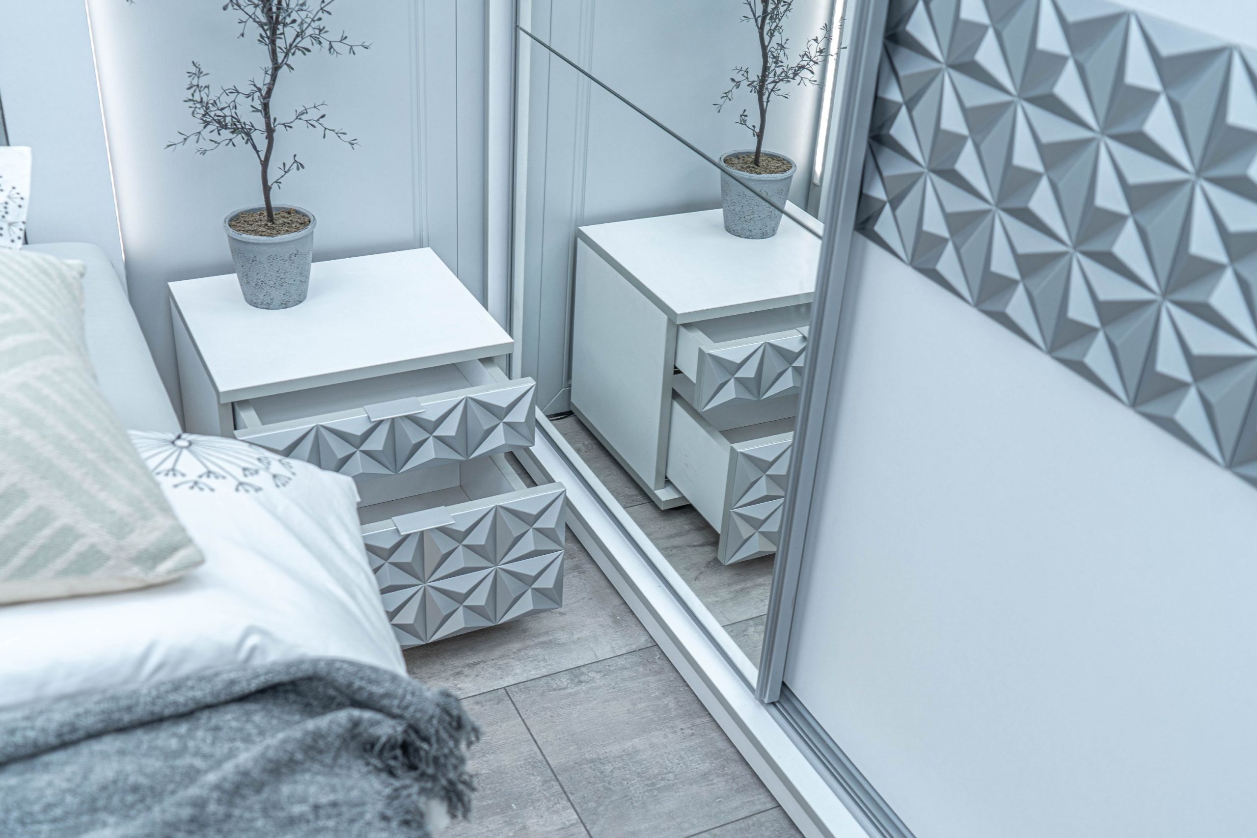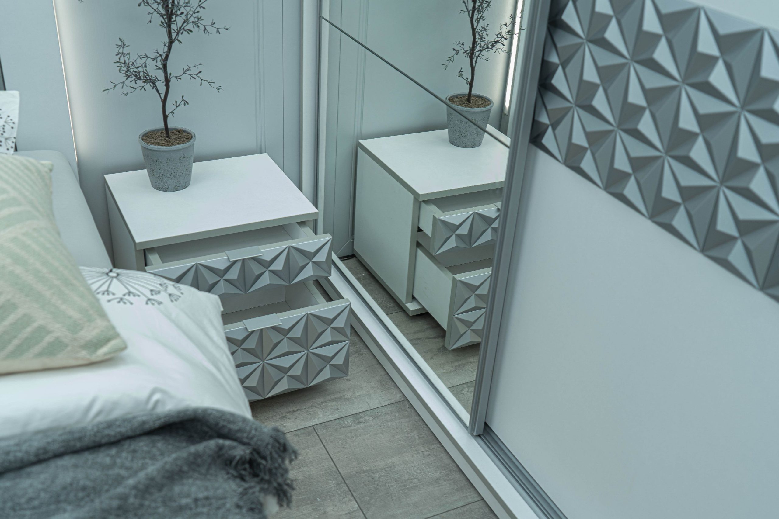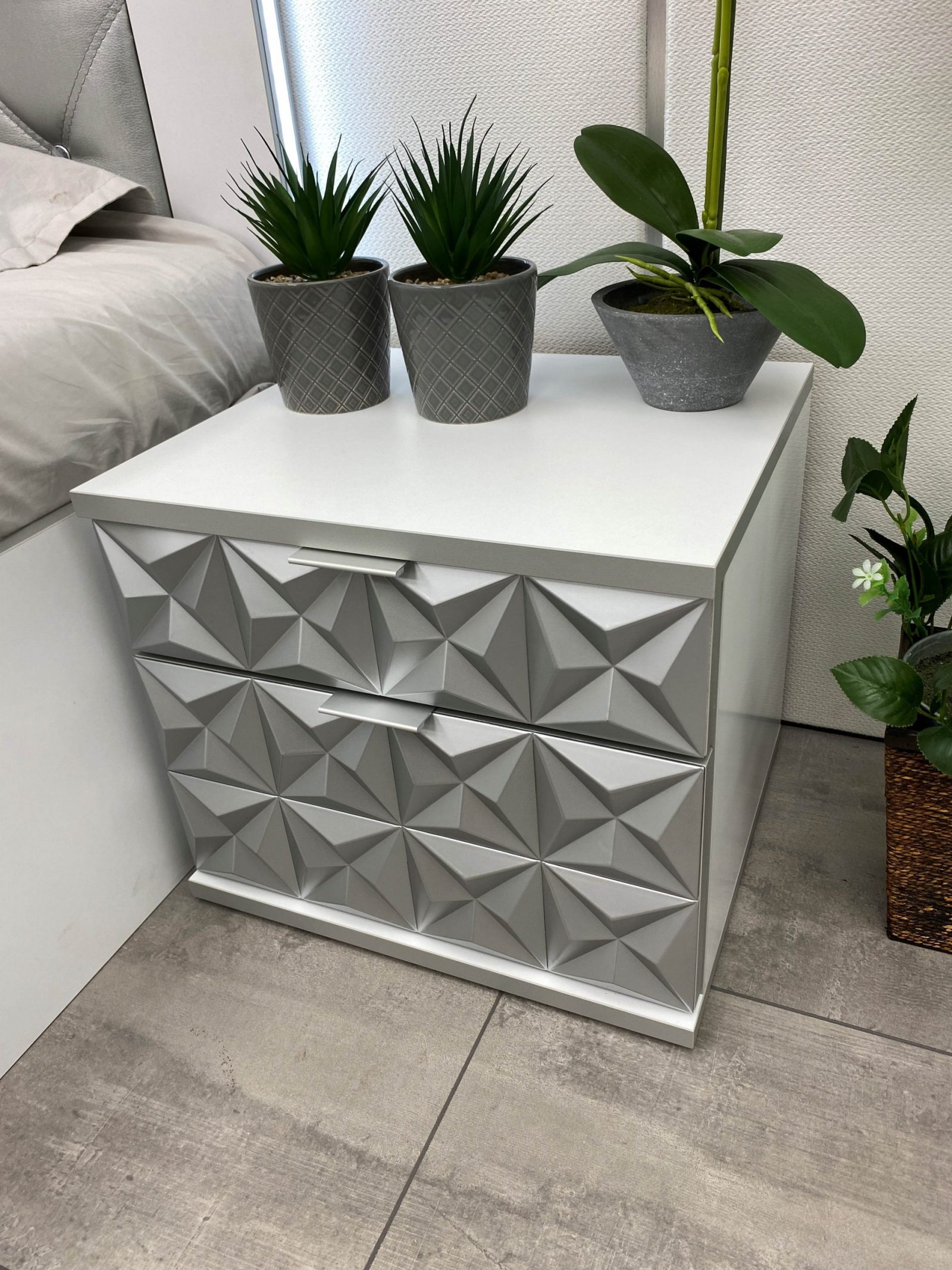 Нощно шкафче: две практични чекмеджета, система скрити водачи Quadro Hettich – плавно затваряне, челото на чекмеджето е изцяло от луксозни сребърни призми, вградени по канта дръжки – 2 бр.