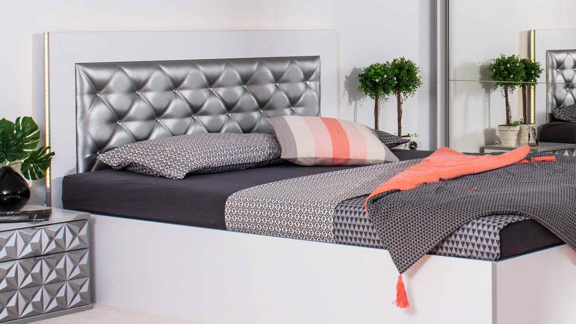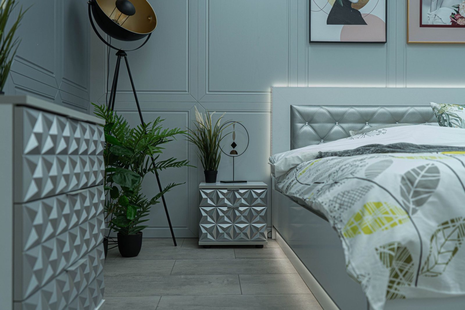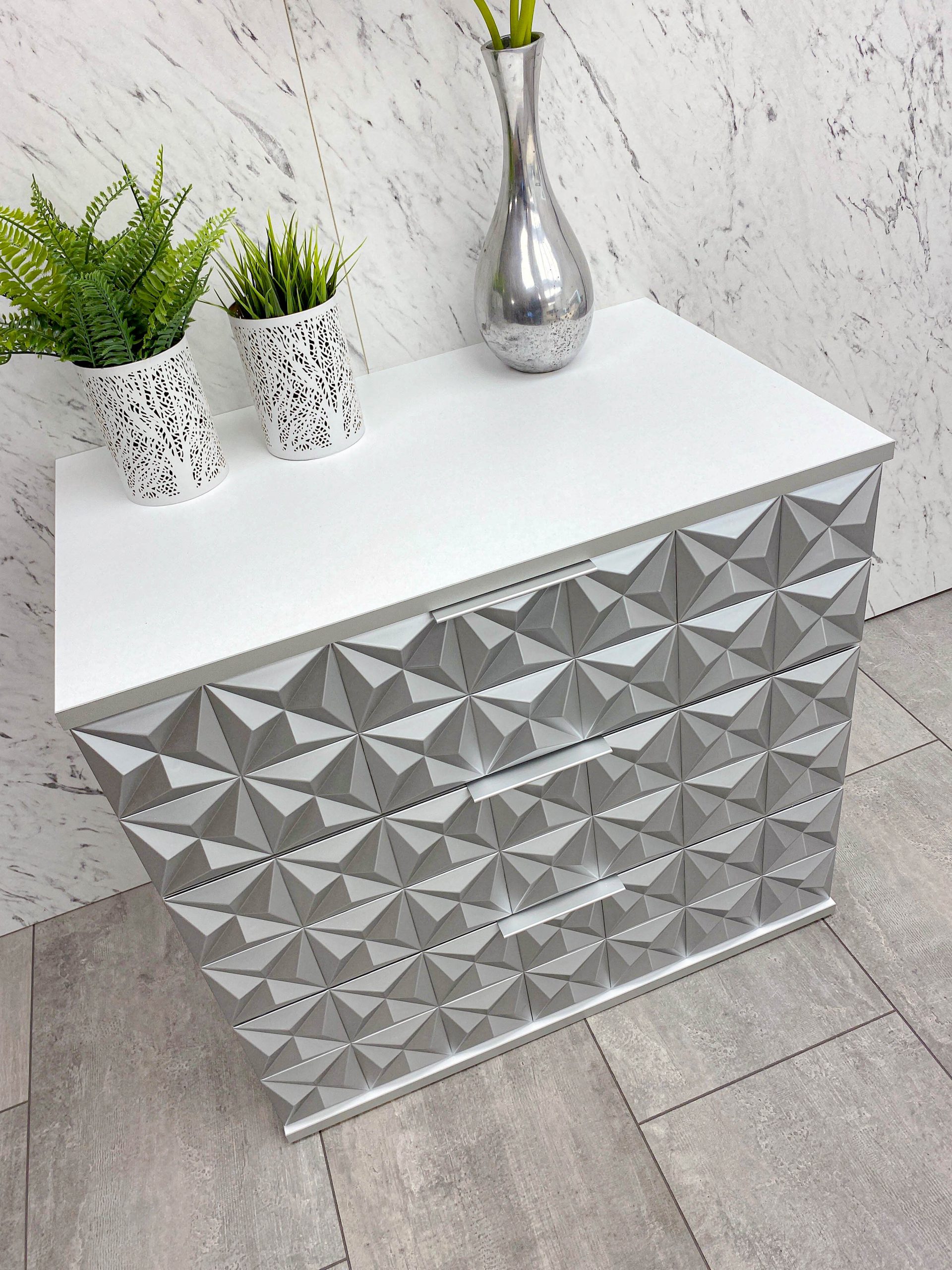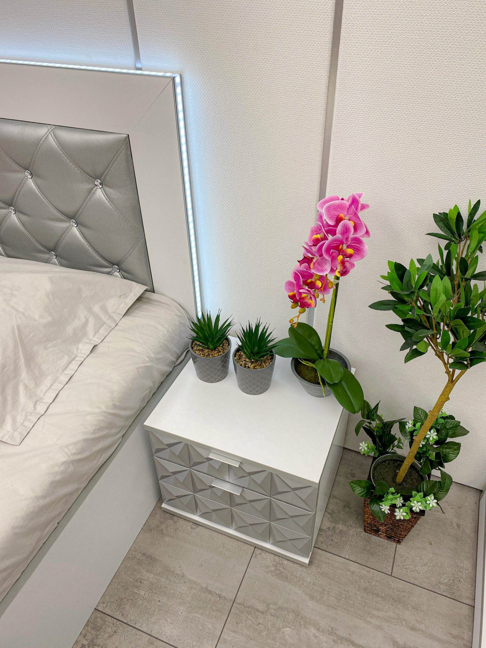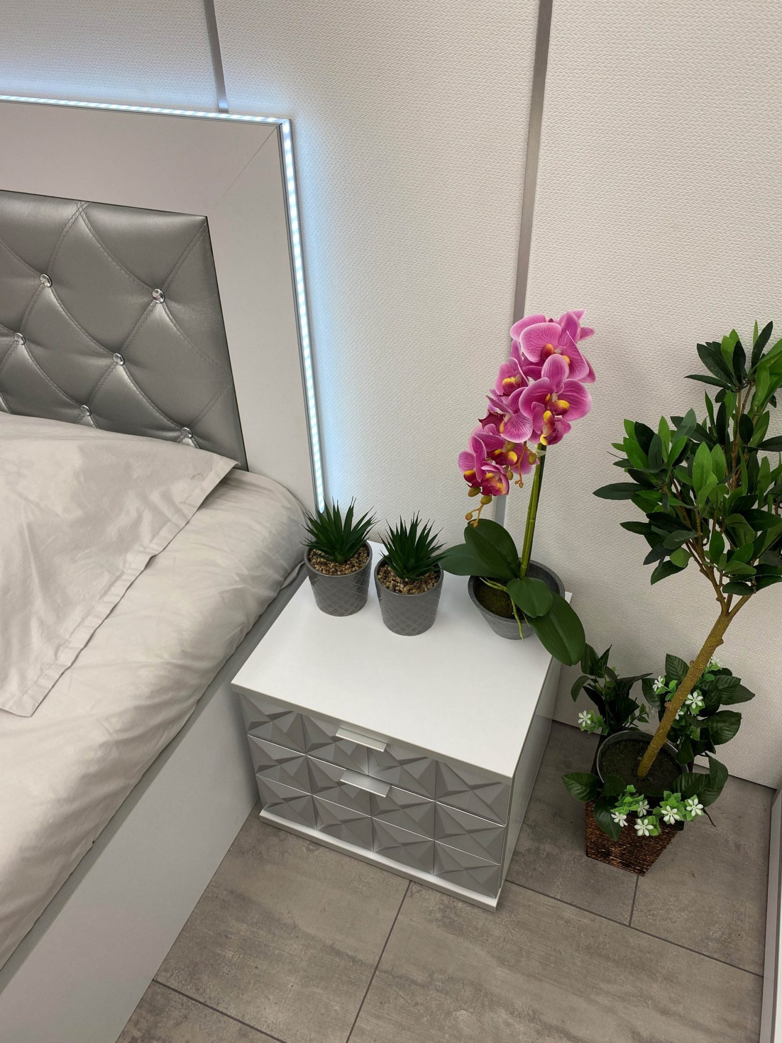 Нощно шкафче: две практични чекмеджета, система скрити водачи Quadro Hettich – плавно затваряне, челото на чекмеджето е изцяло от луксозни сребърни призми, вградени по канта дръжки – 2 бр.