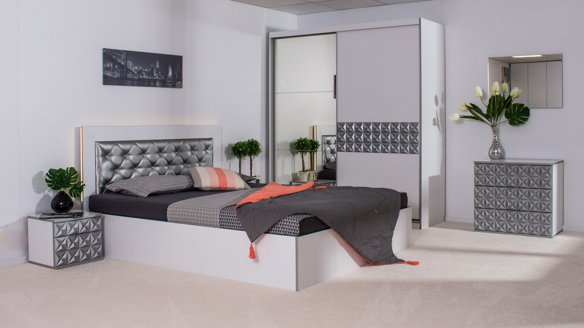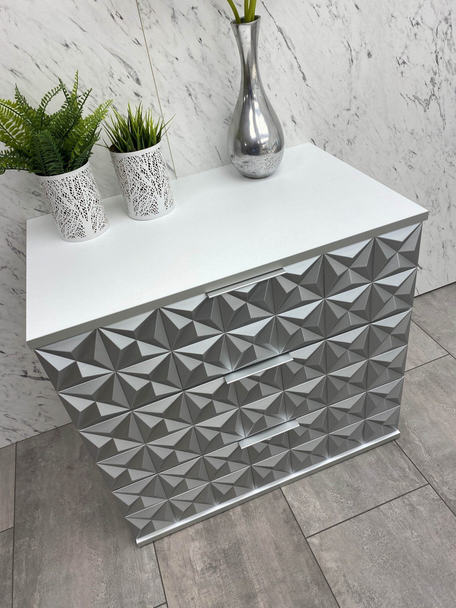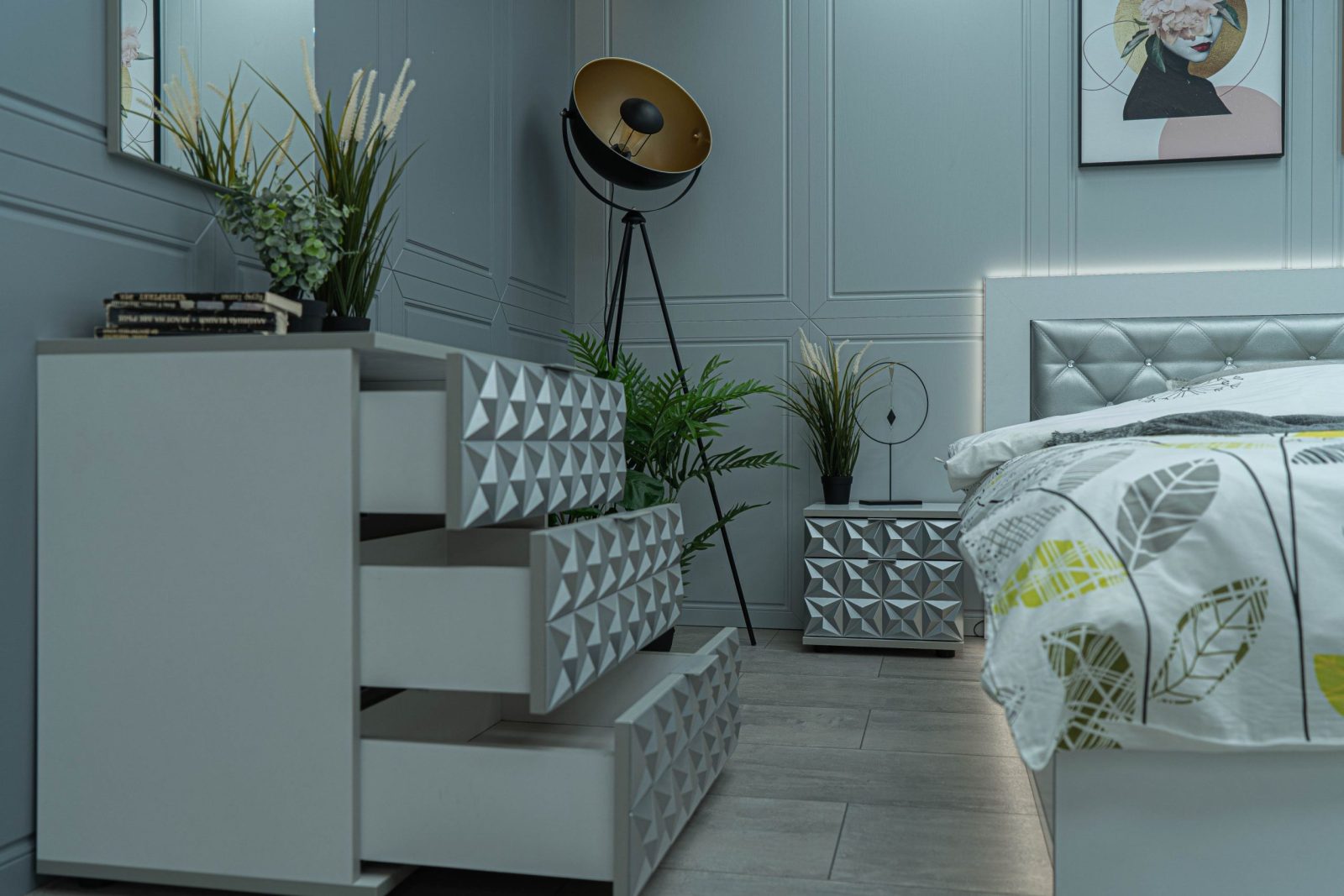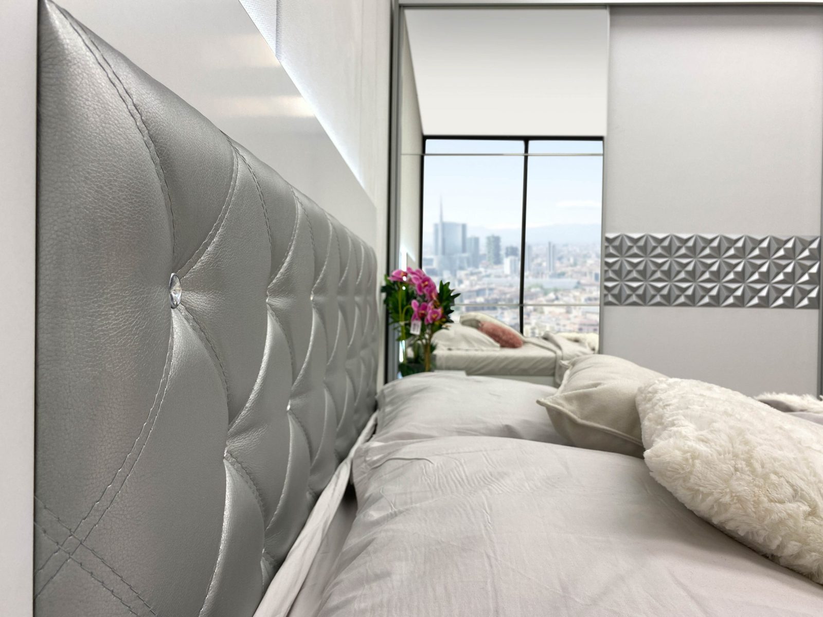 Нощно шкафче: две практични чекмеджета, система скрити водачи Quadro Hettich – плавно затваряне, челото на чекмеджето е изцяло от луксозни сребърни призми, вградени по канта дръжки – 2 бр.