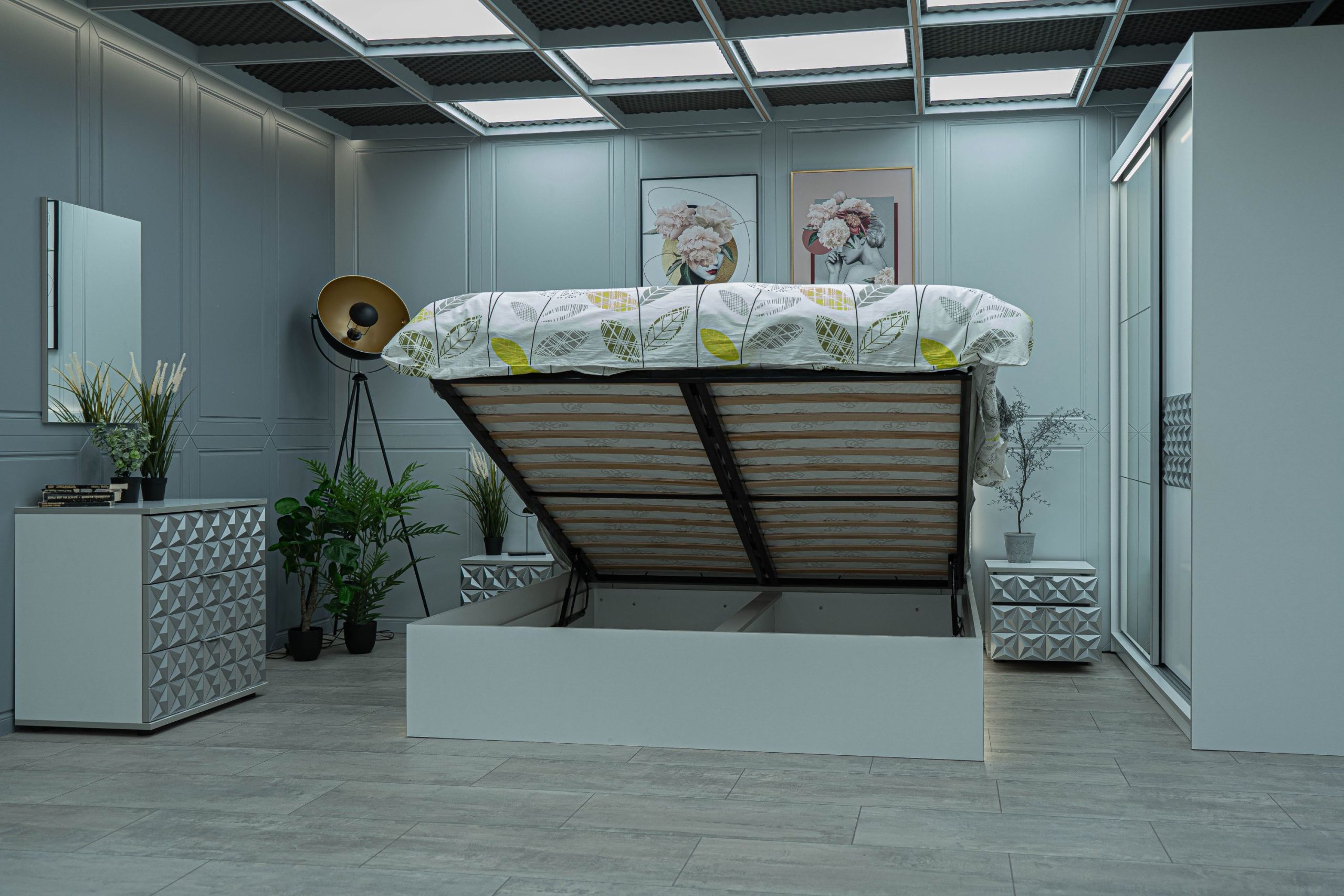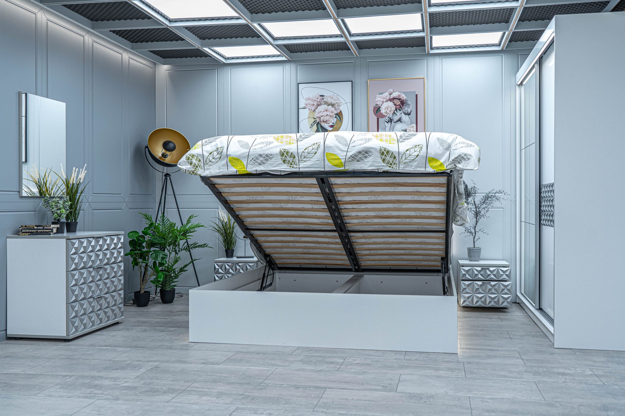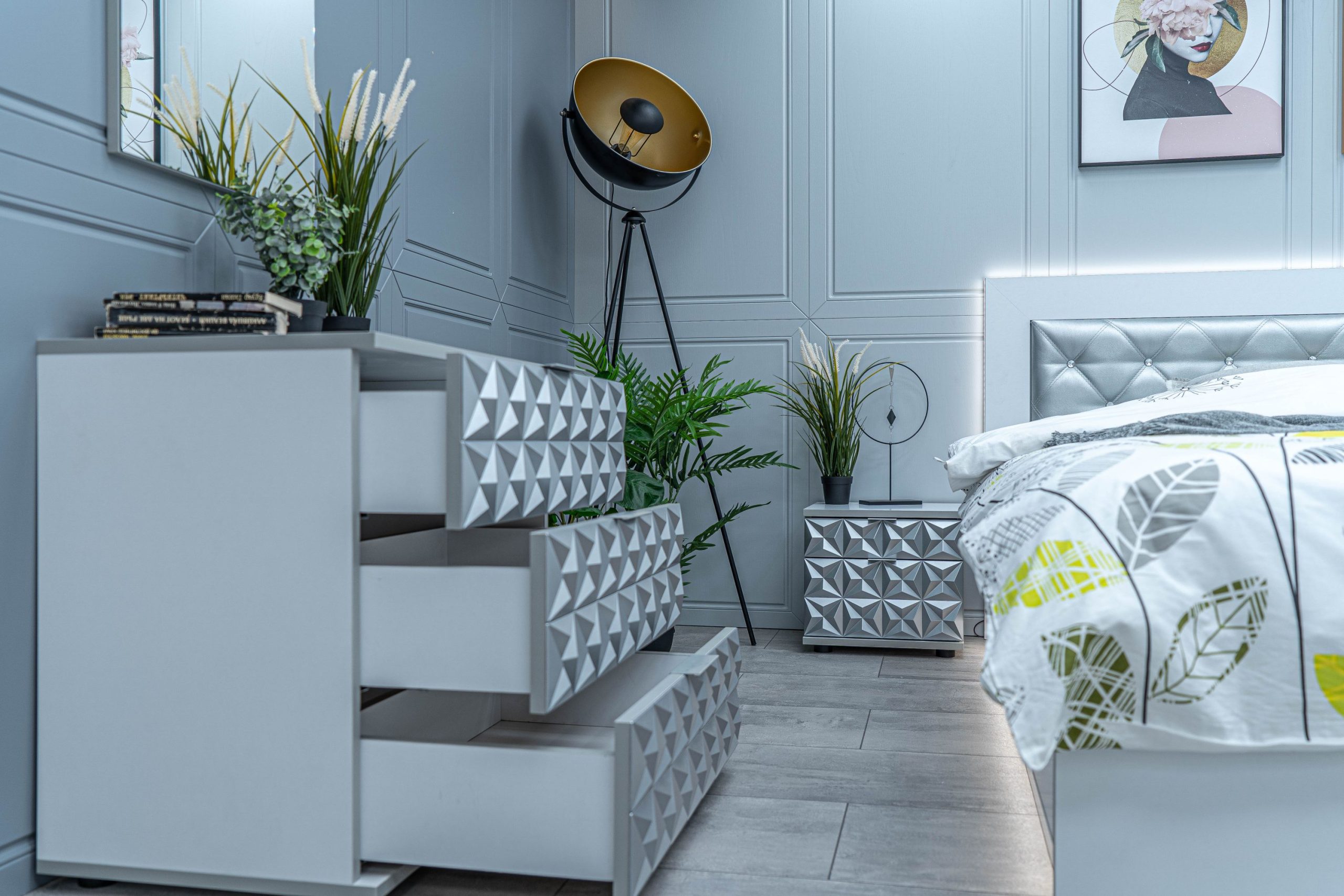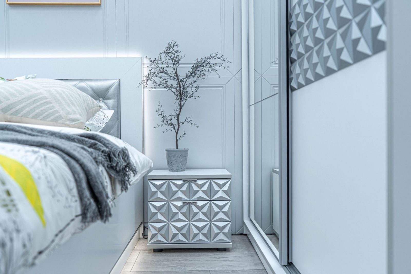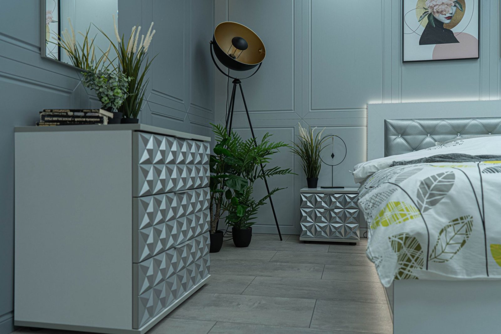 Нощно шкафче: две практични чекмеджета, система скрити водачи Quadro Hettich – плавно затваряне, челото на чекмеджето е изцяло от луксозни сребърни призми, вградени по канта дръжки – 2 бр.