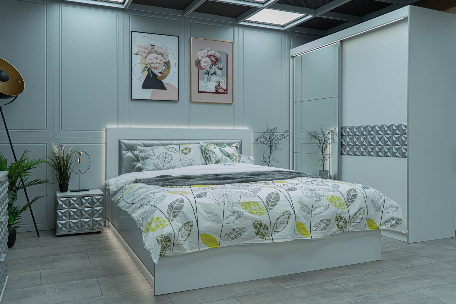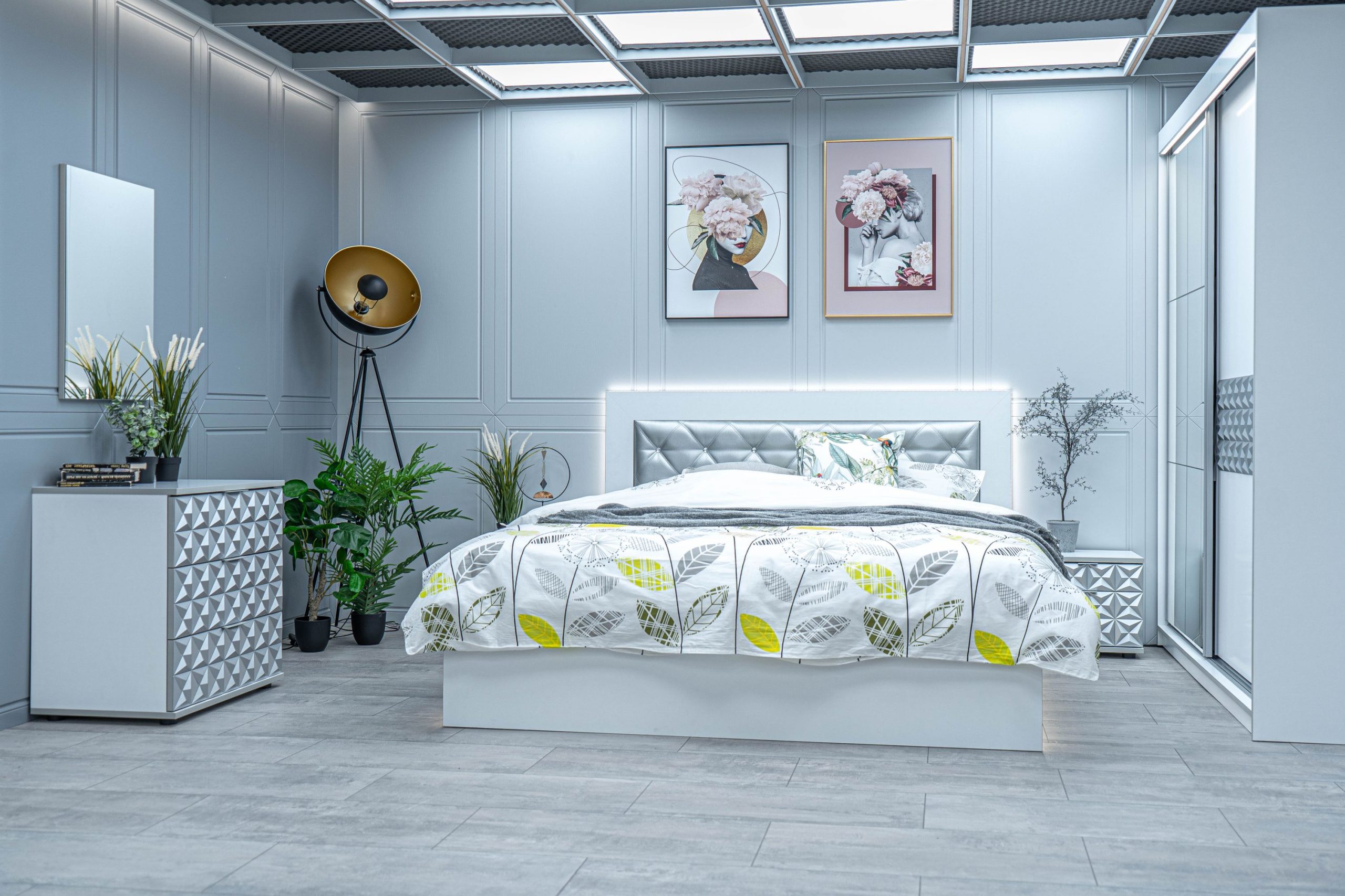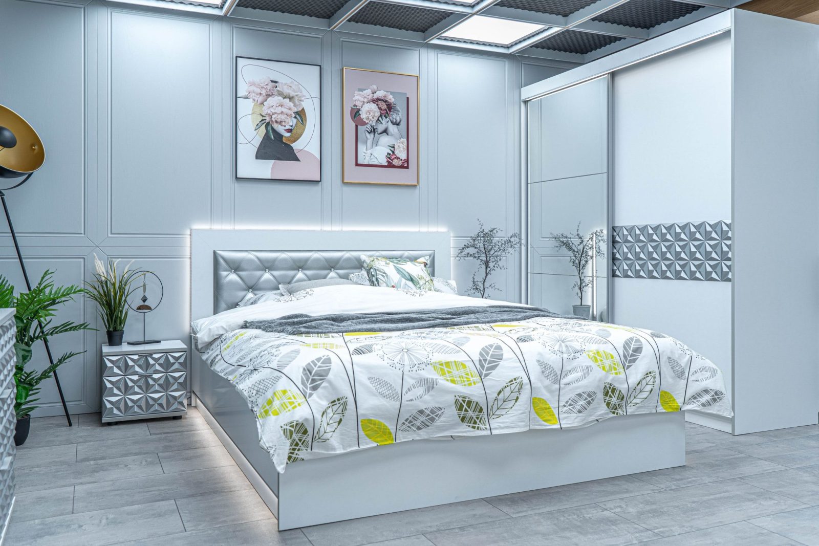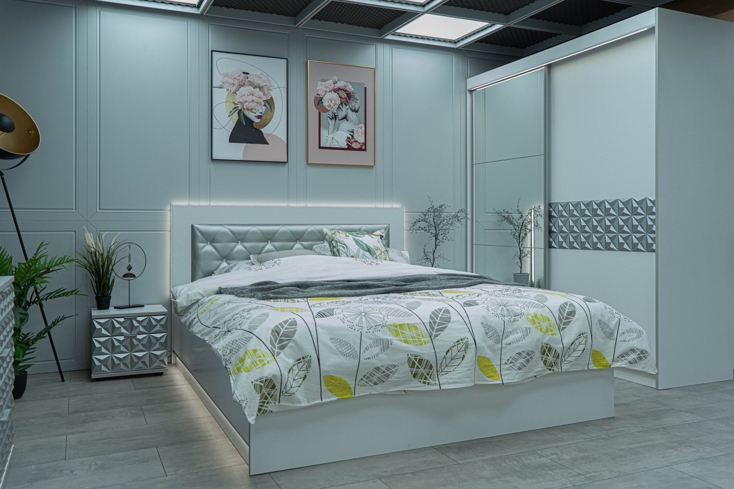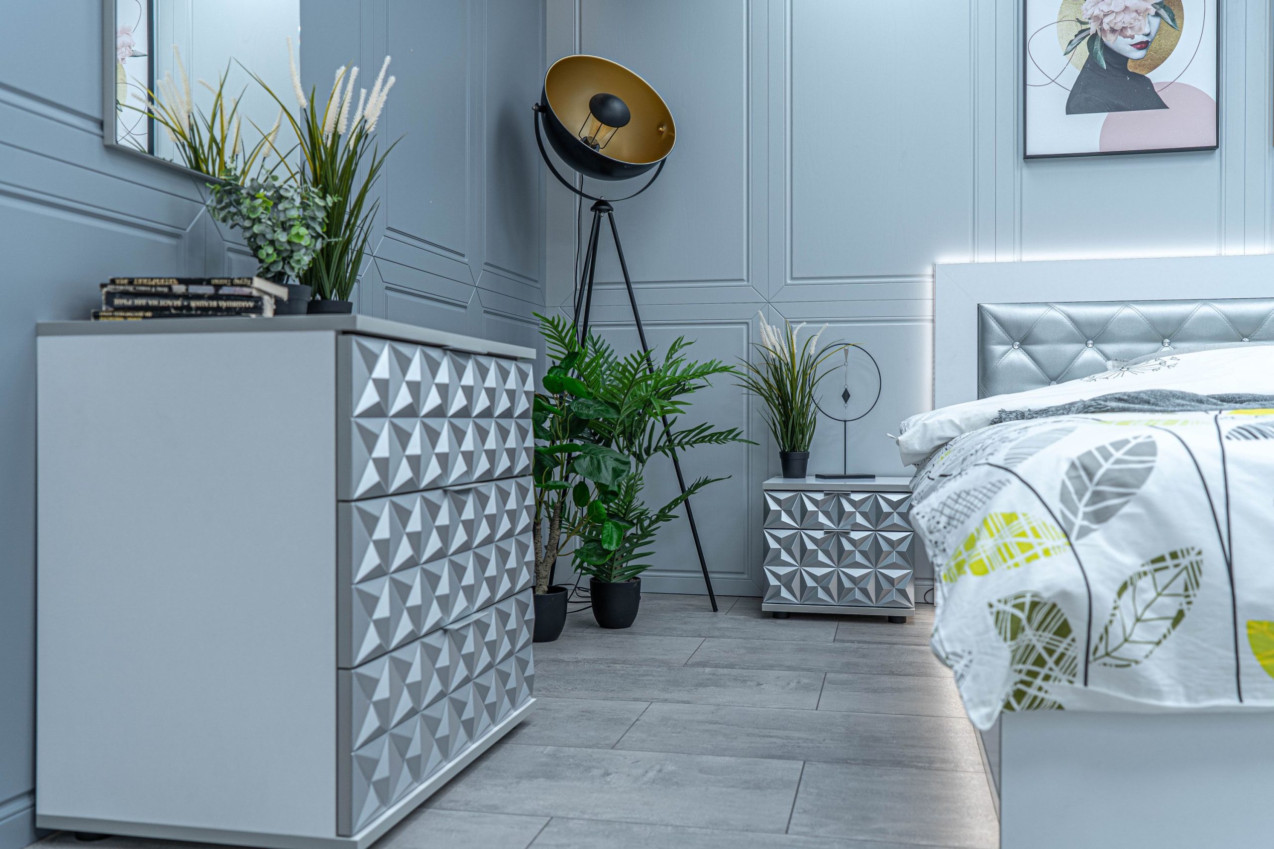Нощно шкафче: две практични чекмеджета, система скрити водачи Quadro Hettich – плавно затваряне, челото на чекмеджето е изцяло от луксозни сребърни призми, вградени по канта дръжки – 2 бр.