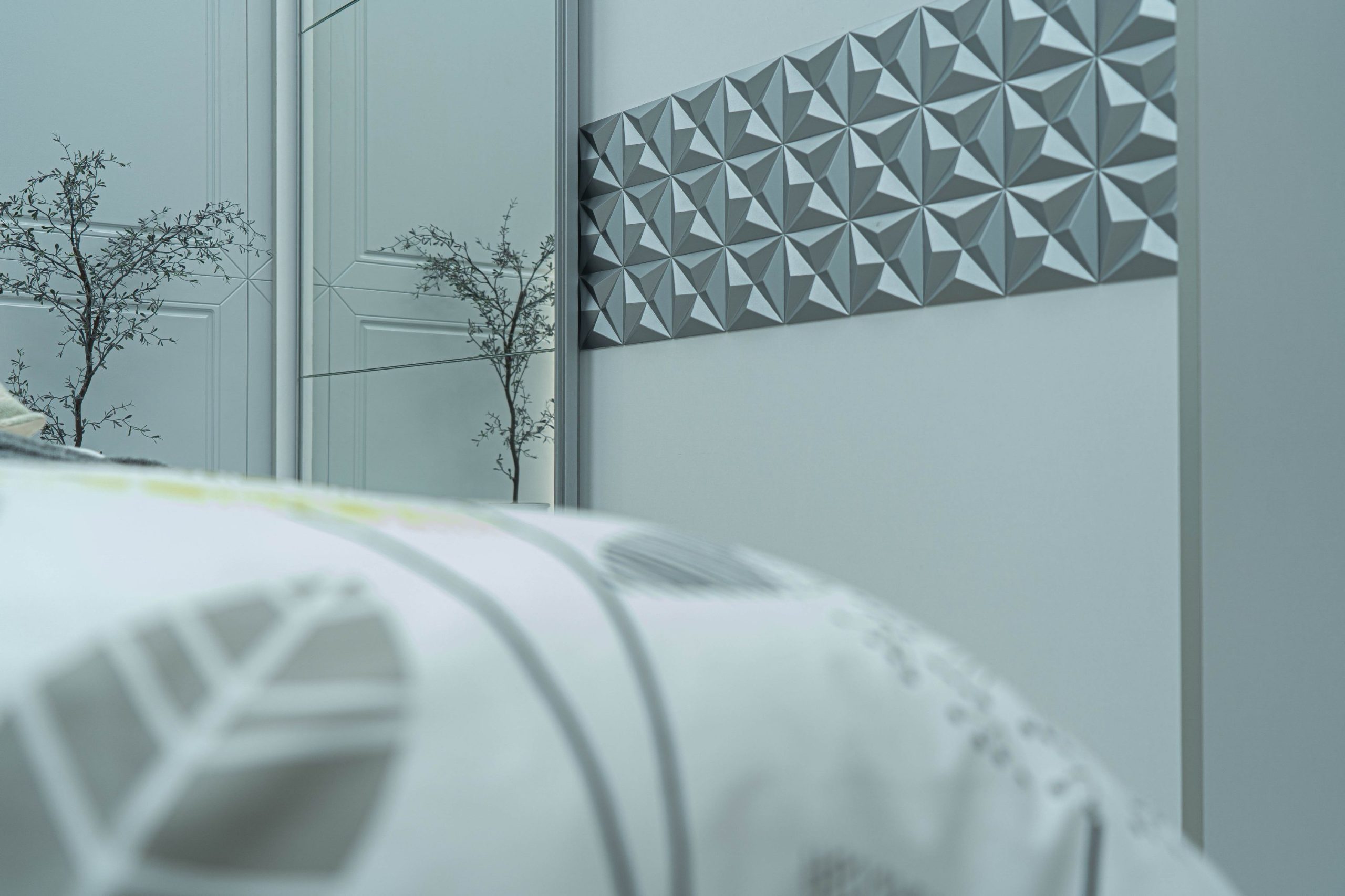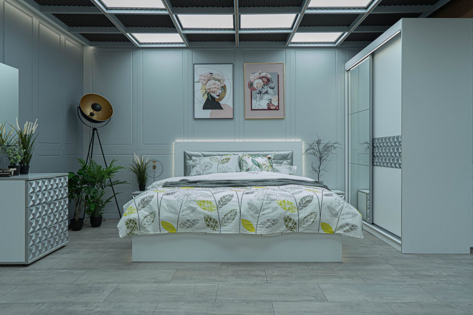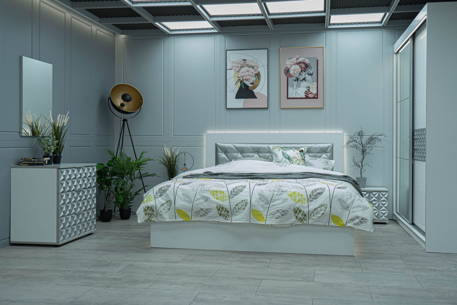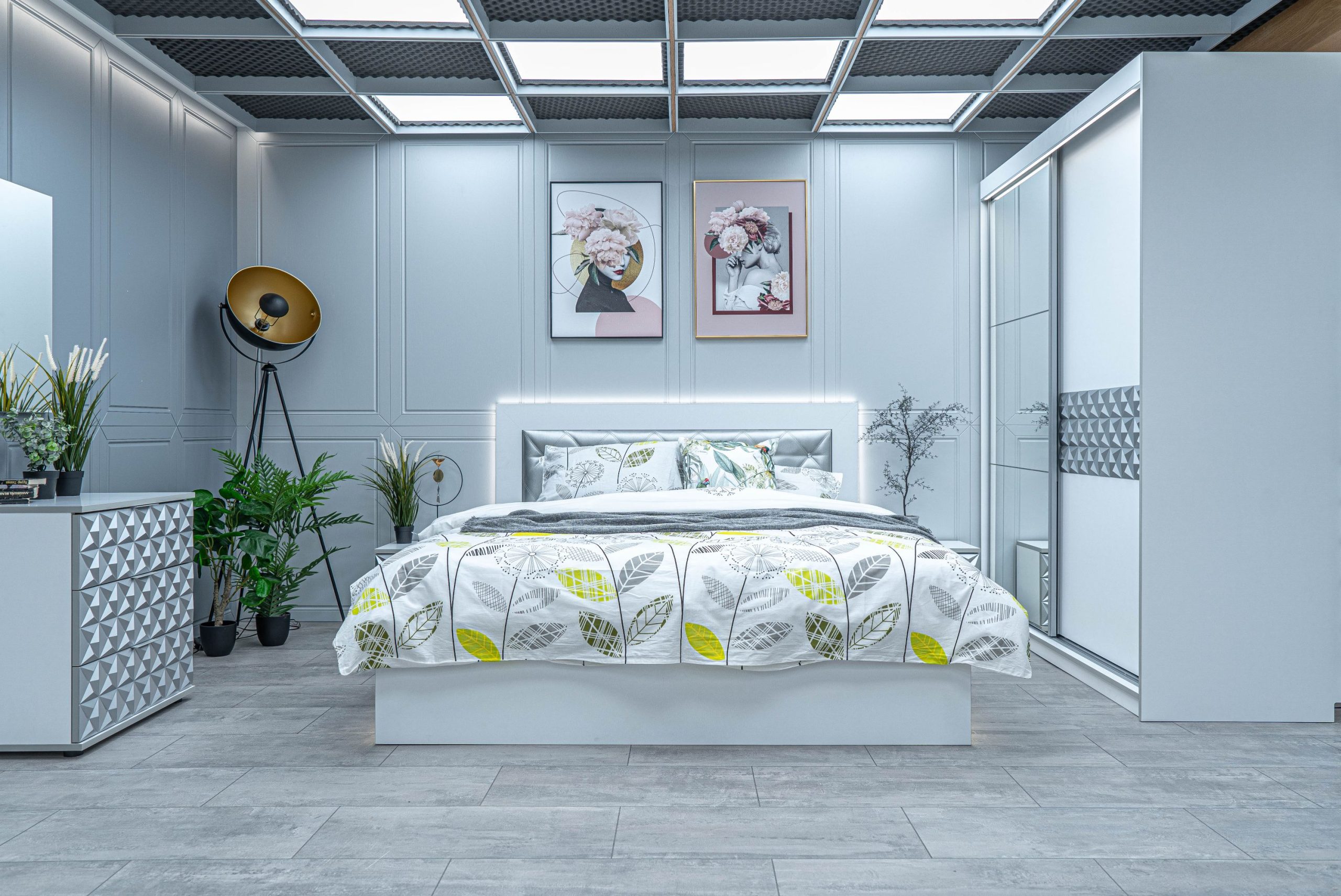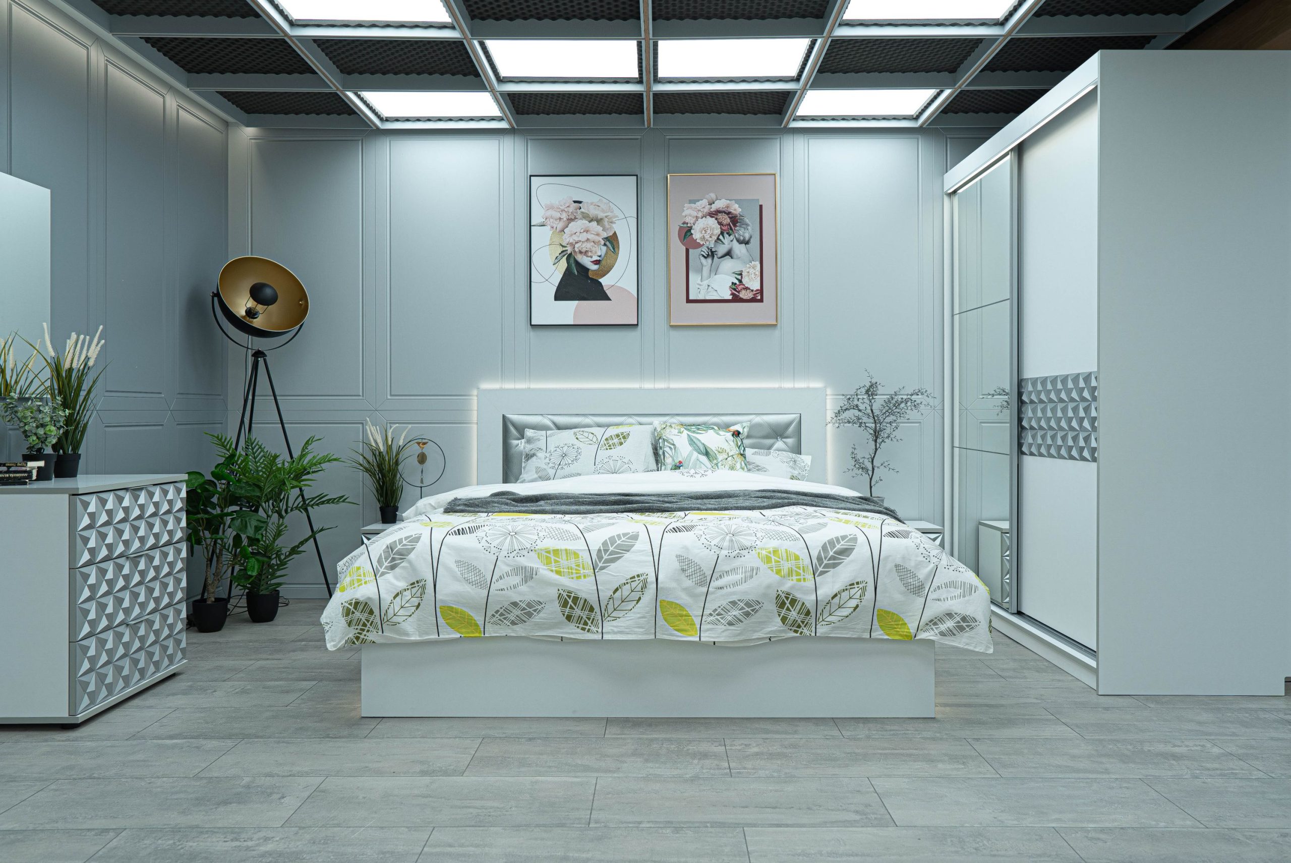 Нощно шкафче: две практични чекмеджета, система скрити водачи Quadro Hettich – плавно затваряне, челото на чекмеджето е изцяло от луксозни сребърни призми, вградени по канта дръжки – 2 бр.