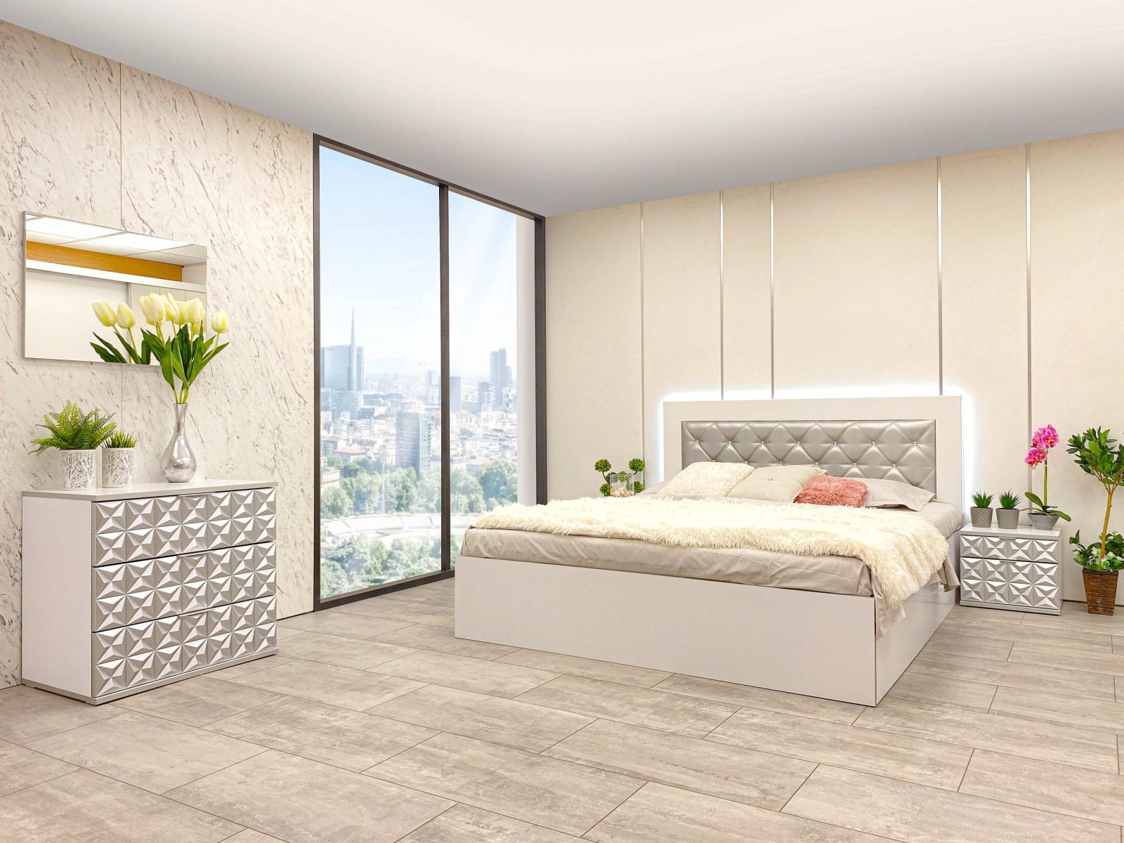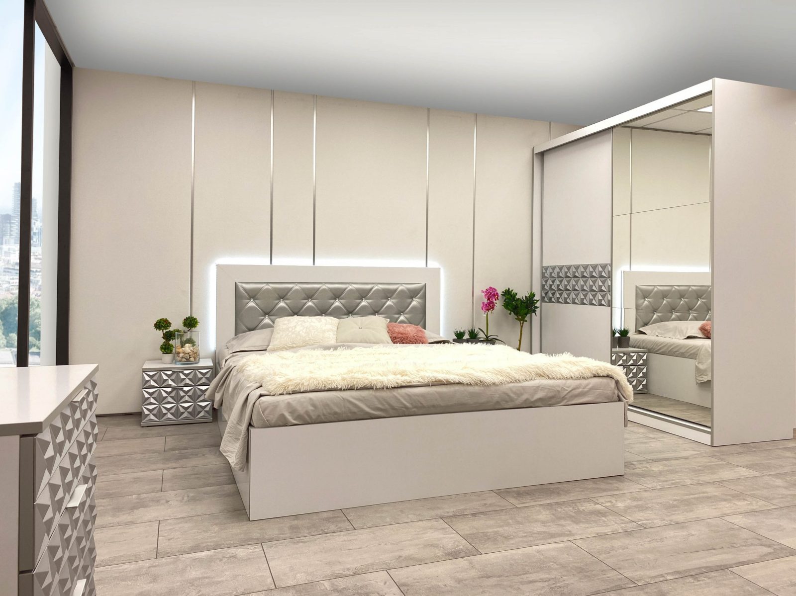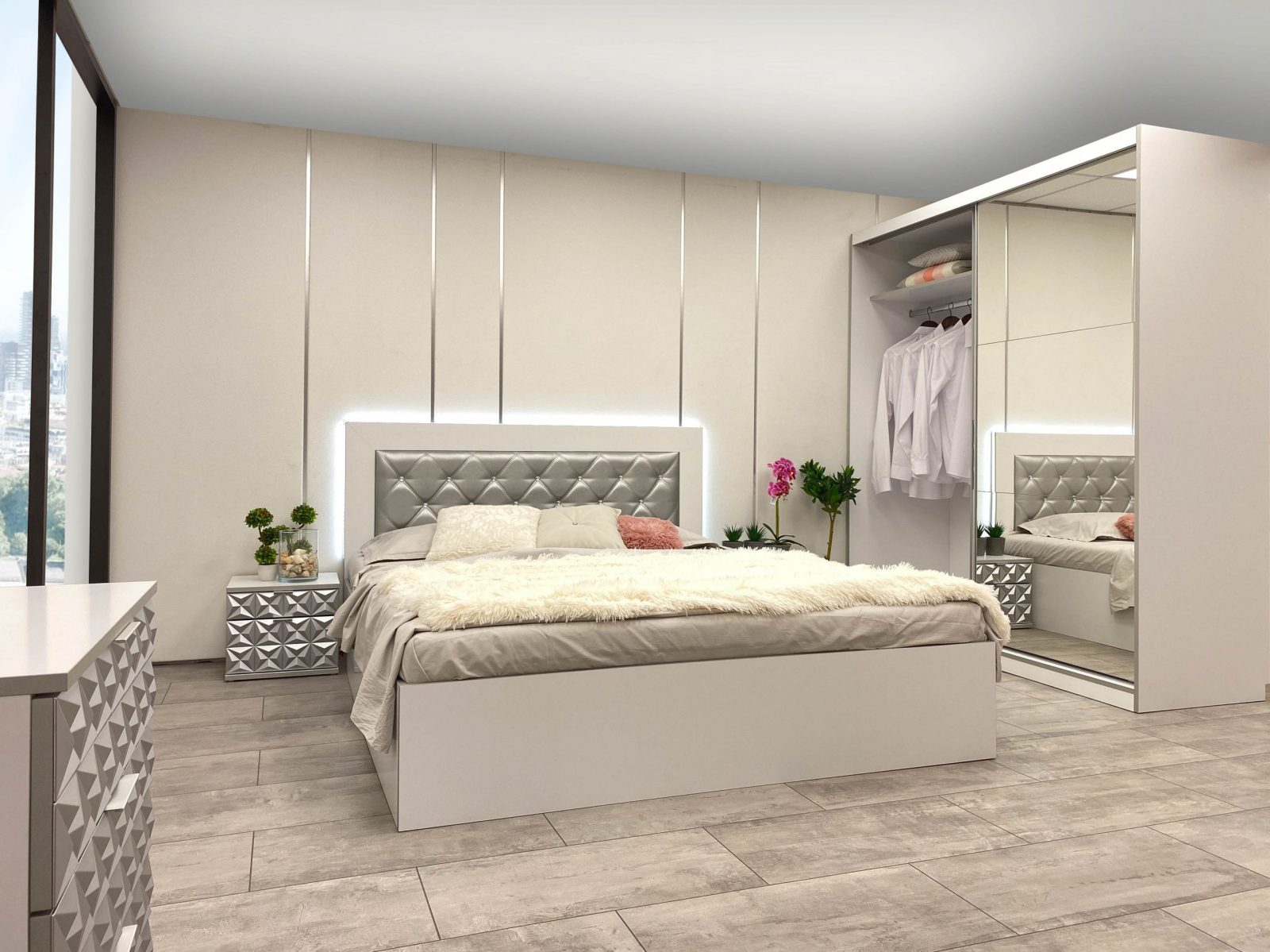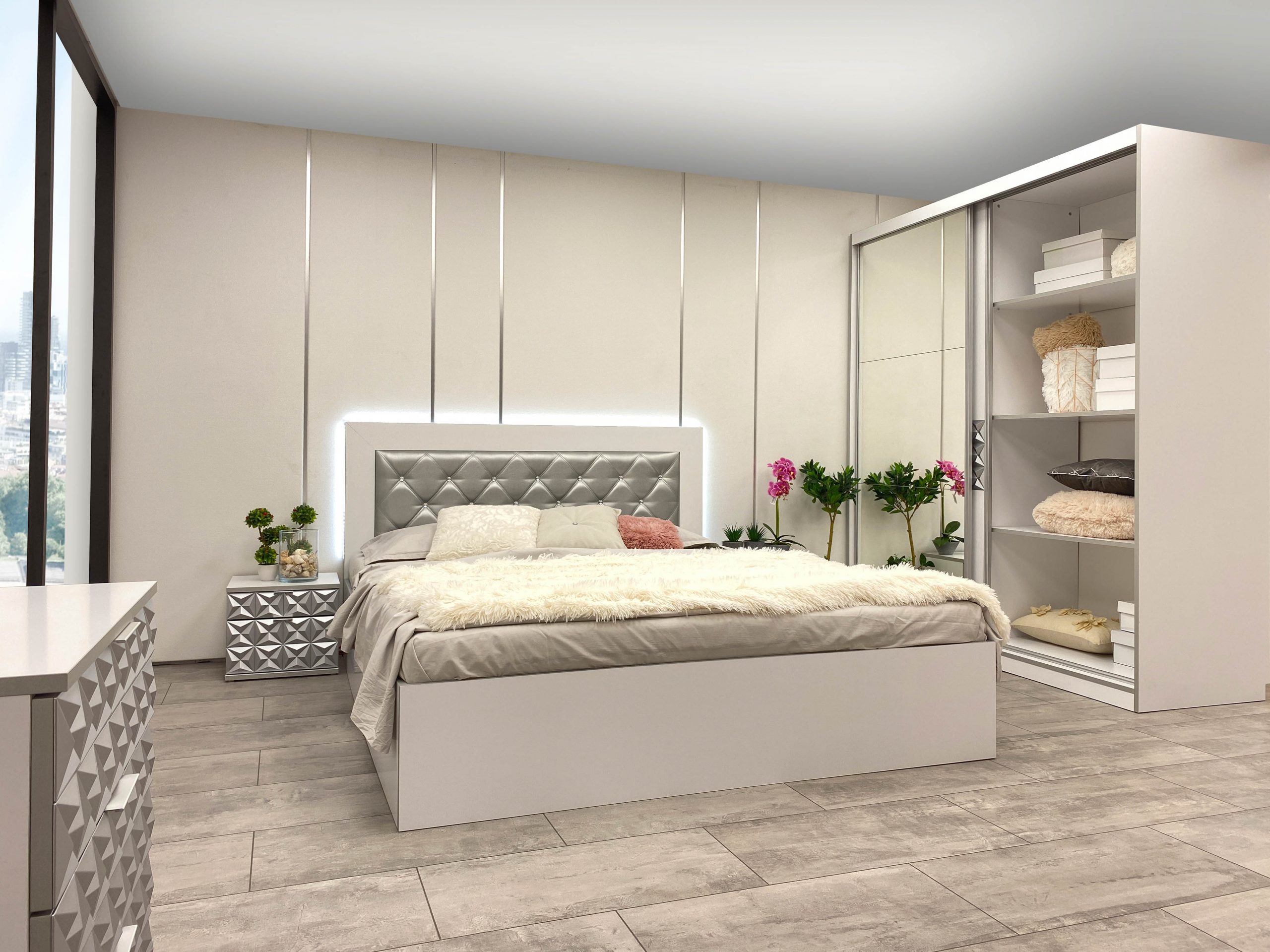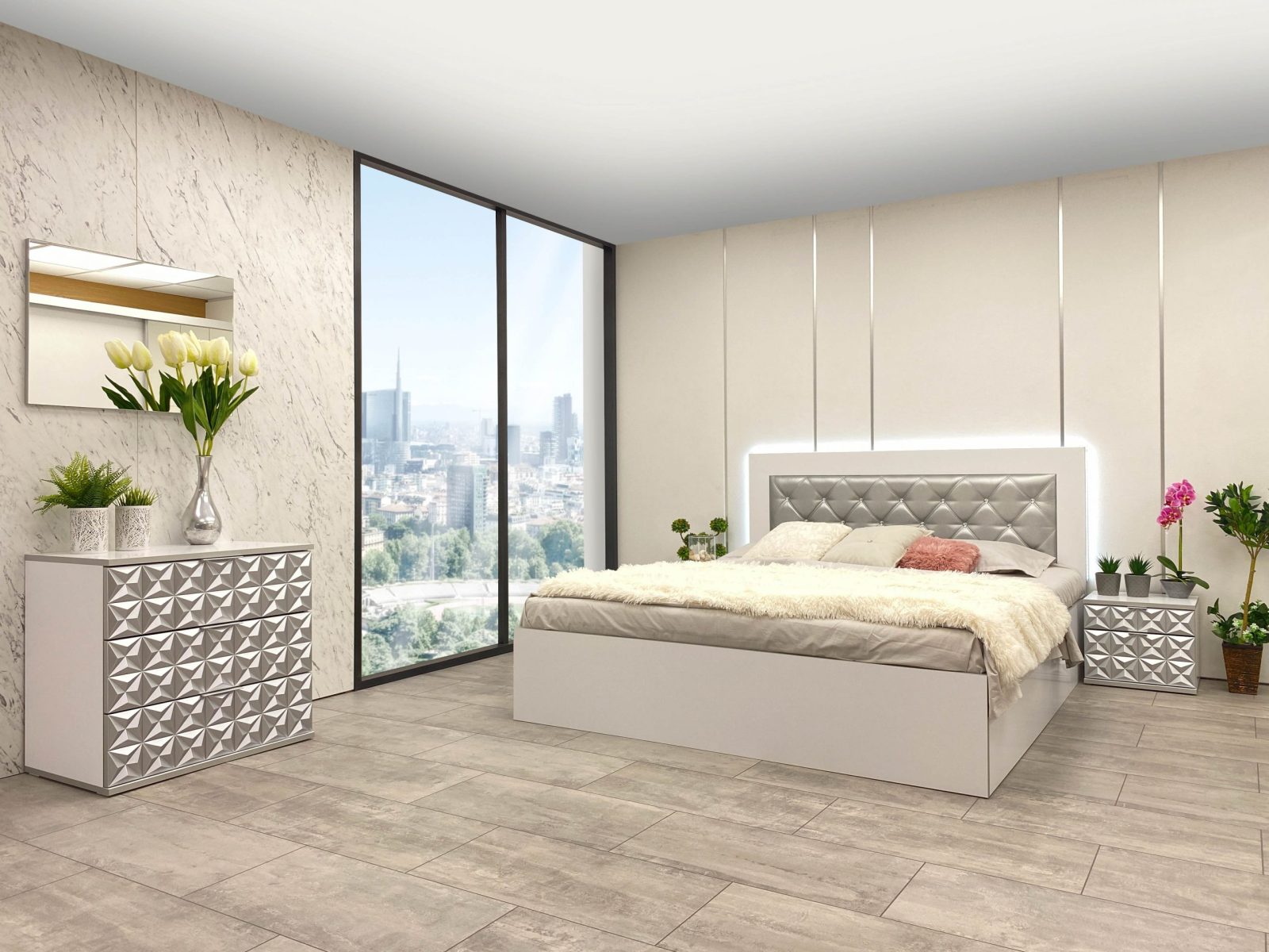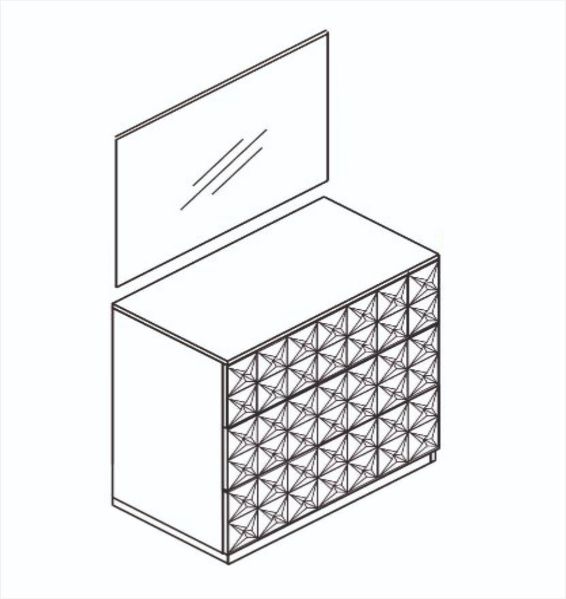 Скрин с огледало -Опция! три практични чекмеджета, система скрити водачи Quadro Hettich – плавно затваряне, пано с вградено – огледало, челата на скрина са изцяло от луксозни сребърни призми, вградени по канта дръжки, огледалото е ориентирано за стенен монтаж – 1 бр. в к-т;