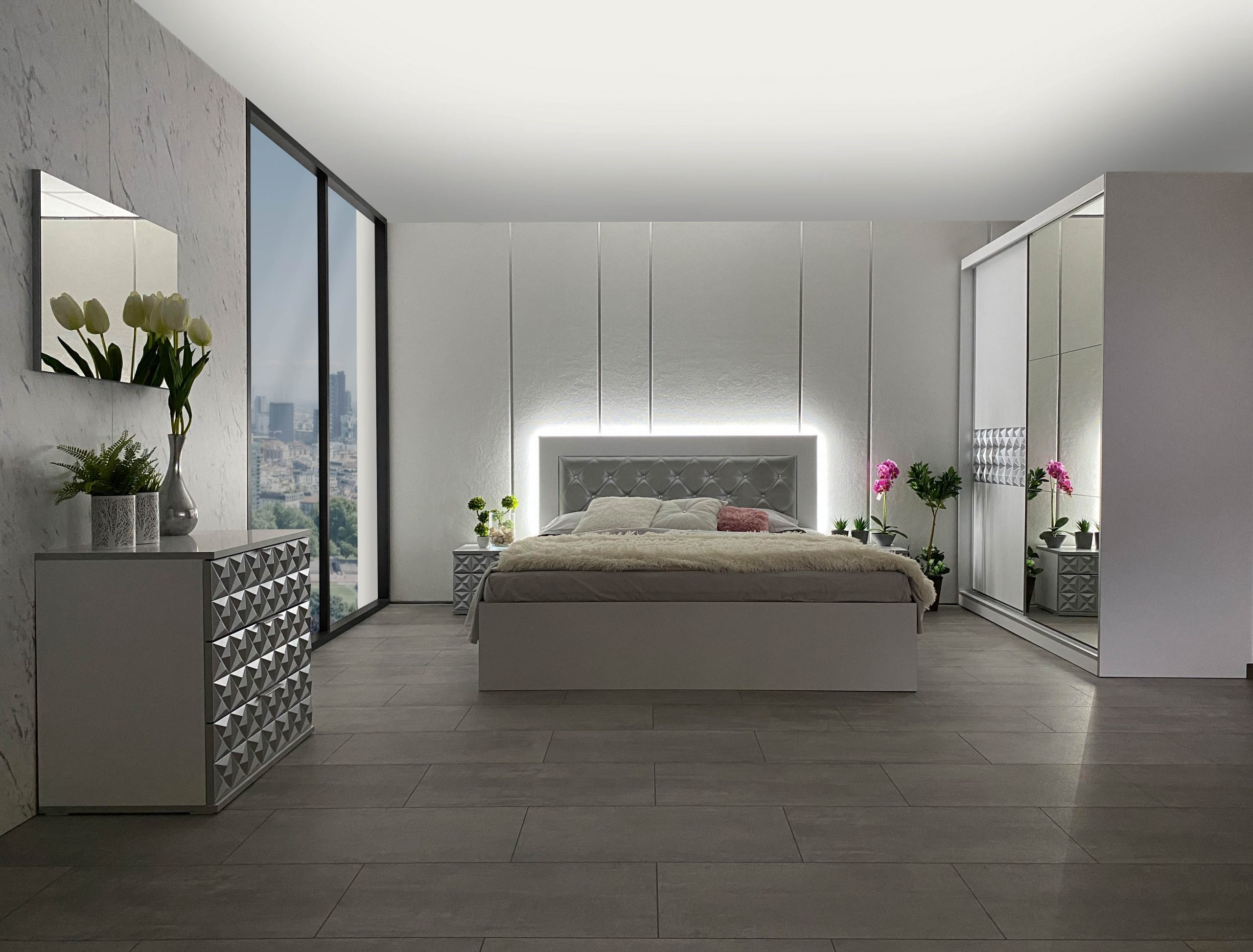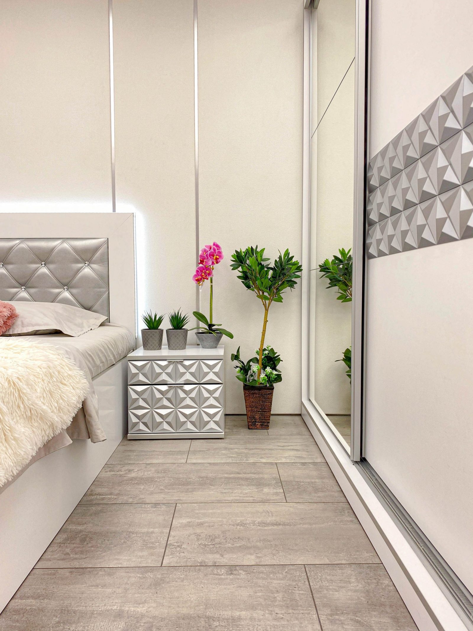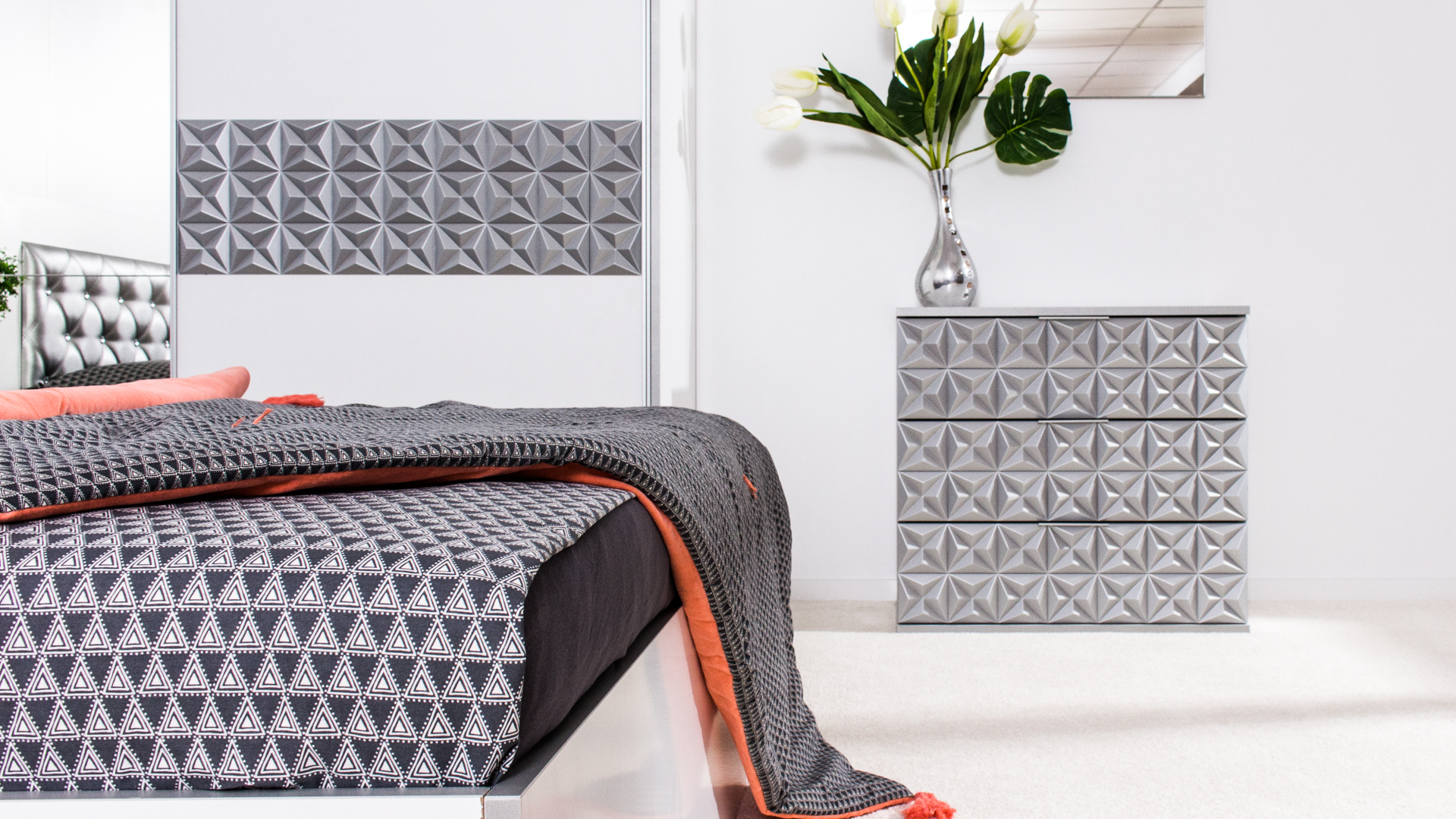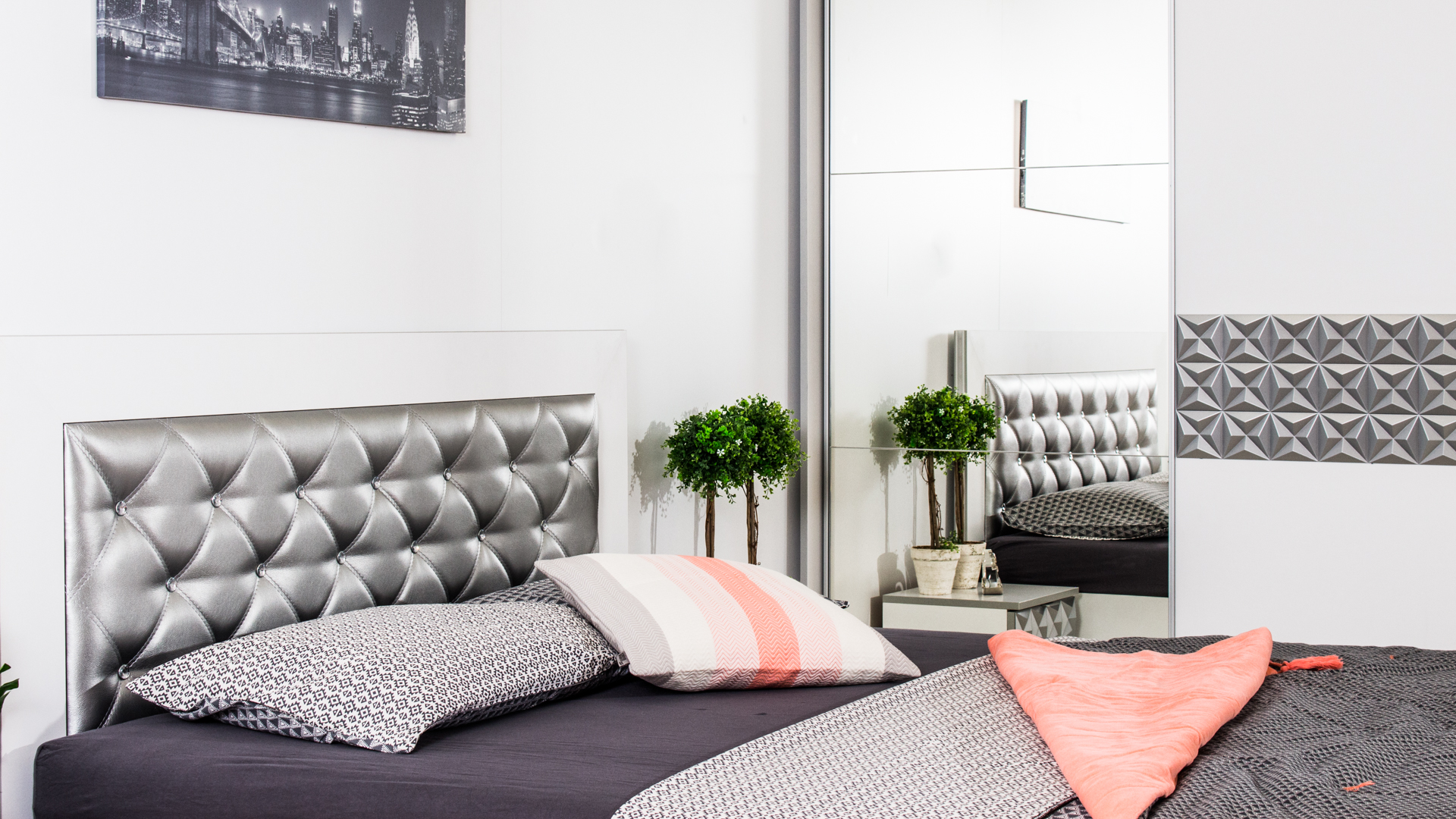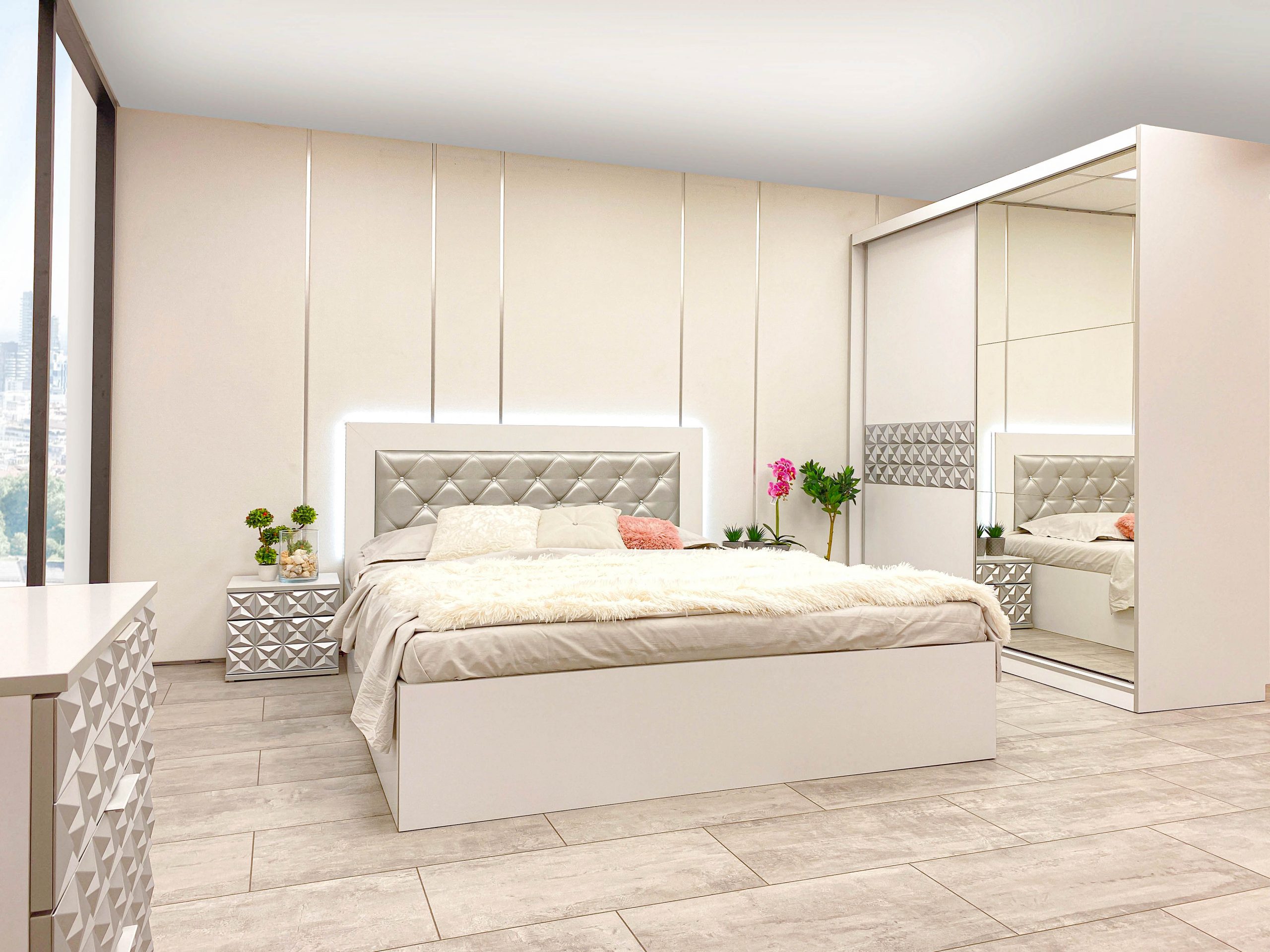 Скрин с огледало -Опция! три практични чекмеджета, система скрити водачи Quadro Hettich – плавно затваряне, пано с вградено – огледало, челата на скрина са изцяло от луксозни сребърни призми, вградени по канта дръжки, огледалото е ориентирано за стенен монтаж – 1 бр. в к-т;