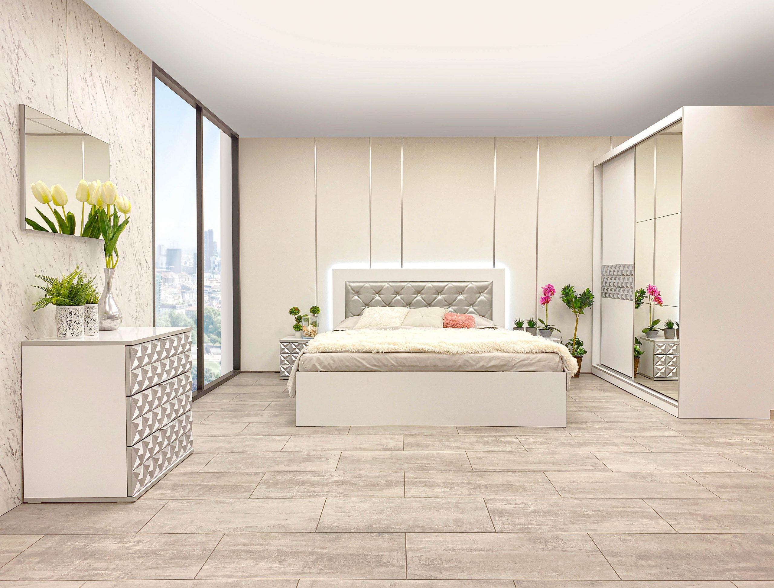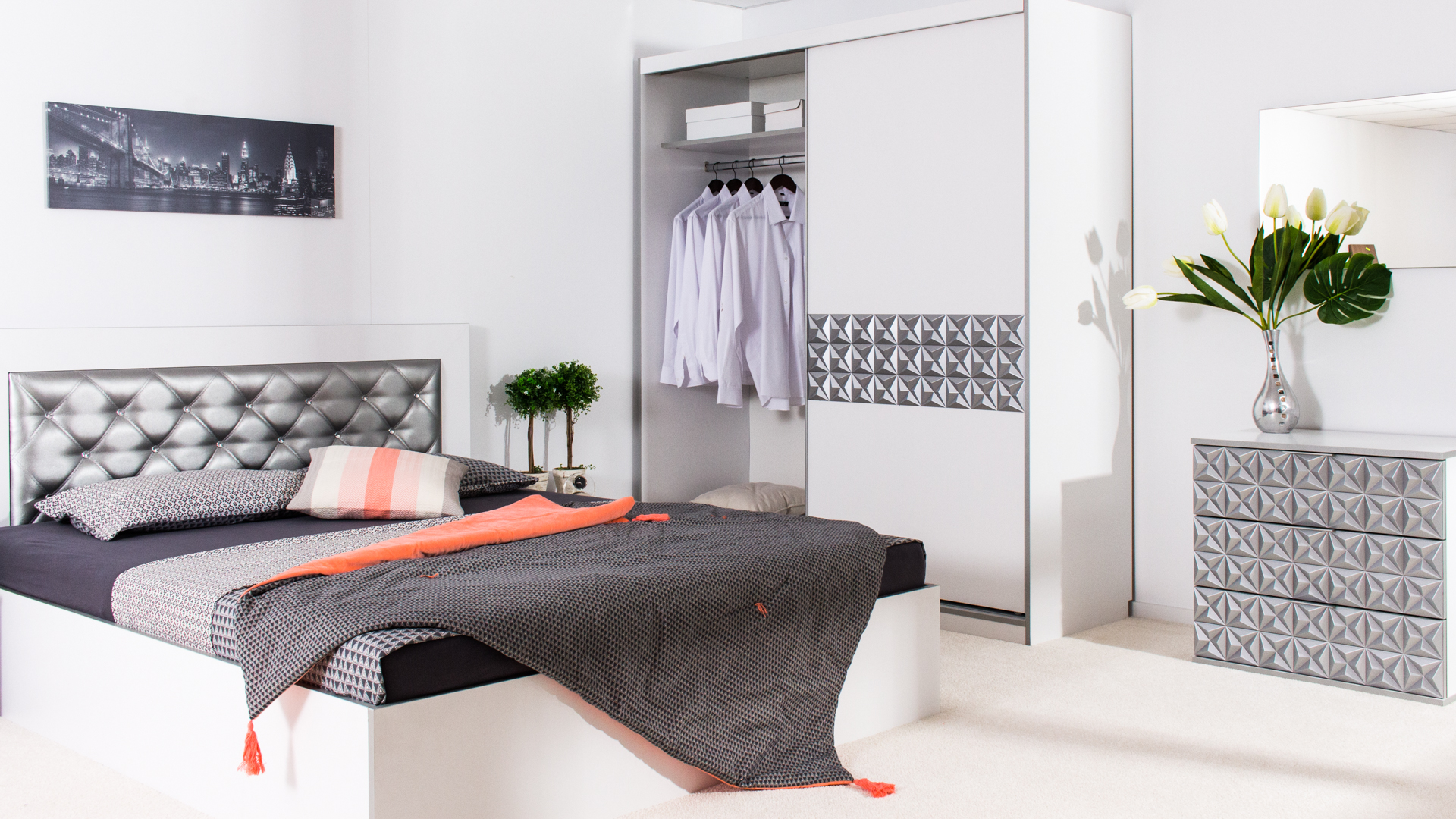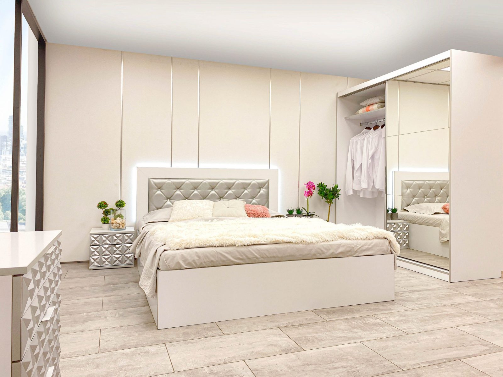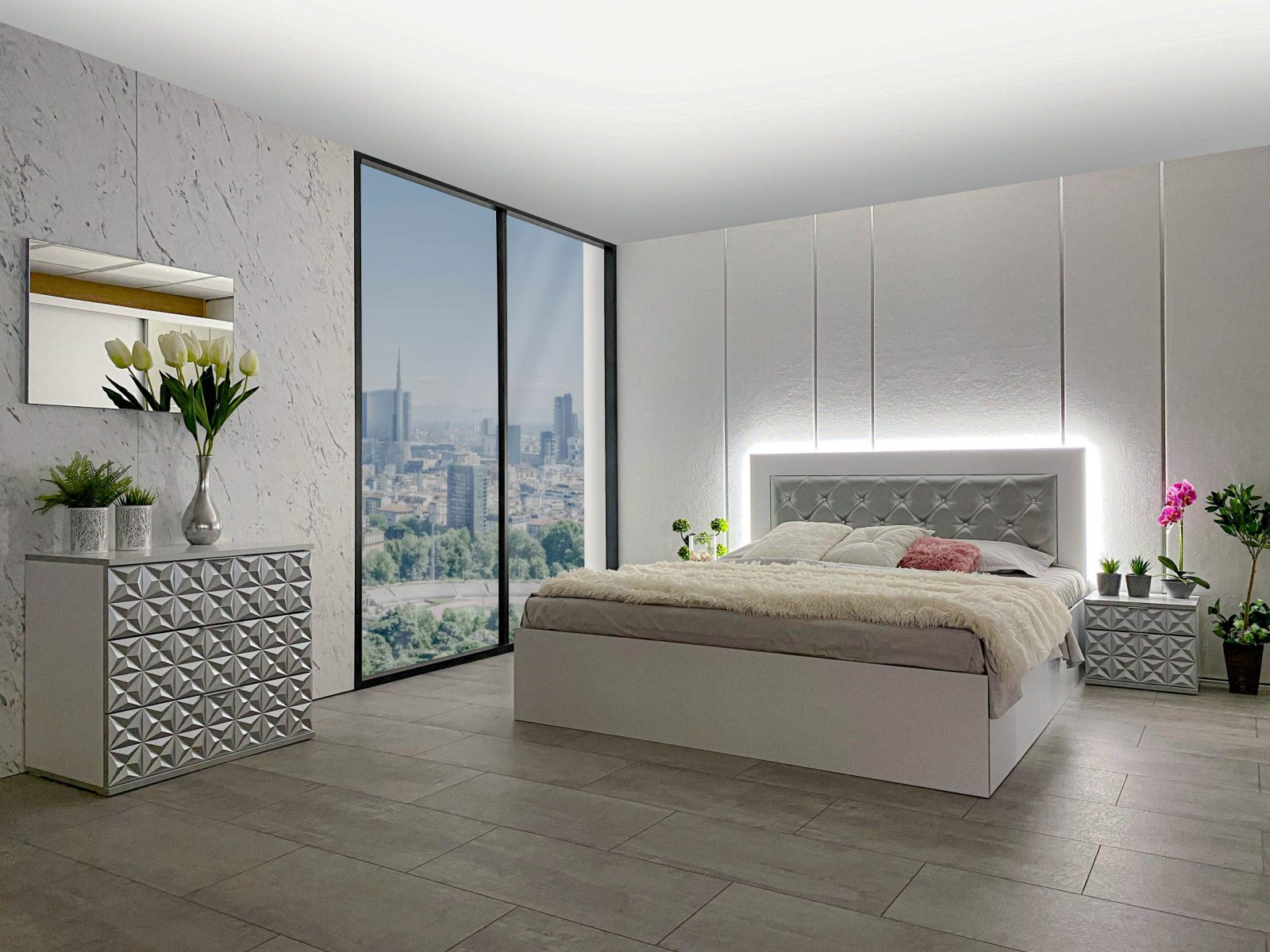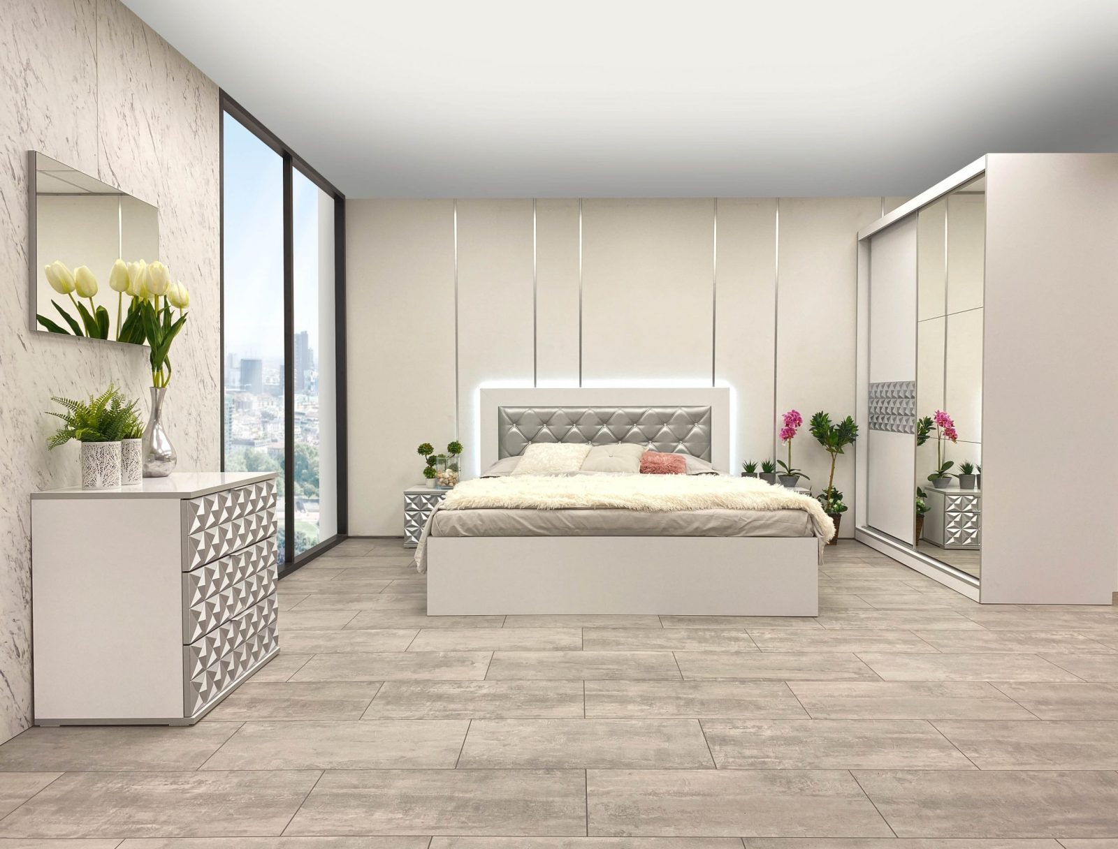 Скрин с огледало -Опция! три практични чекмеджета, система скрити водачи Quadro Hettich – плавно затваряне, пано с вградено – огледало, челата на скрина са изцяло от луксозни сребърни призми, вградени по канта дръжки, огледалото е ориентирано за стенен монтаж – 1 бр. в к-т;