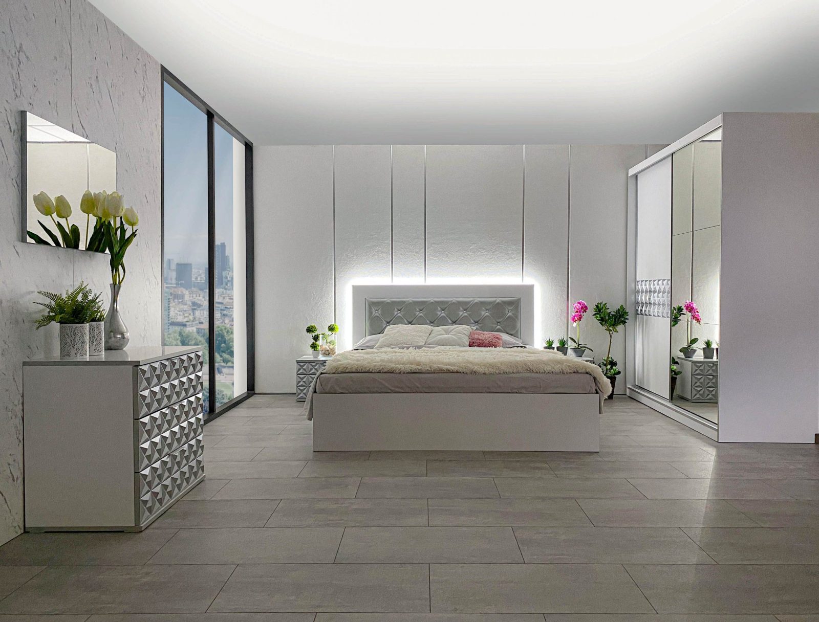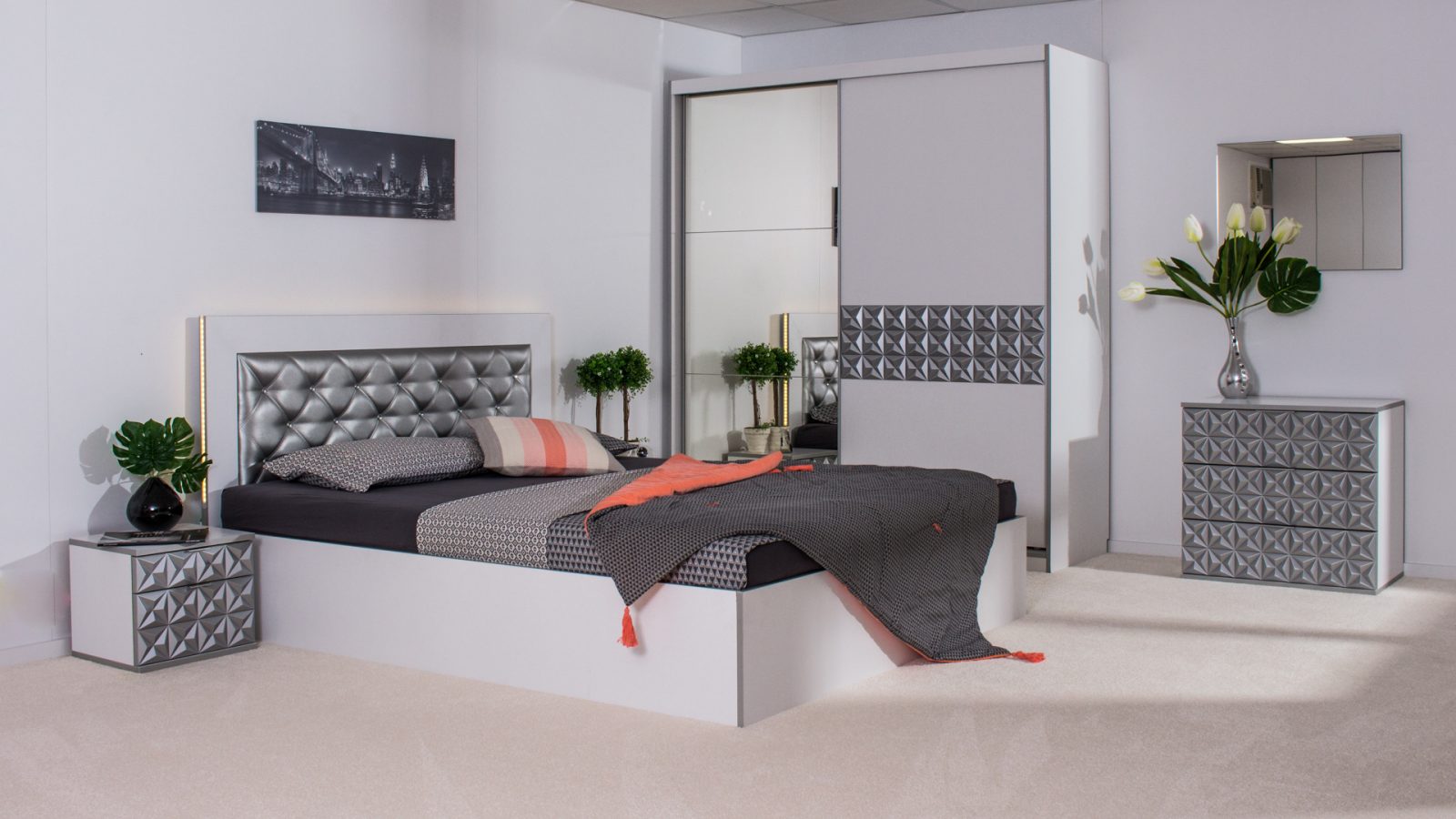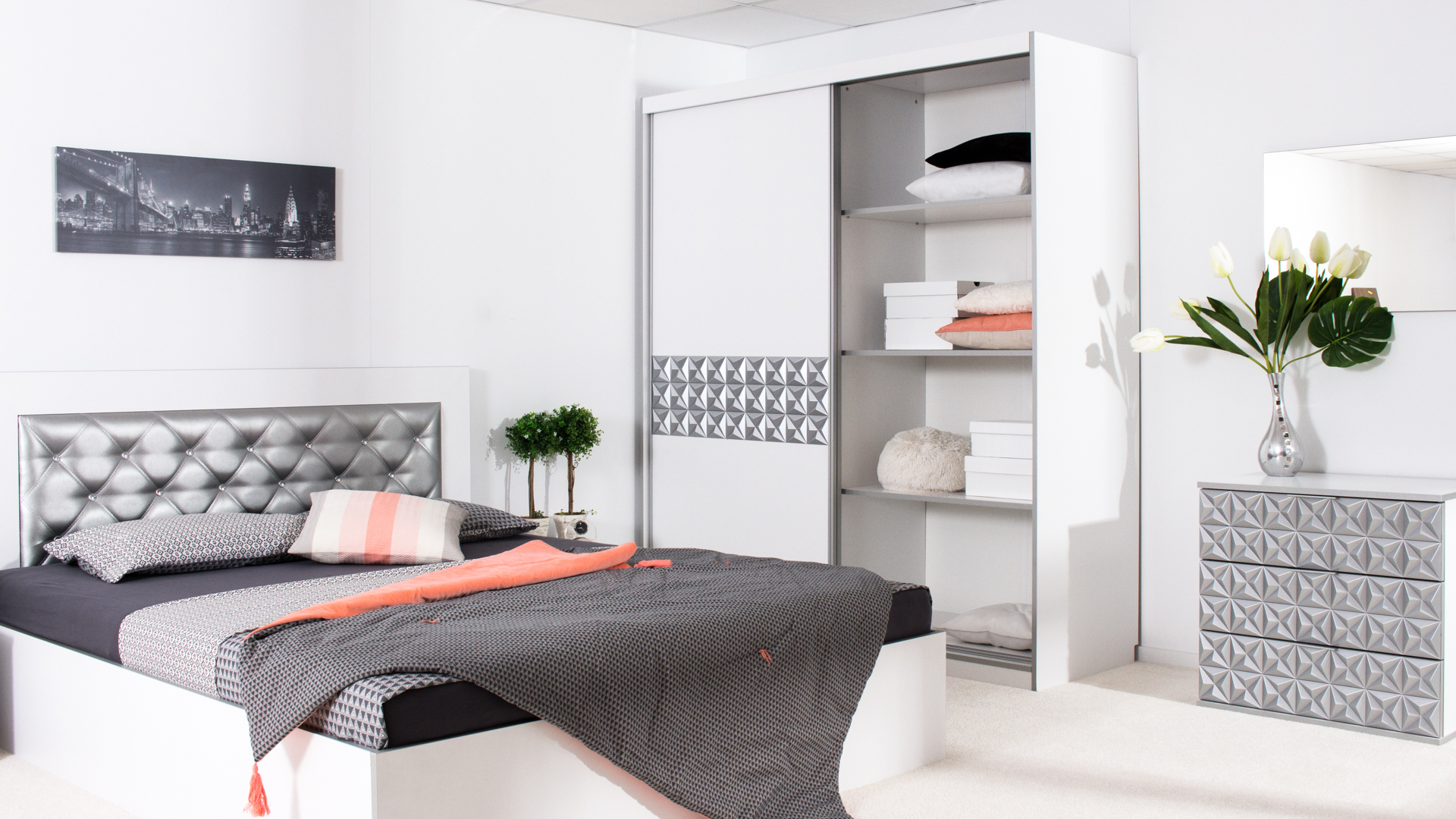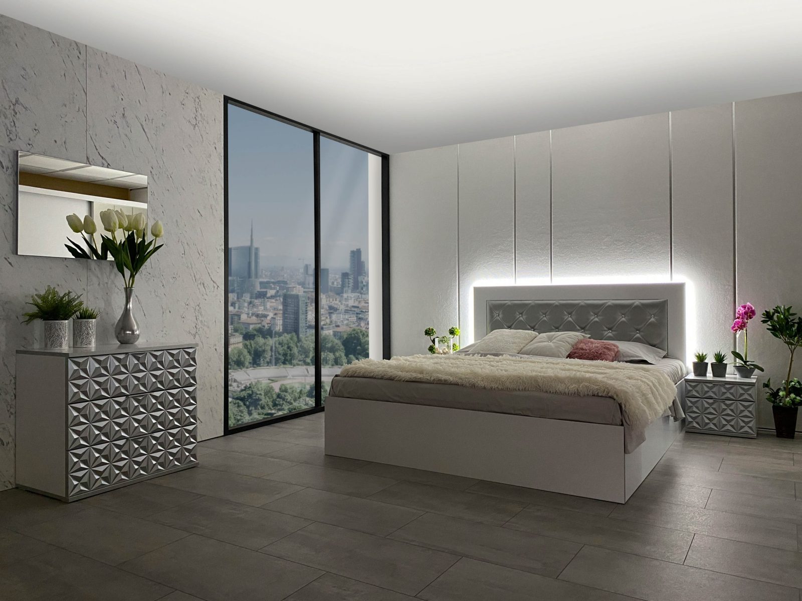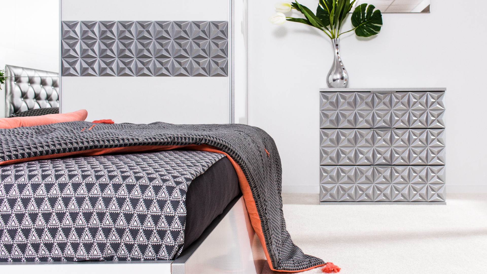 Скрин с огледало -Опция! три практични чекмеджета, система скрити водачи Quadro Hettich – плавно затваряне, пано с вградено – огледало, челата на скрина са изцяло от луксозни сребърни призми, вградени по канта дръжки, огледалото е ориентирано за стенен монтаж – 1 бр. в к-т;