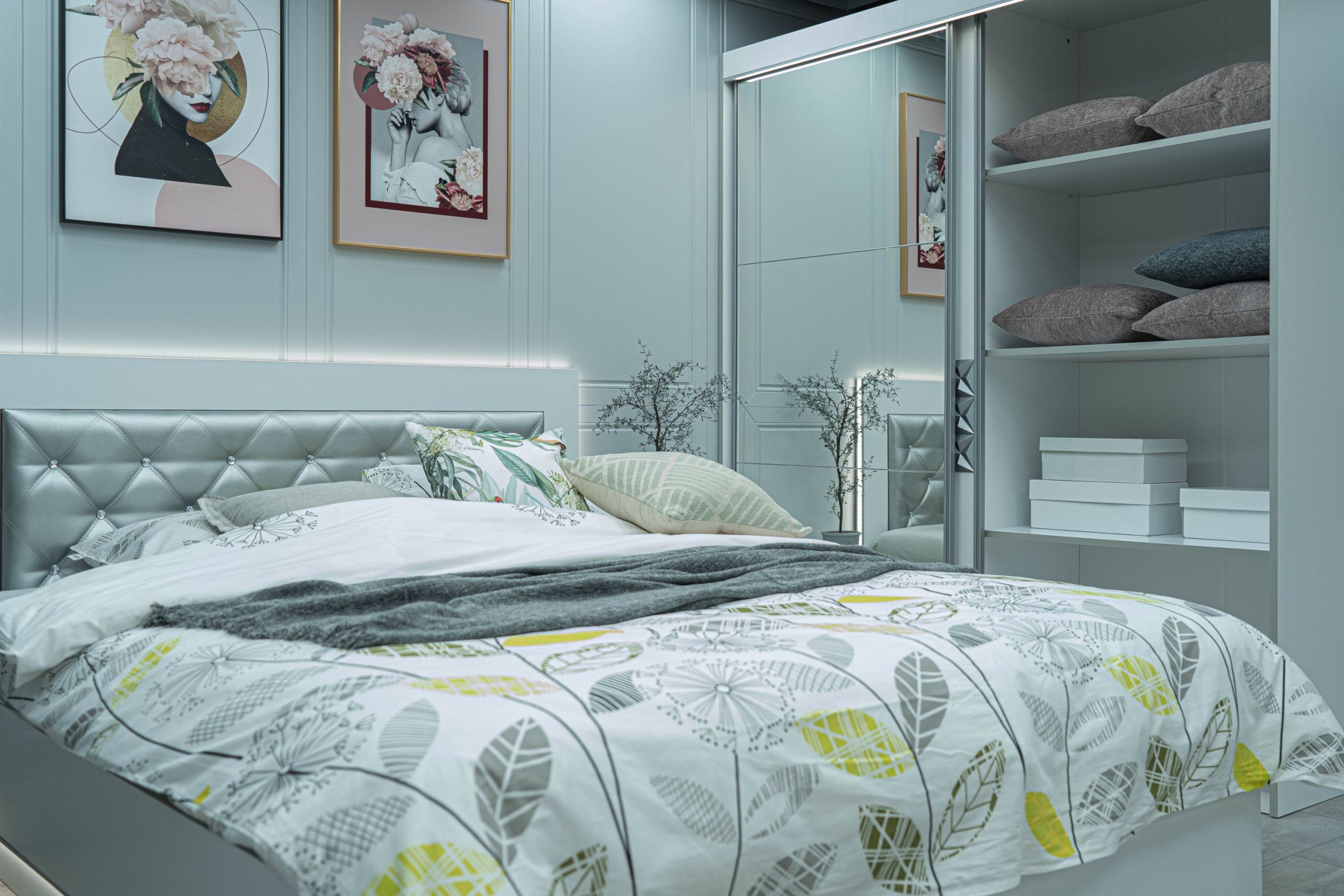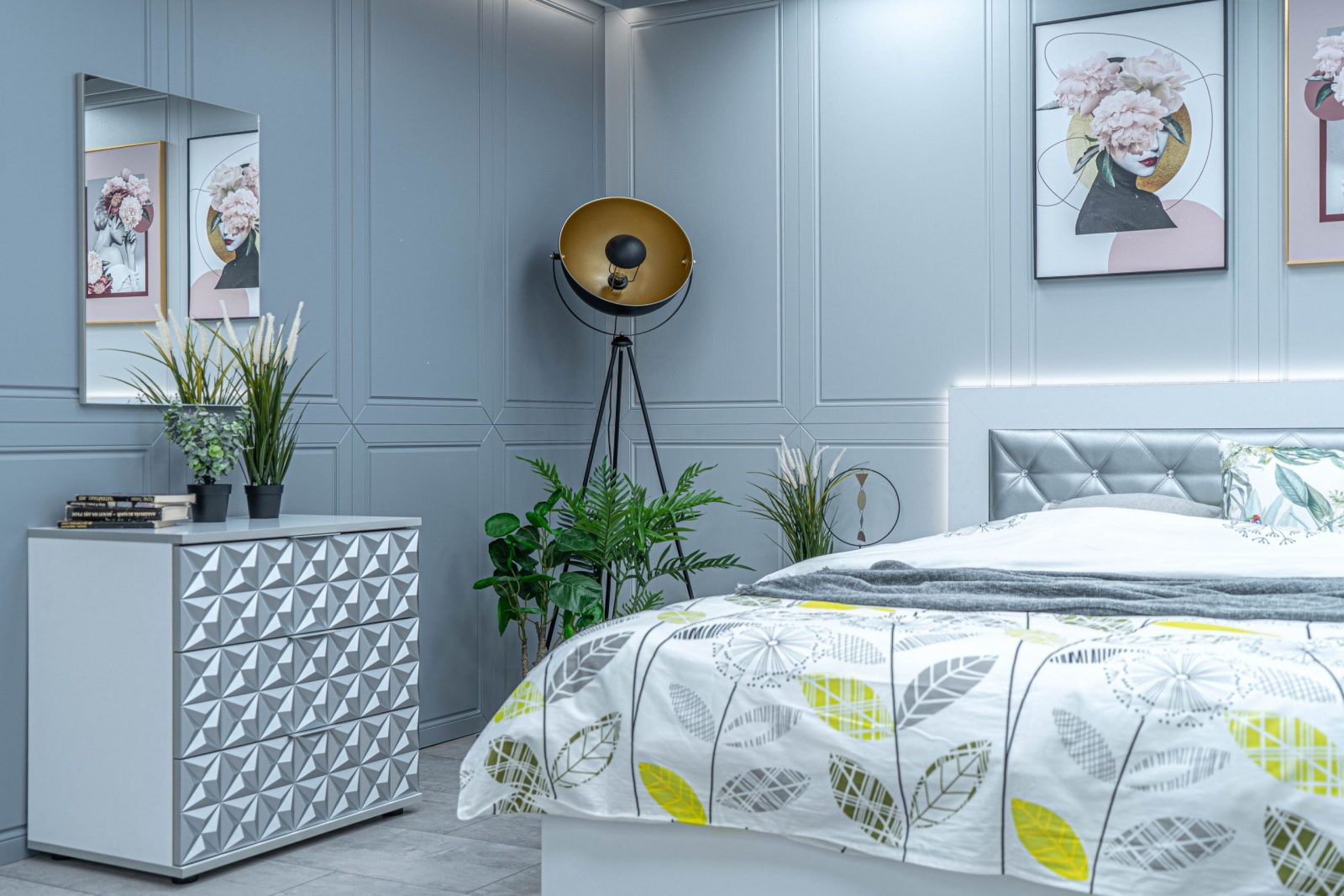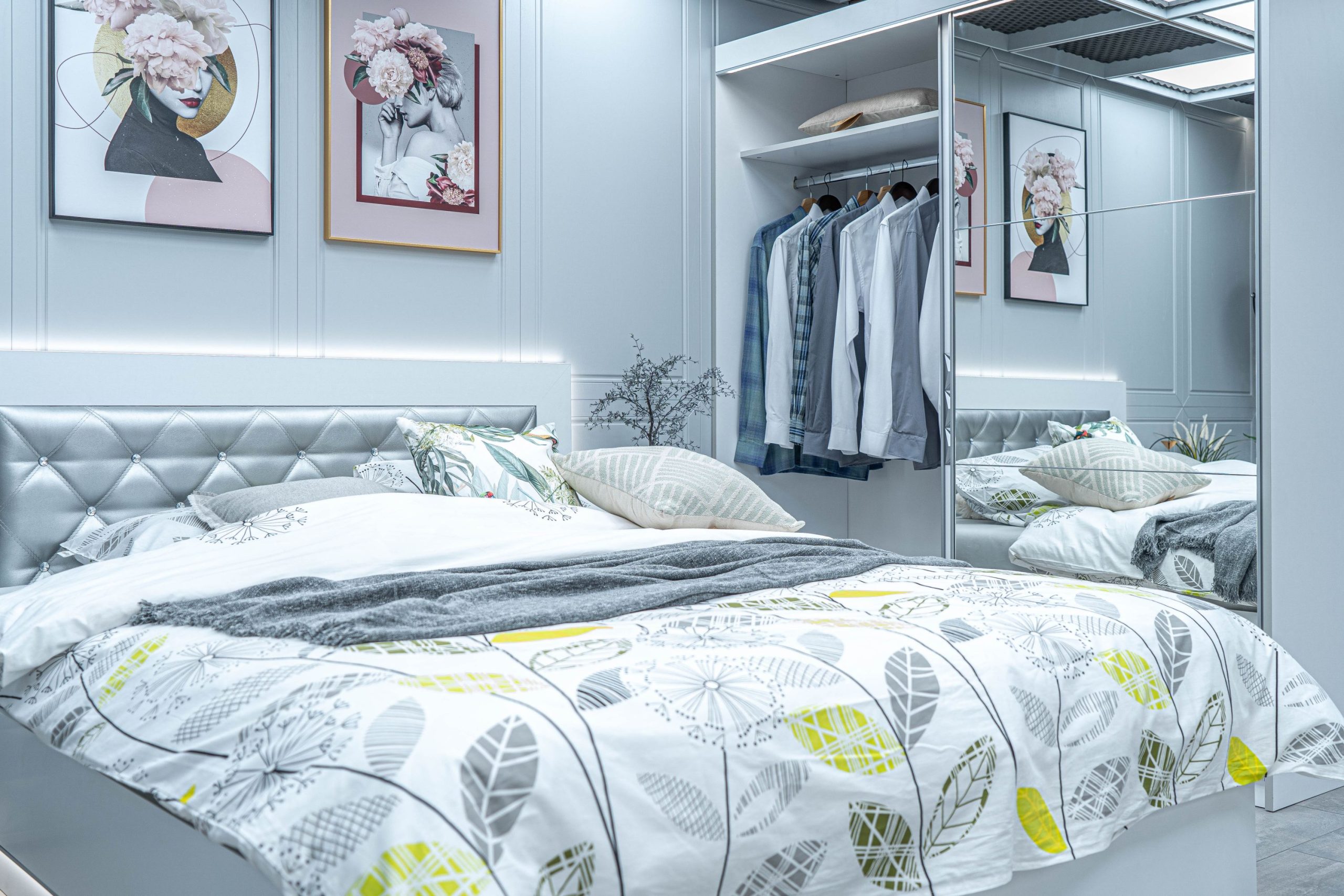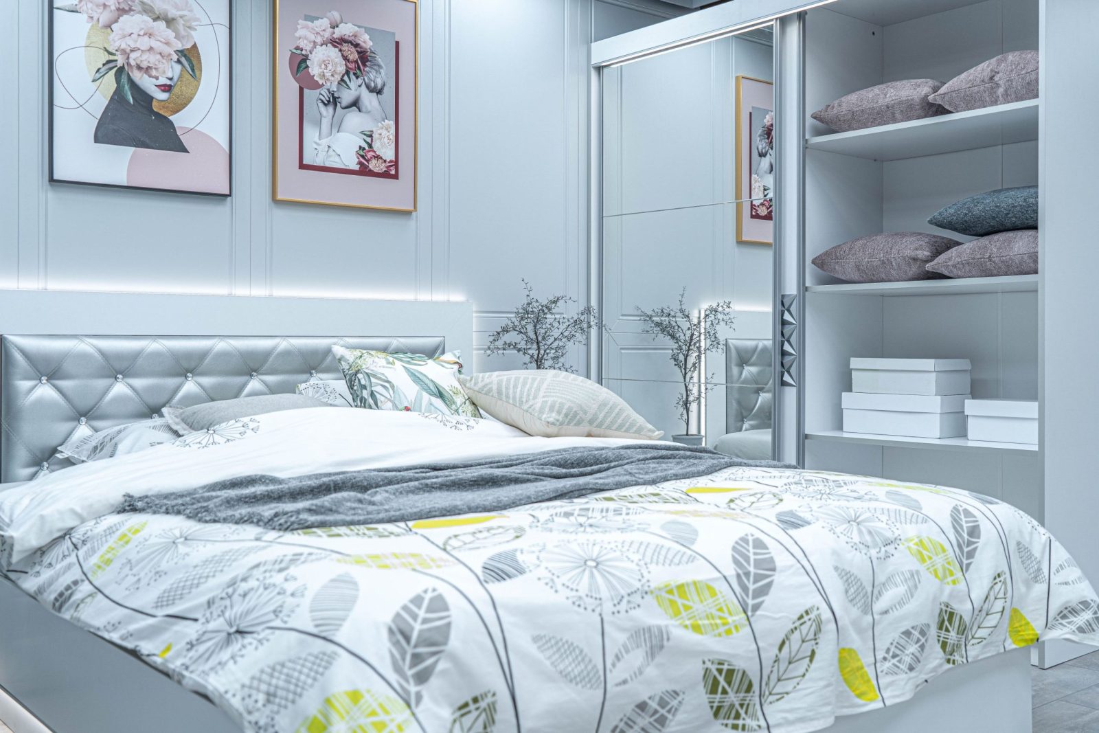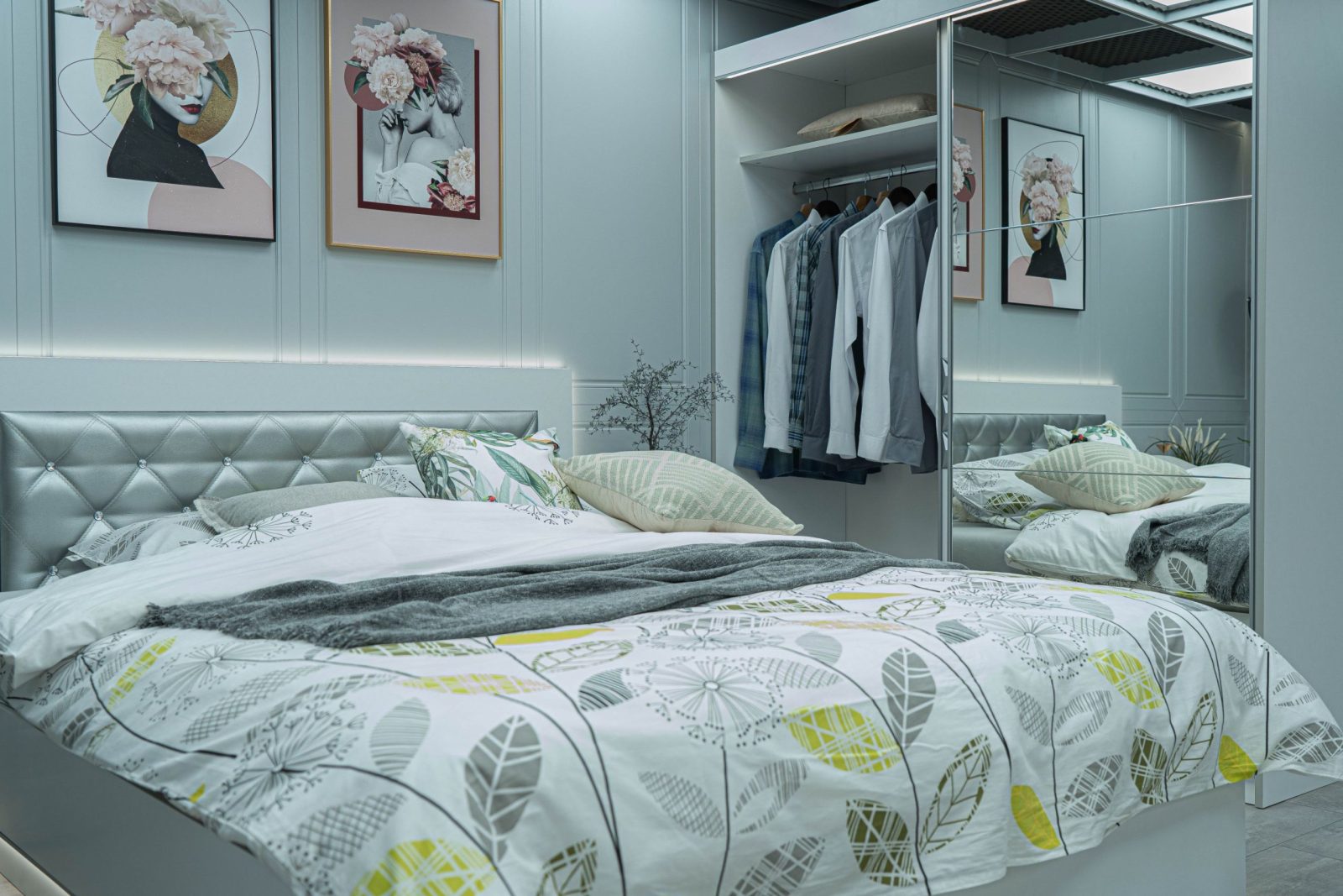 Скрин с огледало -Опция! три практични чекмеджета, система скрити водачи Quadro Hettich – плавно затваряне, пано с вградено – огледало, челата на скрина са изцяло от луксозни сребърни призми, вградени по канта дръжки, огледалото е ориентирано за стенен монтаж – 1 бр. в к-т;