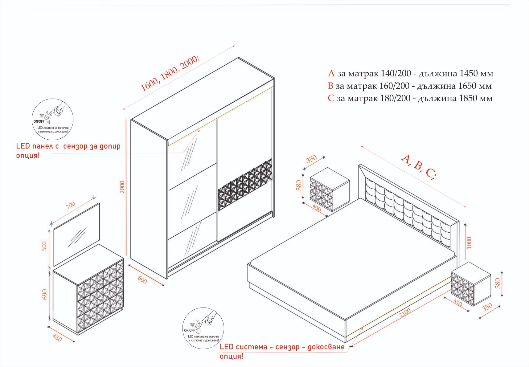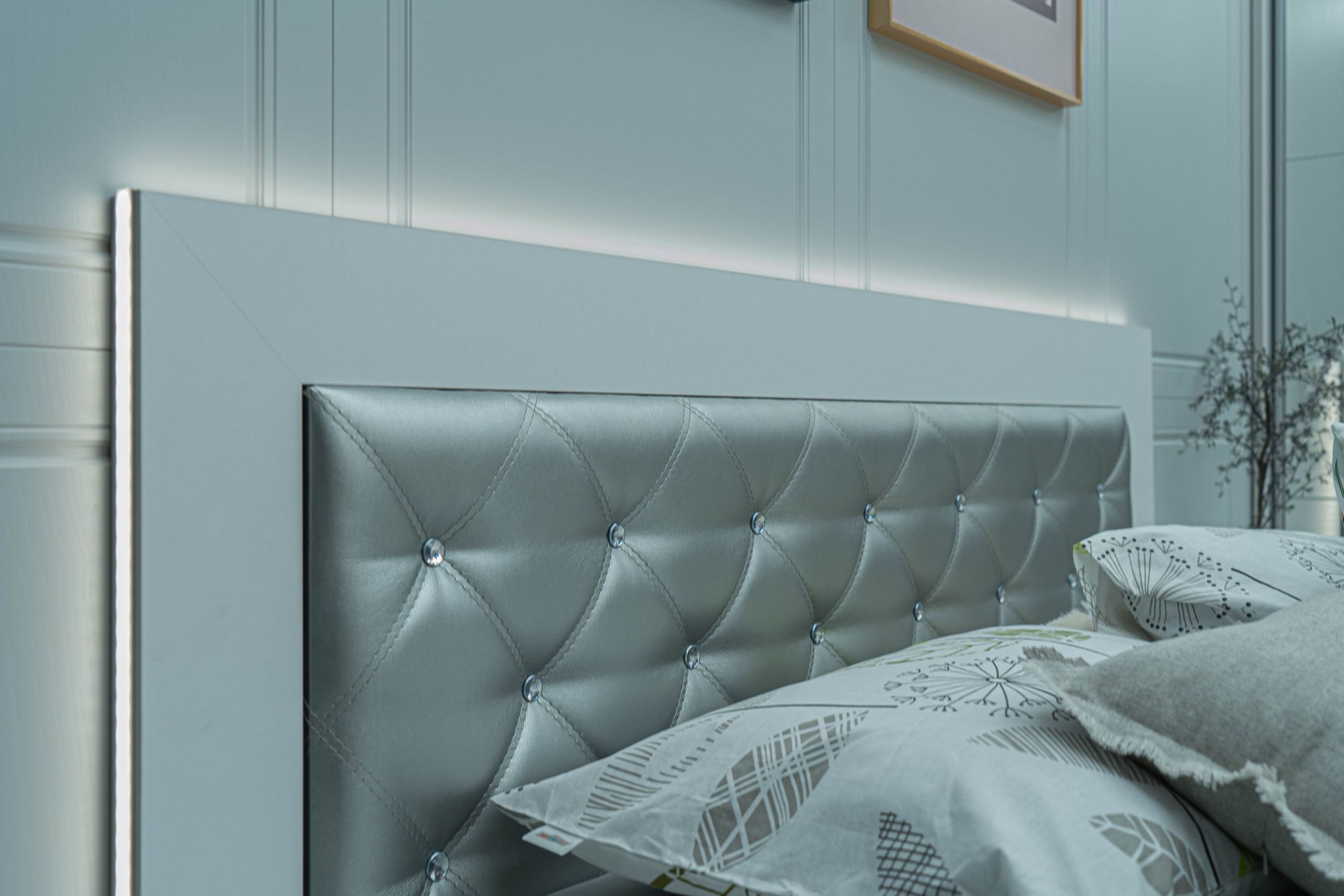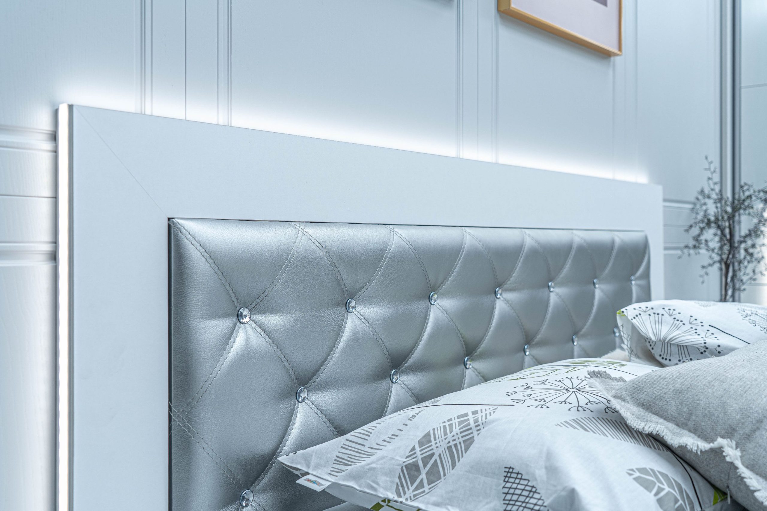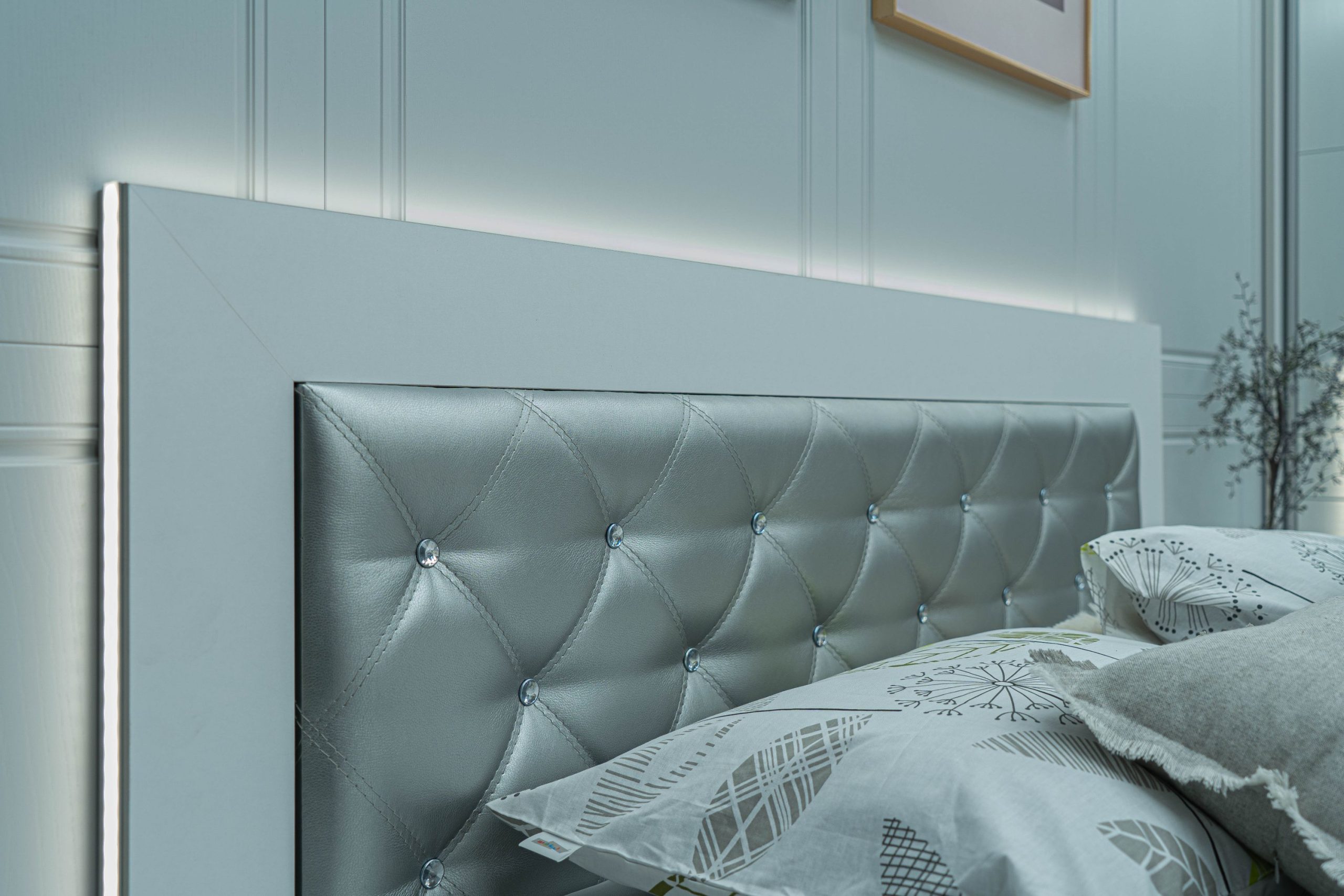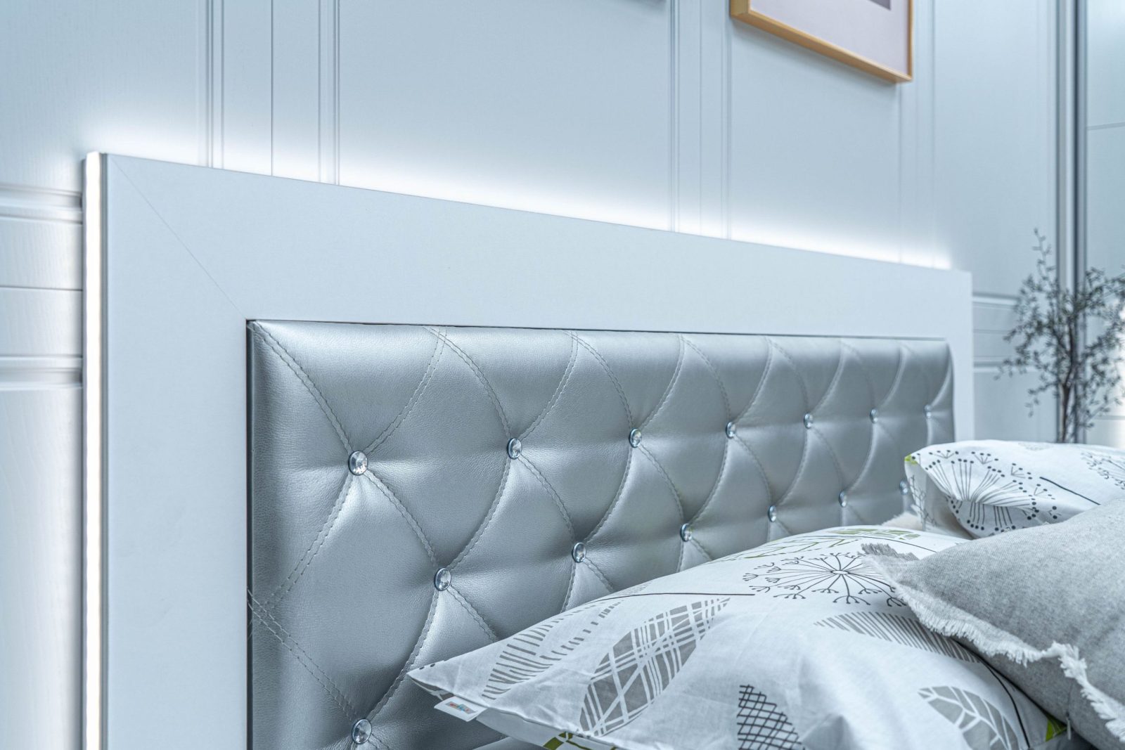 Легло: Основна табла с дебелина 36 мм ламинирано ПДЧ, по цялата табла е вградено LED осветление командвано от дистанционно с опция за регулиране силата на светлина, вградена елегантна табла с двоен лицев шев изпълнение тип „ромб“ от високо износоустойчива еко кожа – цвят сребро, акценти от копчета бял прозрачен кристал. Всички използвани сглобки са метални – скрит монтаж.