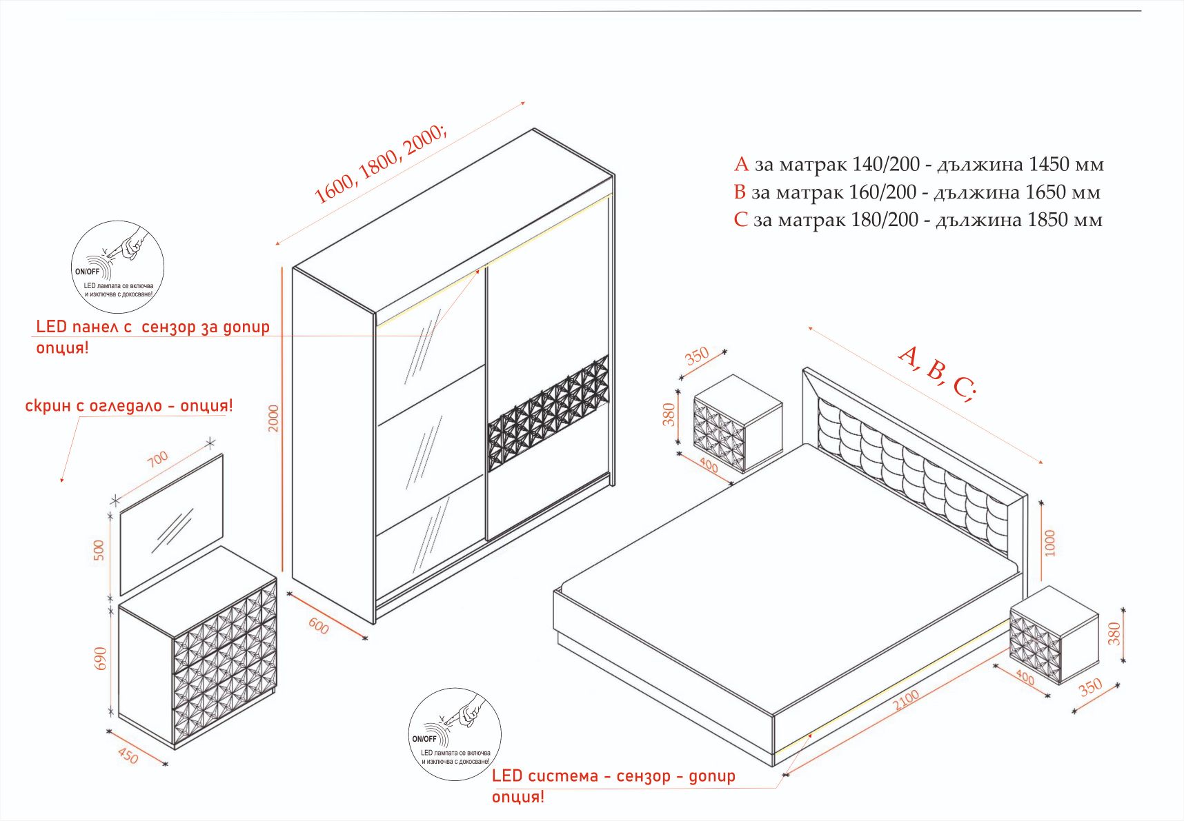 4. За представените снимки СК ”Фантазия бохемия” е с монтиран двойнолицев матрак, подматрачна ламелна рамка с газов механизъм за повдигане, във всички останали комплектовки този спален комплект се предлага без тези изделия и те са допълнителни опции с допълнително заплащане (виж съответната категория)!