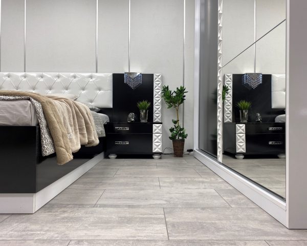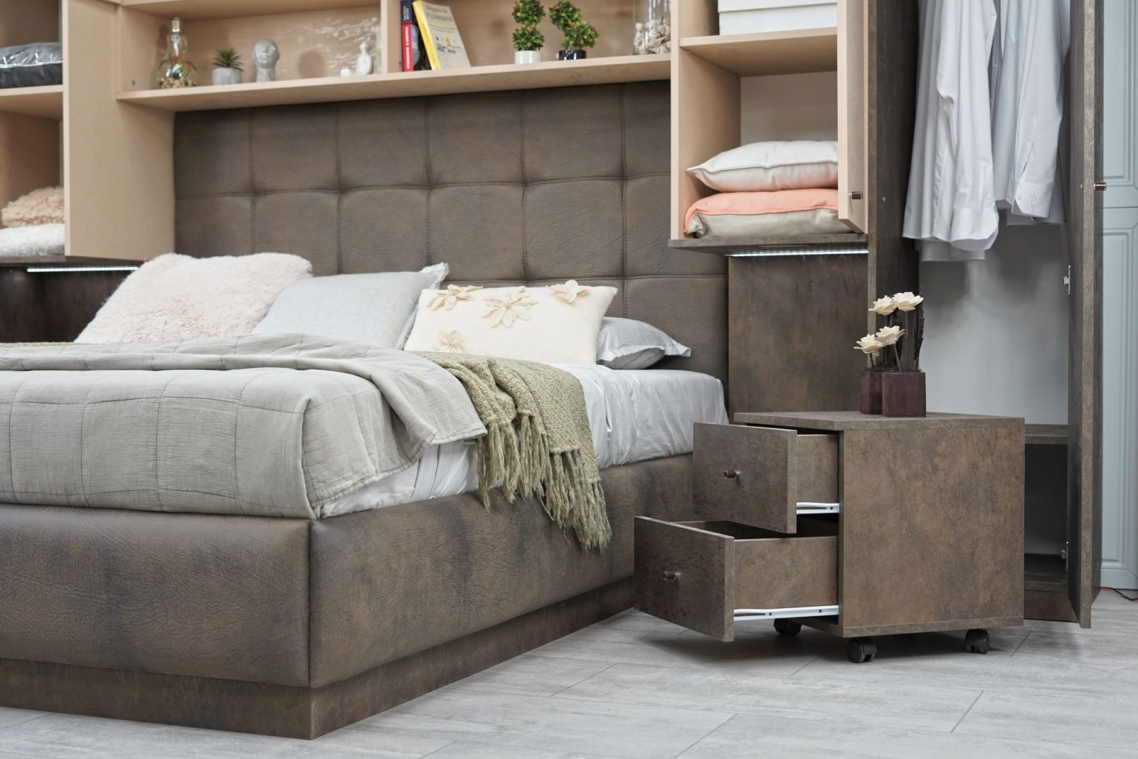 Нощно шкафче: две практични чекмеджета – система скрити водачи Quadro Hettich – плавно затваряне, подвижни на колелца – за практично ползване – 2 бр. в к-т;
