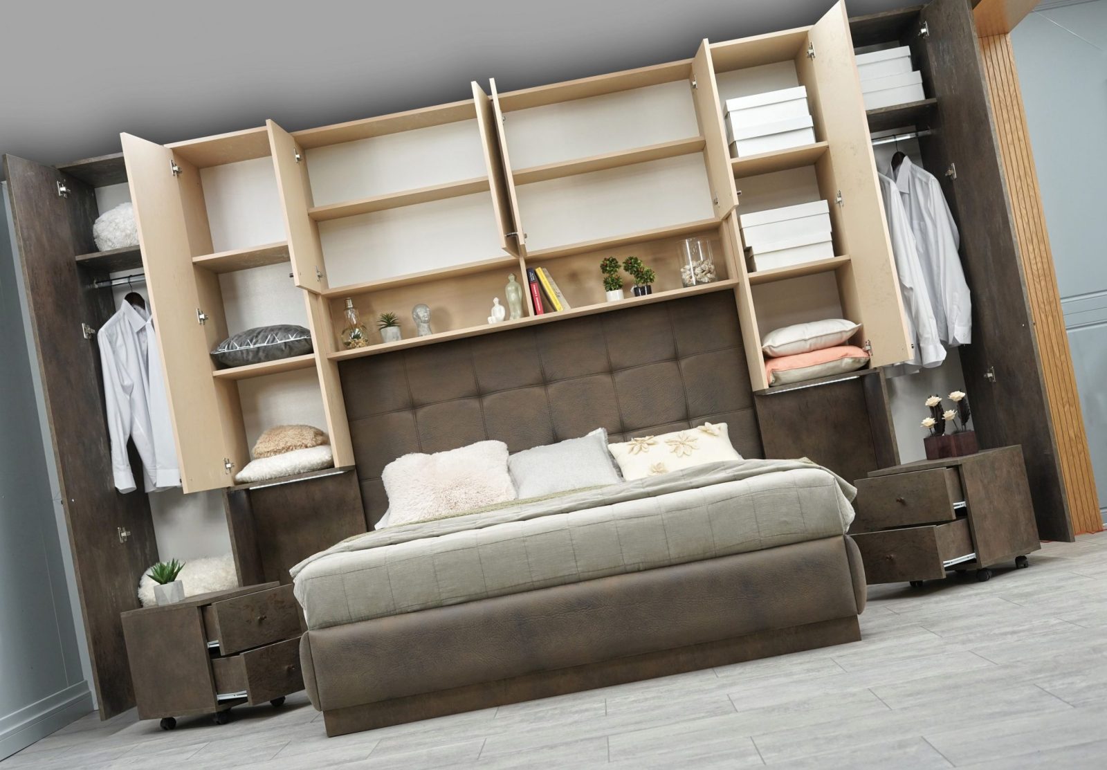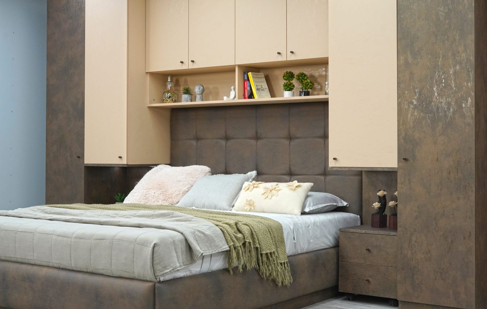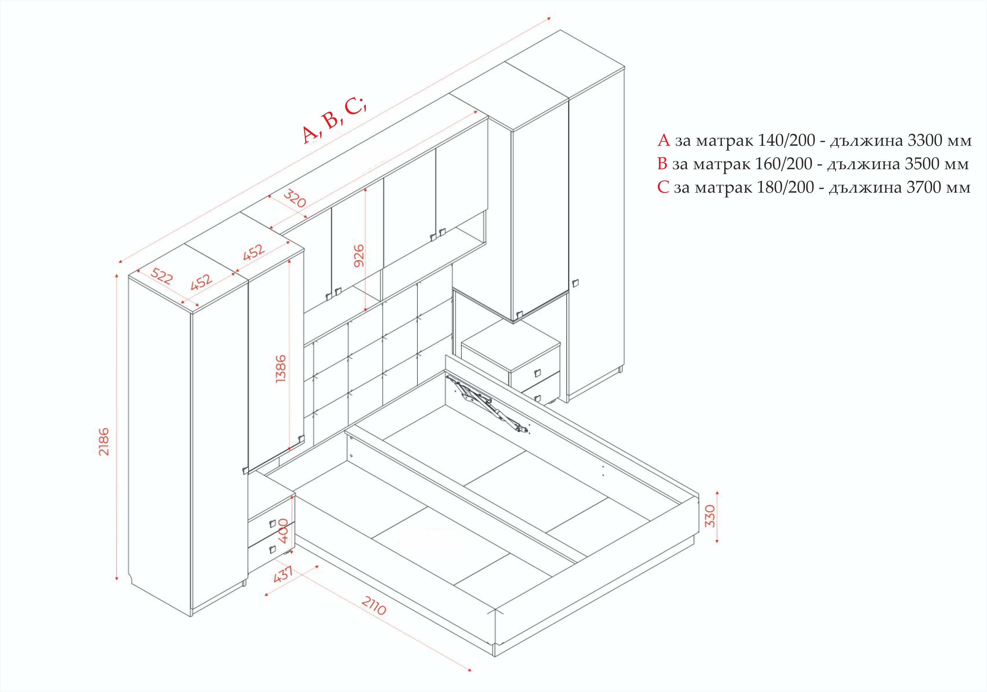 Над леглова надстройка: практични шкафове + ниши – разположение – рафт, панта – плавно затваряне, метални рафтоносачи, използвани са сглобки – скрит монтаж, метални рафтоносачи за стабилност на рафтовете, ориентирани са за стенен монтаж;