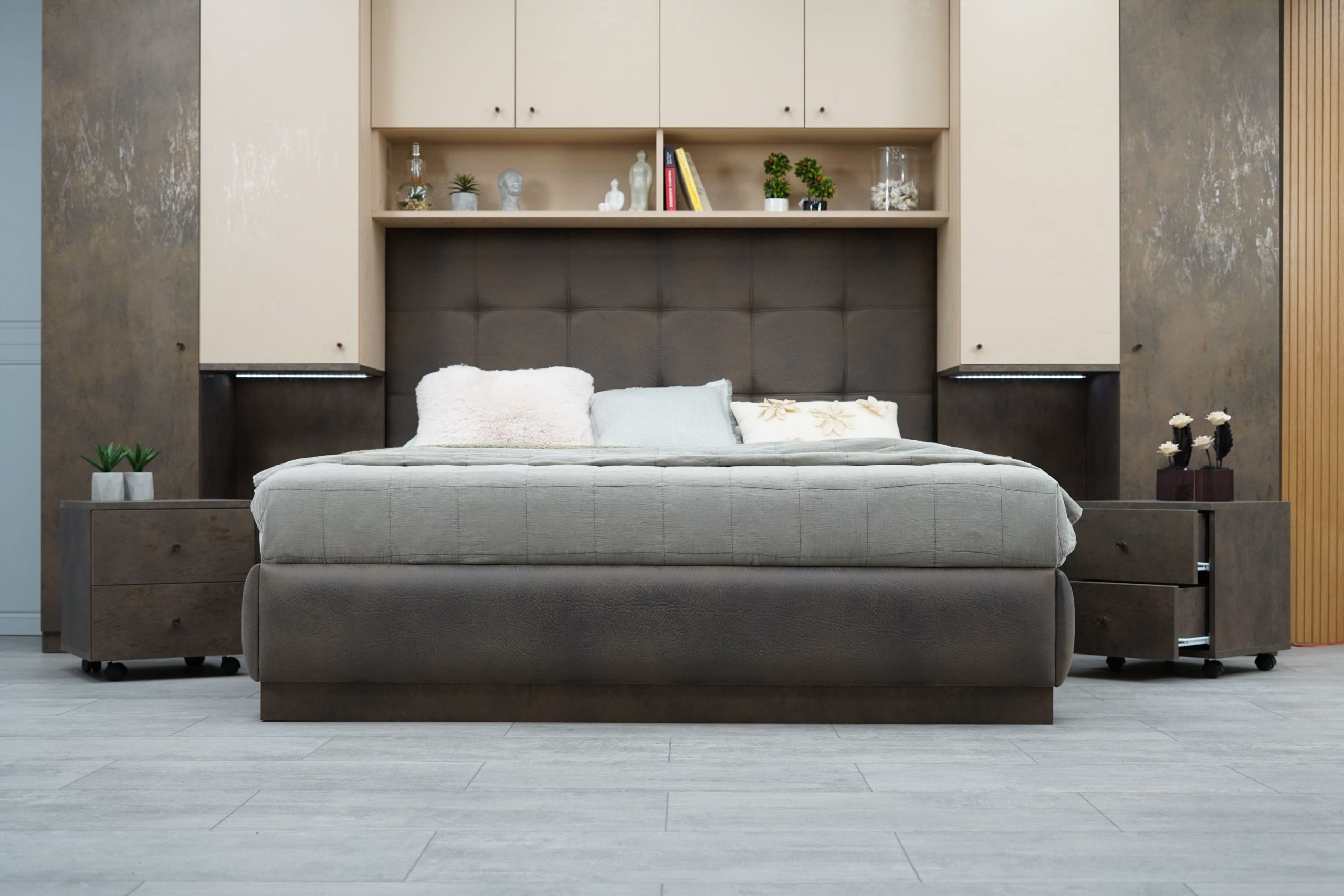 Легло: висока тапицирана табла от високоизносоустойчива дамаска, елегантен двуиглен шев – форма квадрат. Базата за матрак е с тапицирани външни царги – изпълнение бе з външен ръб – могат да се откачат лесно с цел – подръжка и претапициране. Към леглото е включено и дъно, което е фалцвано в царгите за удобство при ползване за съхранение. Всички използвани сглобки са метални – скрит монтаж.