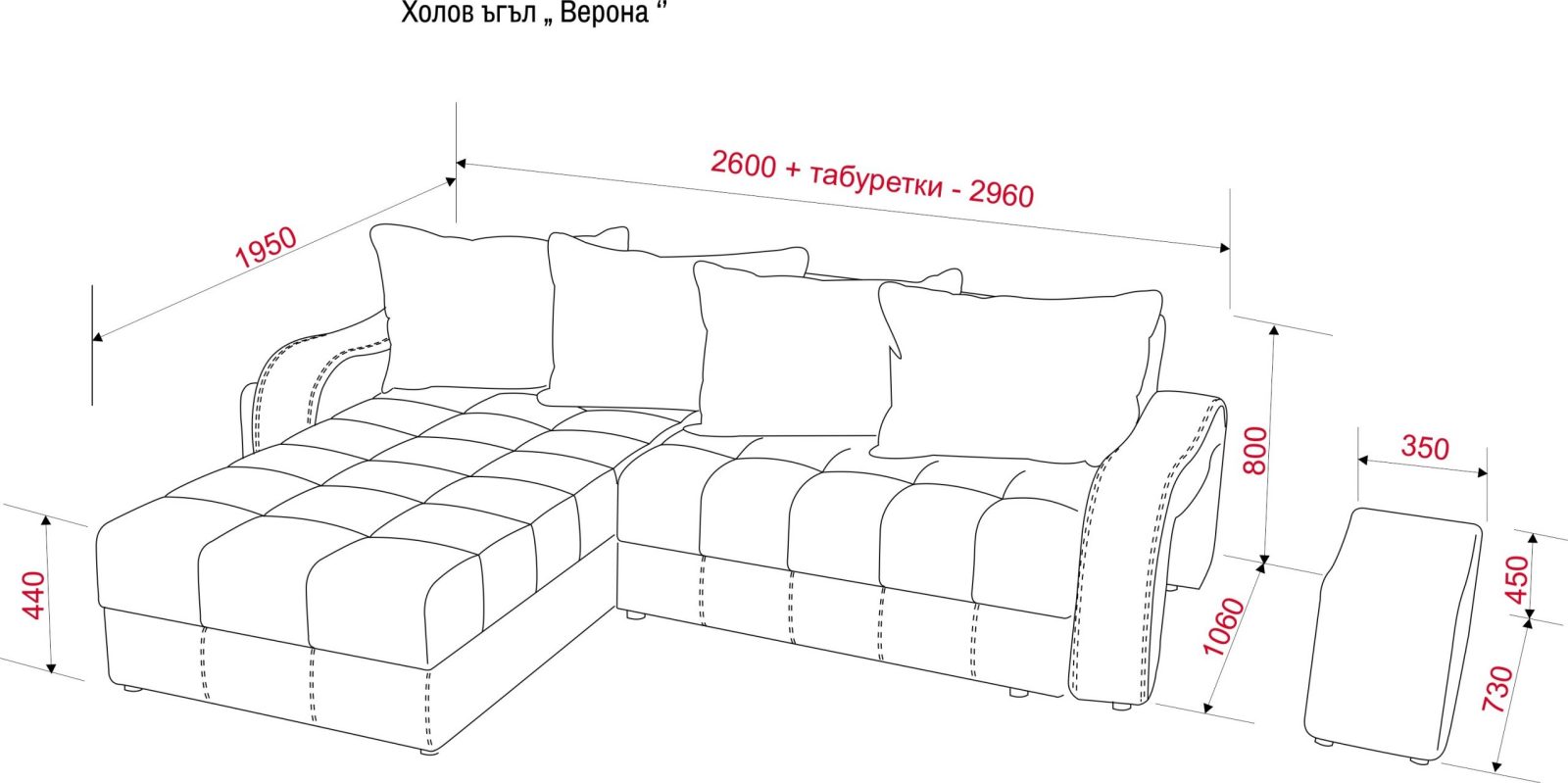 Холовият ъгъл се предлага с вградени табуретки в подлакътниците и с с 3 бр. възглавници – облегалки.