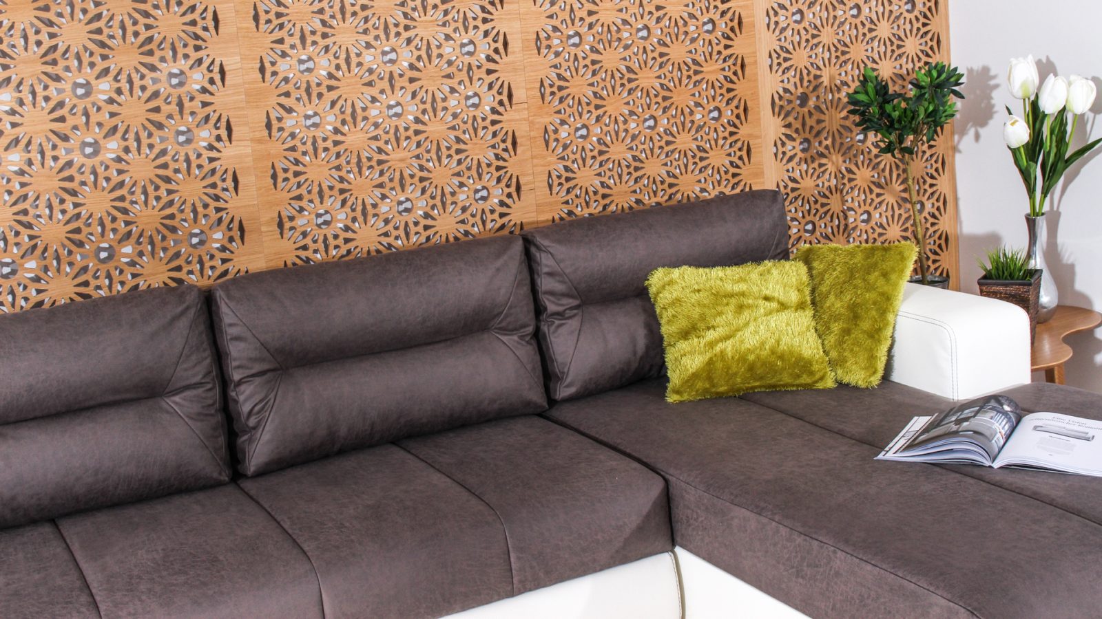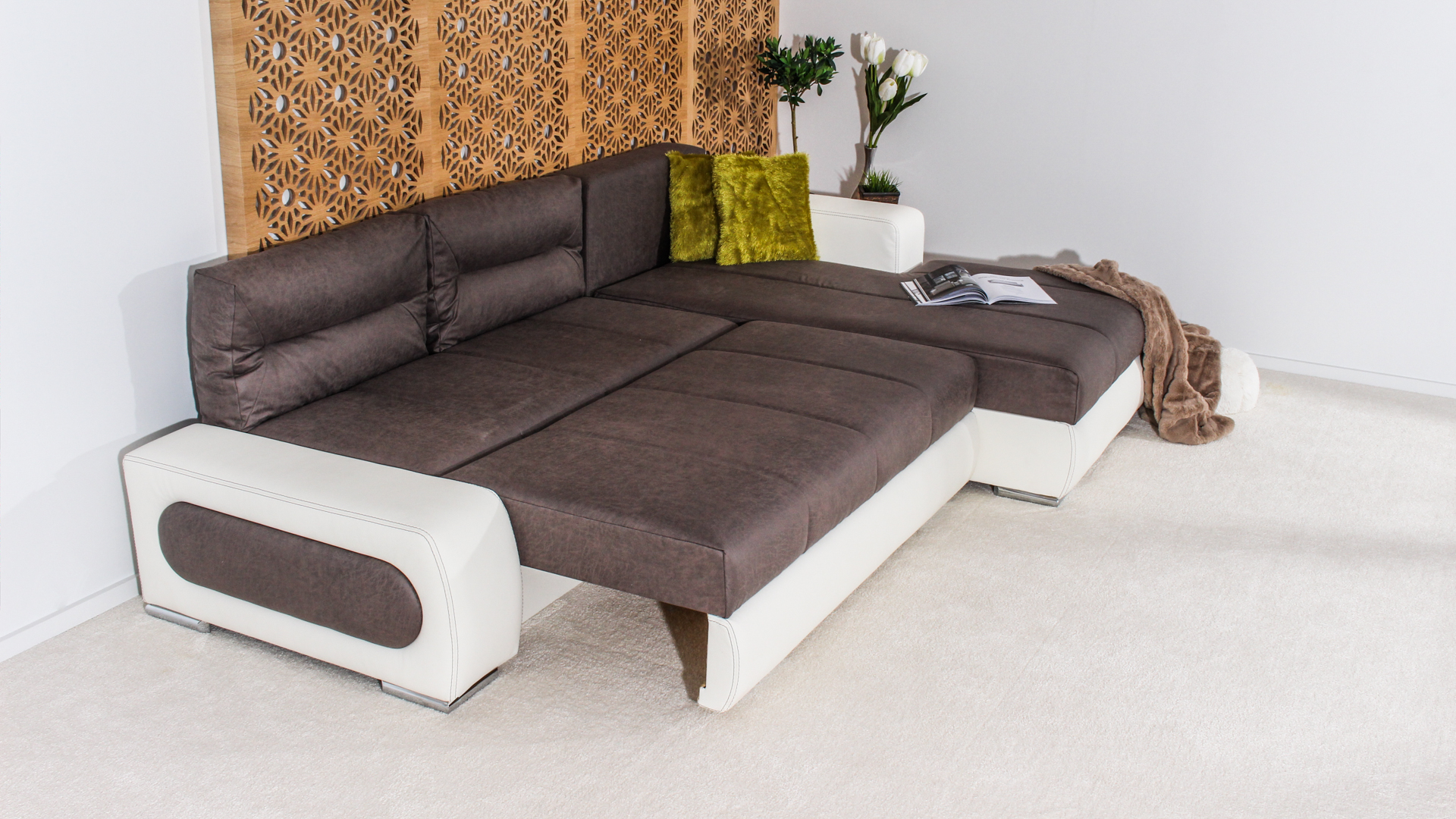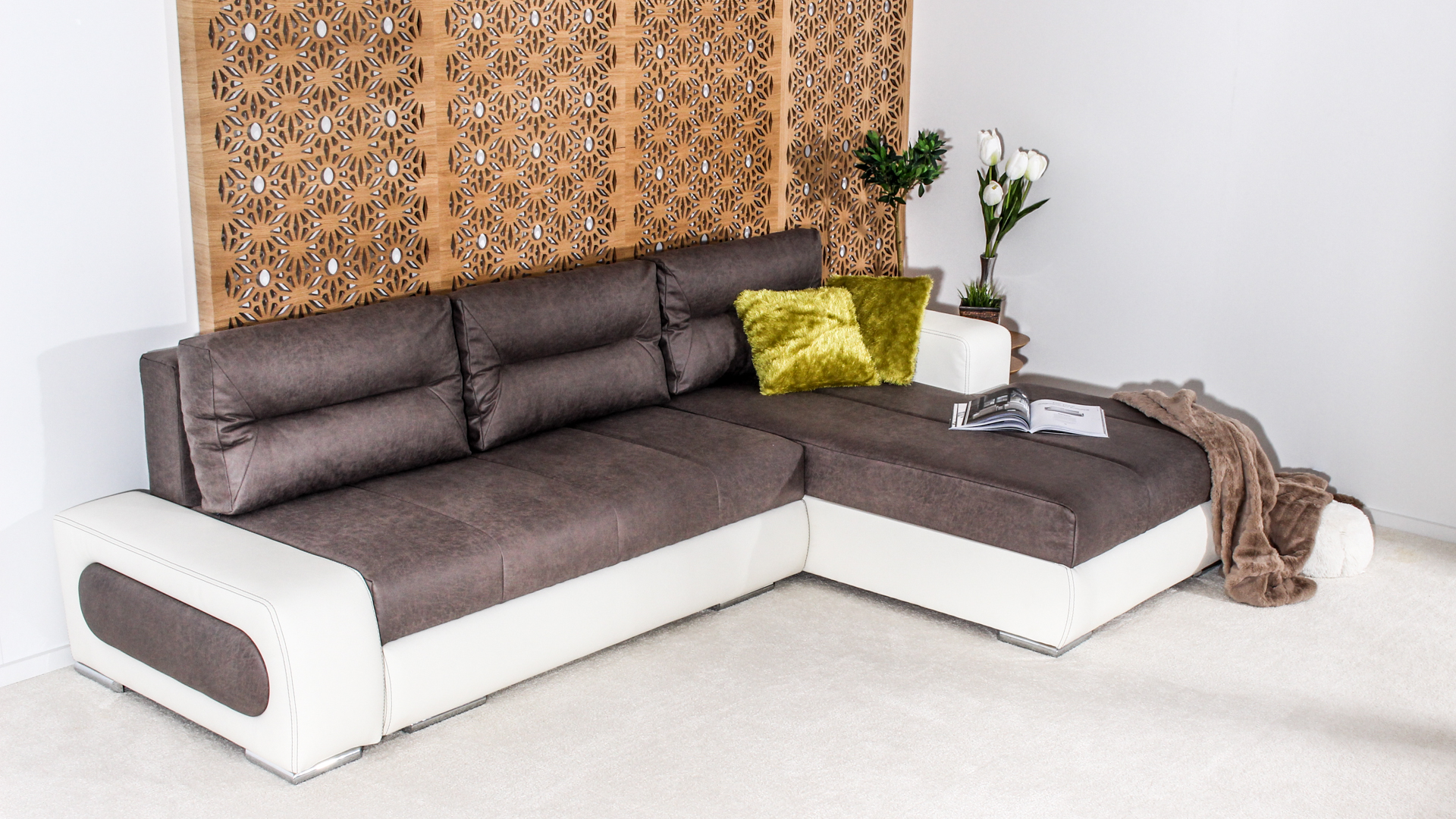 Конструкция – изработена от масивна дървесина, ПДЧ, висококачествена полиуретанова пяна + мемори на седалищната част, 3 бр възглавници – облегалки пълнеж силиконов пух, вата и полиуретан;