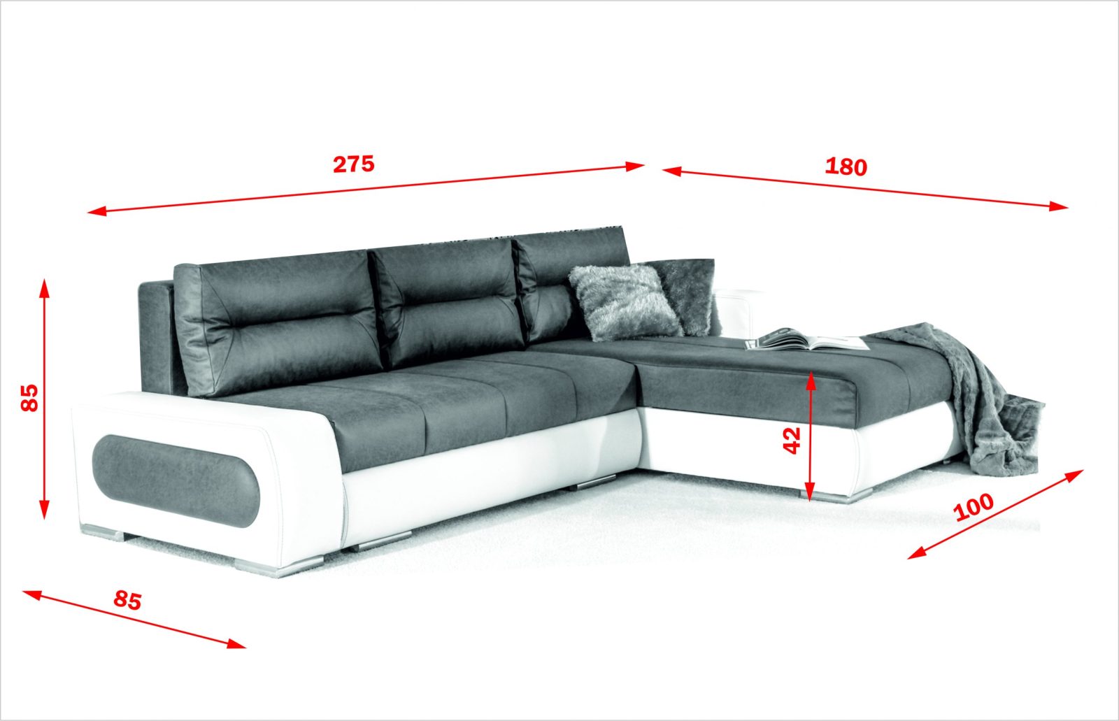Размери: дължина 275 см, ширина 180 см, височина 80 см;