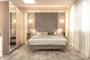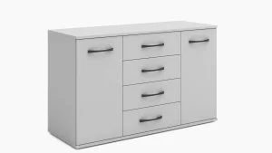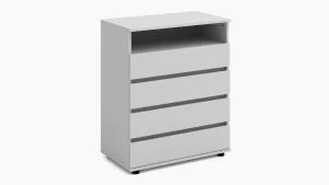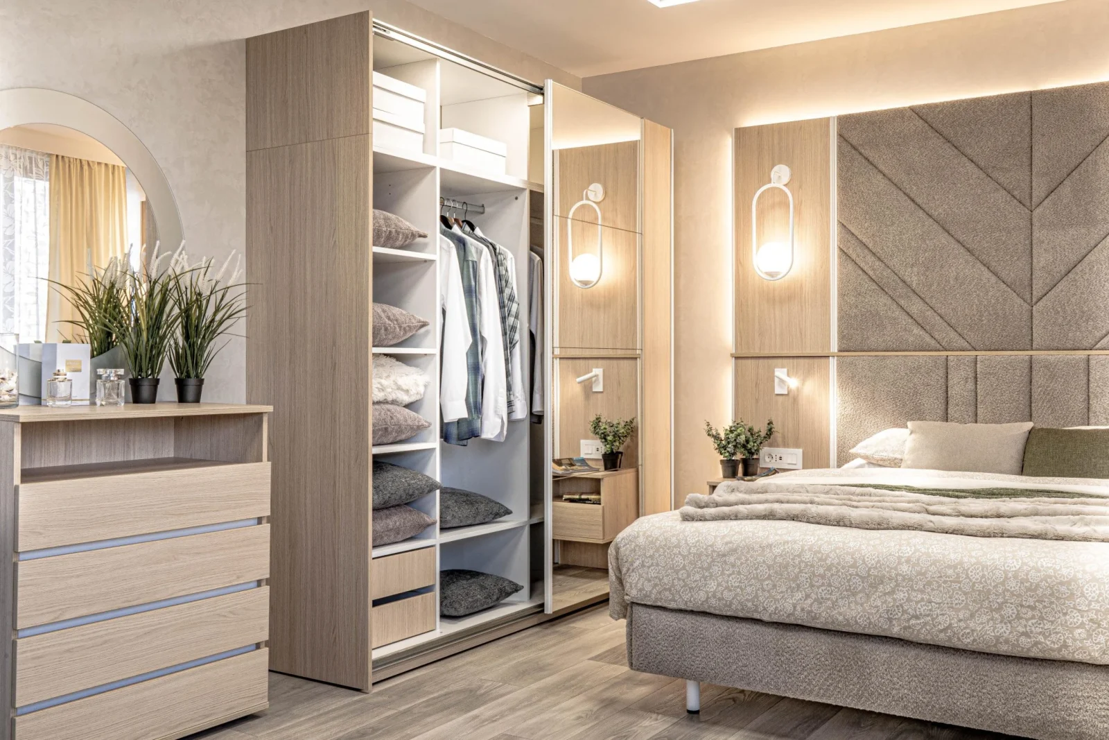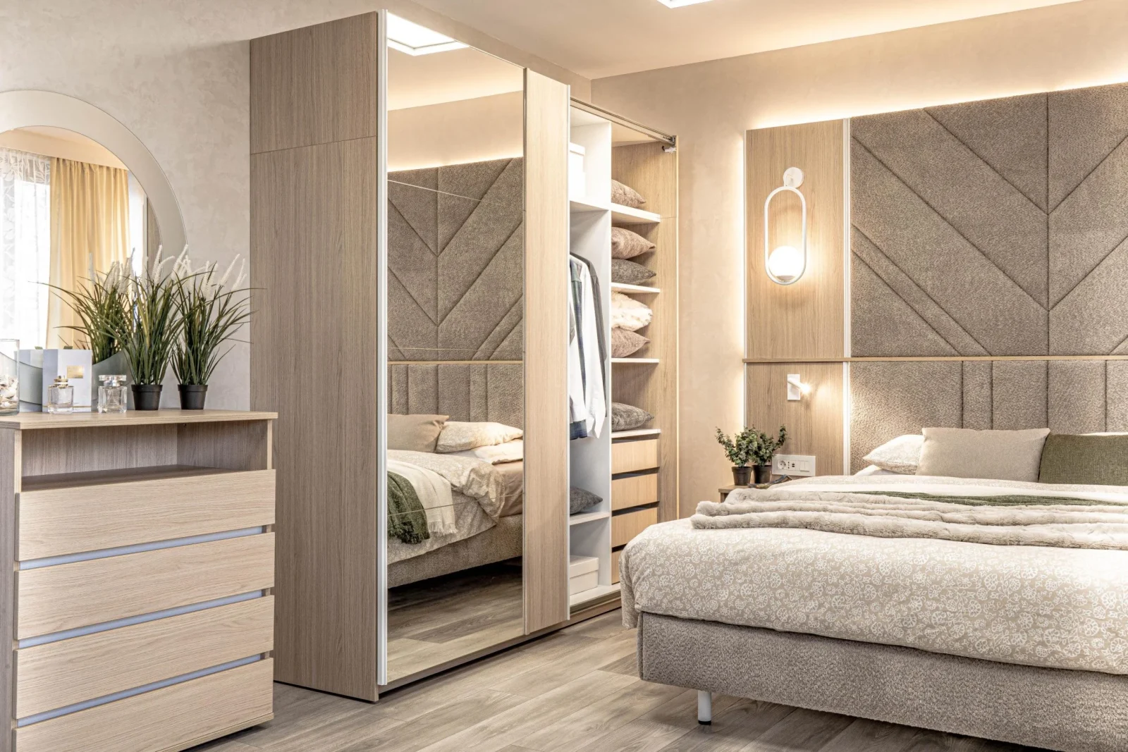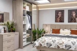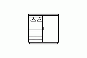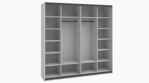 Гардероб: плъзгаща система външно водене – опция за плавно затваряне /вижте в панела/, вертикално разположени вградени алуминиеви „П“- образни кант дръжки с допълнително излят външен улей за лесно и удобно захващане, спомагащи ефективното плъзгане на системата – гарантиращи устойчивост и здравина на вратите. Покритието е прахова боя – бял цвят. Използвани са сглобки – скрит монтаж, метални рафтоносачи за стабилност на рафтовете, лост за дрехи – метален – форма – елипса – покритие – никел, цялата конструкция на гардероба е монтирана върху метални реглажни „пети“ – осигуряващи изрядна нивелация на изделието и правилната му експлоатация, вградени огледала на лява врата – опция! – 1 бр. в к-т;
