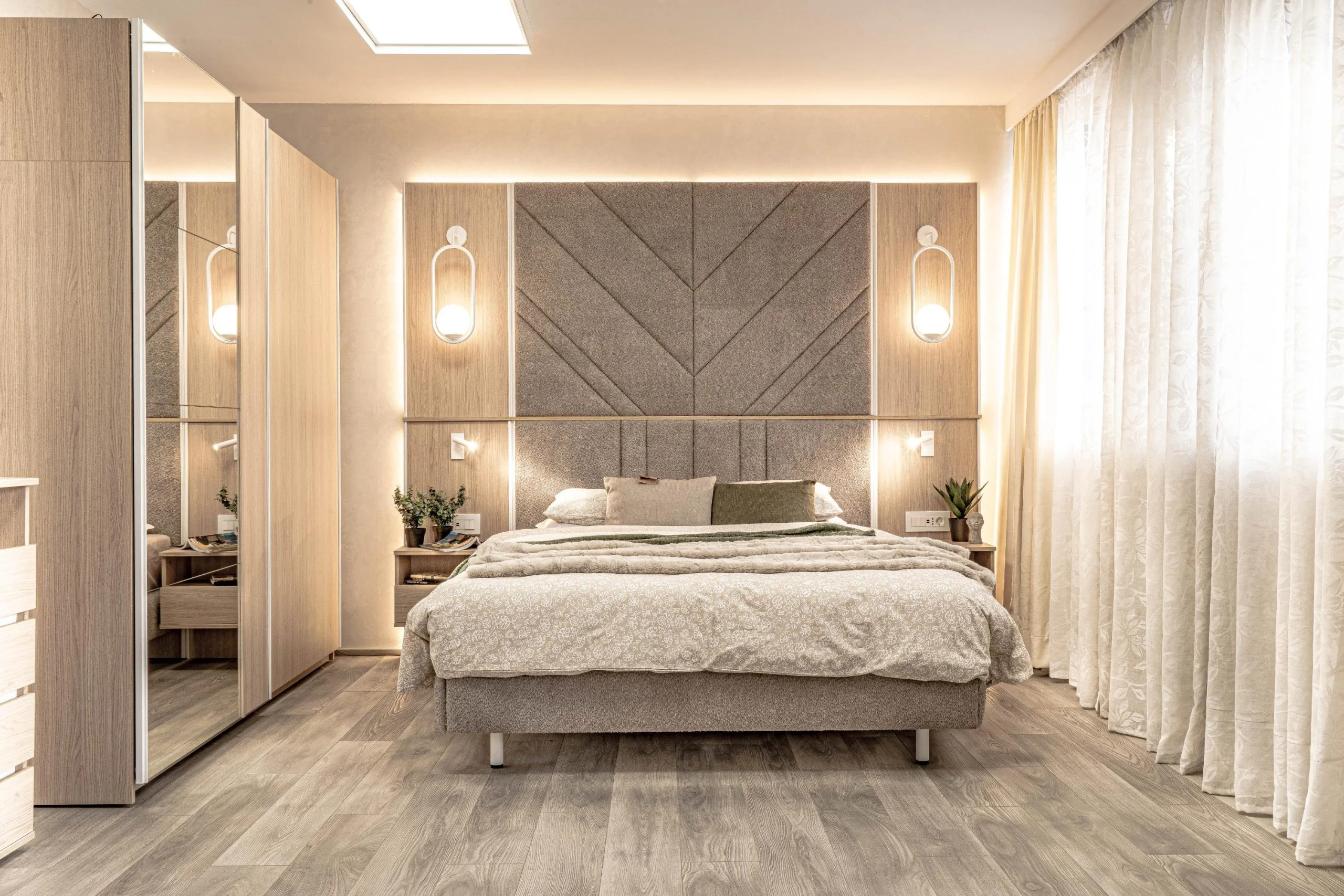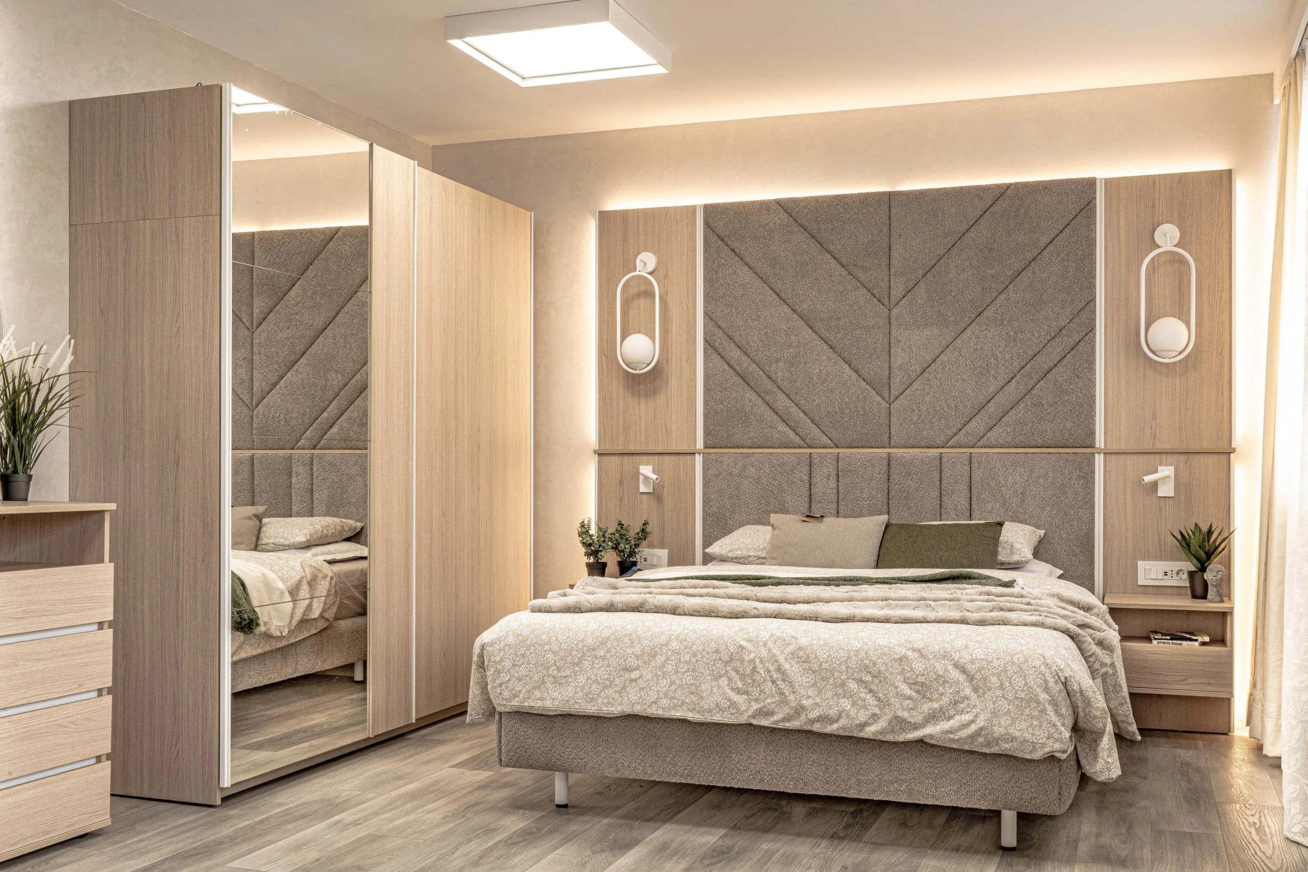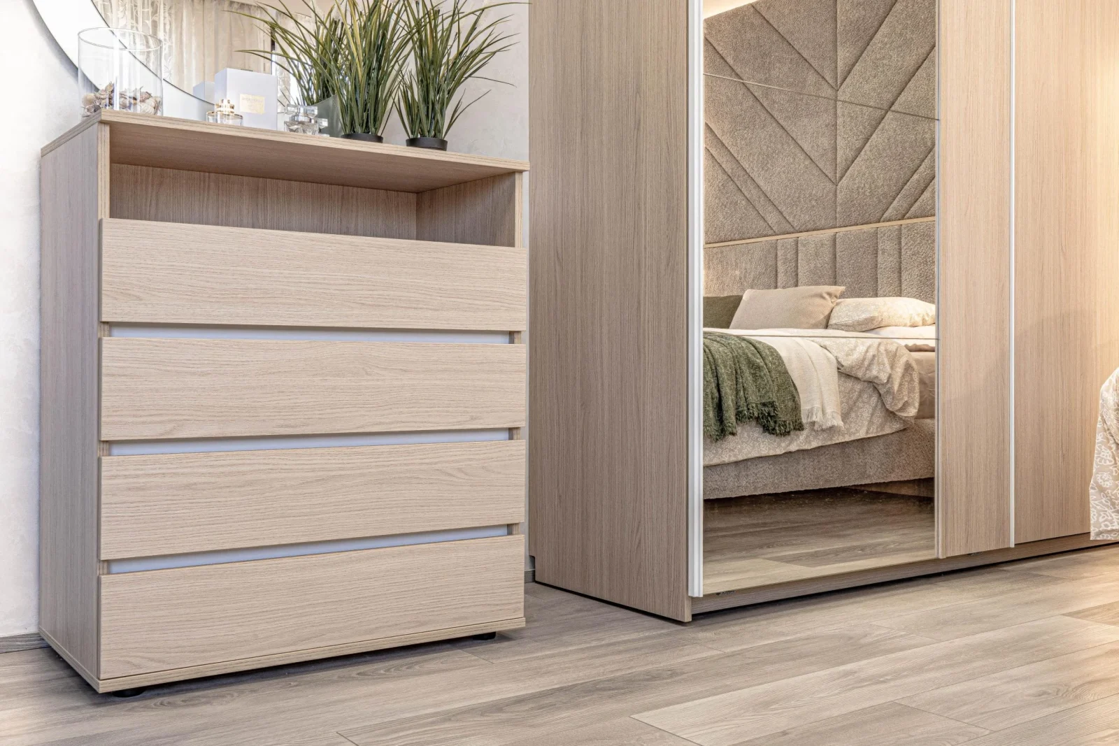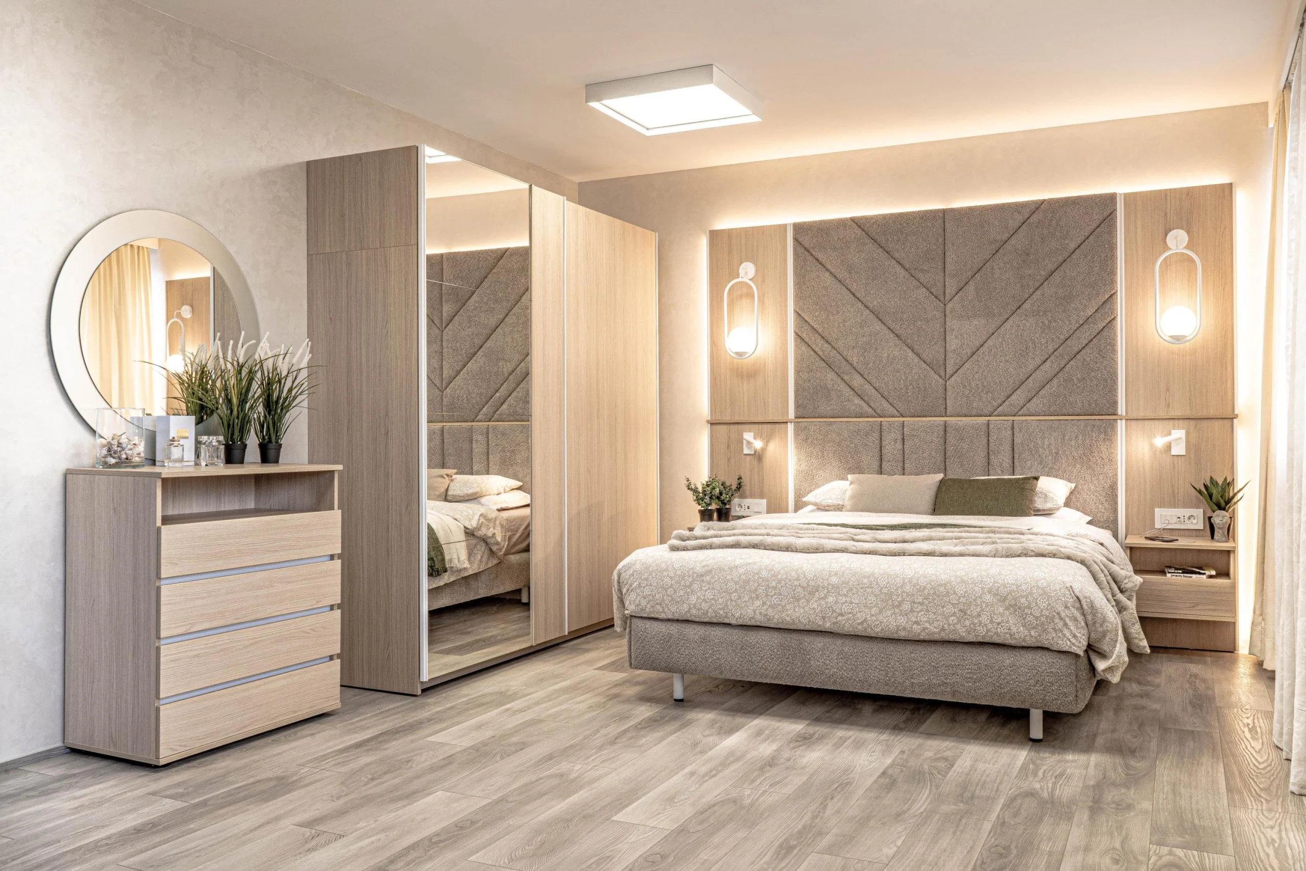 спален комплект „Кокос“ е произведен от висококачествено ламинирано ПДЧ 18 мм – дъб виченца – EGGER; кантиран с цвета си – дебелина на канта – 1 мм – фасетиран по ръбовете.