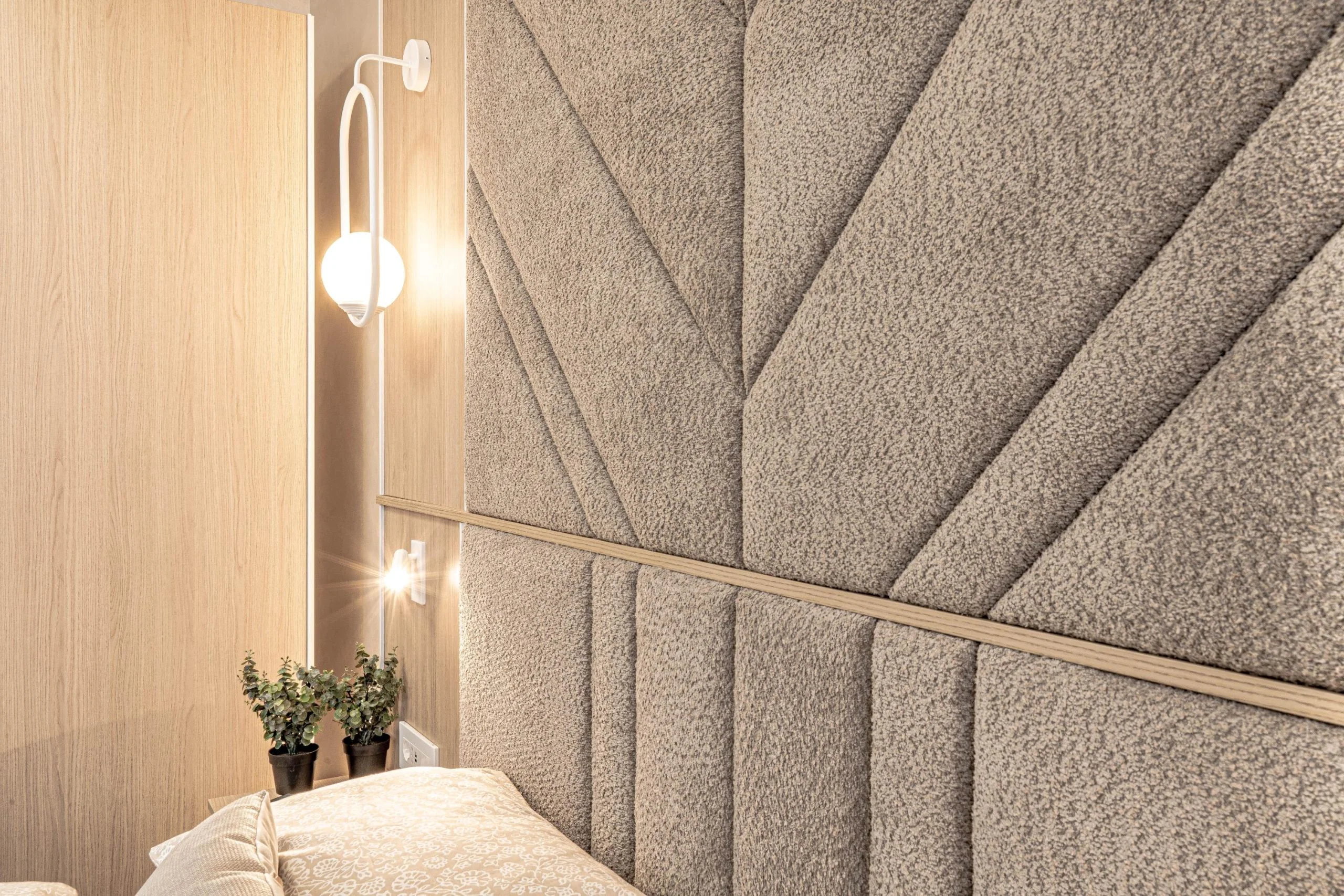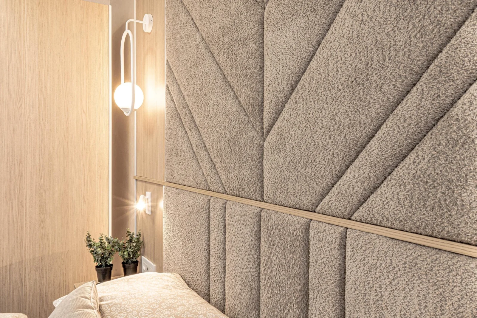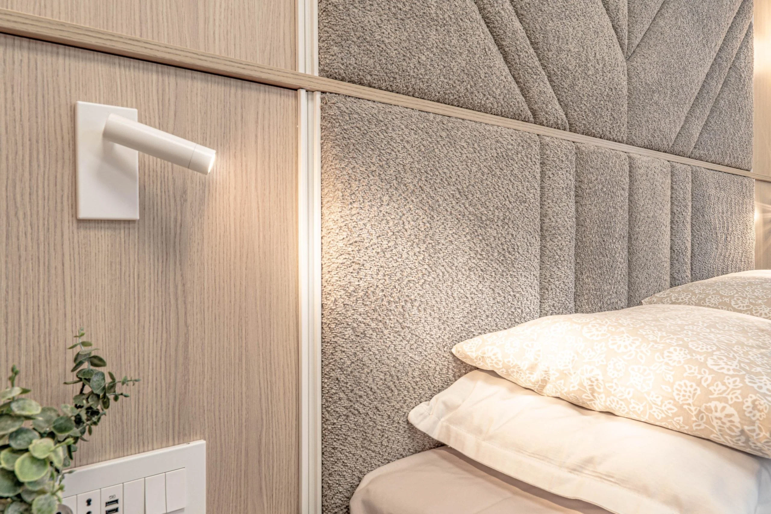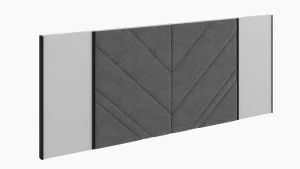 Легло: Удобна тапицирана табла вис 110 см – жакардова дамаска – кълцано букле, в левия и десния край с профил – метал – прахово боядисано в бял цвят, базата за матрак е с заработен вътрешен мост, гарантиращ прав диагонал на леглото, тапицирани царги. Всички използвани сглобки са метални – скрит монтаж, осигуряващи изряден външен вид на изделието, включени са дъно и механизъм. Така практичните крака на легло са онази част, която ще донесе необходимата височина и завършен вид. Металните крака са реглажни и позволяват перфектно нивелиране на изделието – покритие – боя – бял цвят. Опция – с допълнително заплащане – осветление;